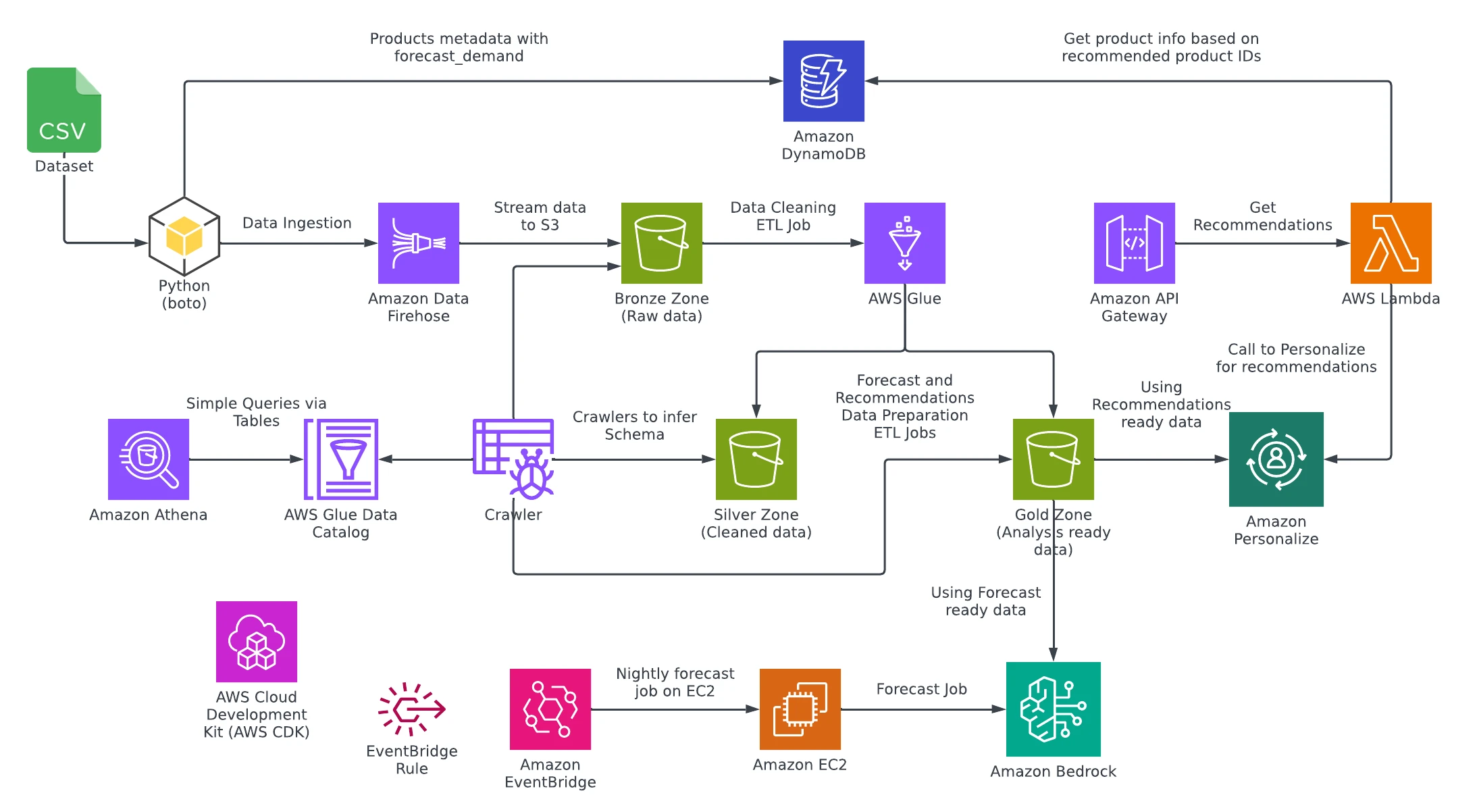 Phase Description 01-data-ingestion Stream raw sales data using Kinesis Firehose into the S3 Bronze zone 02-data-preparation Clean and structure data using AWS Glue; output to Silver & Gold zones 03-demand-forecasting-with-bedrock Use Bedrock models on EC2 to generate daily inventory forecasts 04-product-recommendations-with-personalize Recommend items via API using Amazon Personalize 05-security-and-observability Ensuring IAM roles with least-privilege, running worklodas in private subnets, VPC endpoints, monitoring for the entire system
