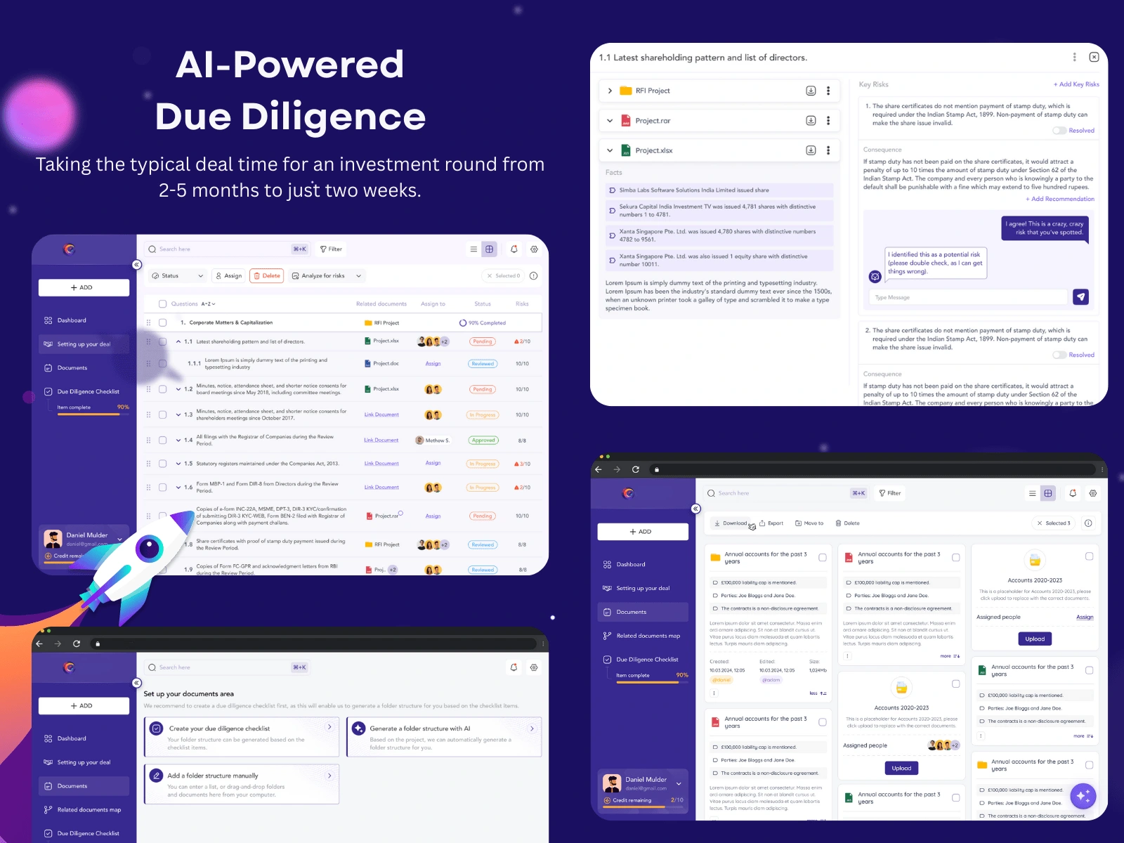 I developed the AI-Powered Due Diligence Platform from scratch, collaborating closely with the clientโs legal team to ensure the solution met their specific needs. The platform leverages a robust tech stack, including Next.js for the frontend and advanced AI models such as Claude, Bedrock, and OpenAI on the backend, complemented by a vector database for semantic document retrieval.