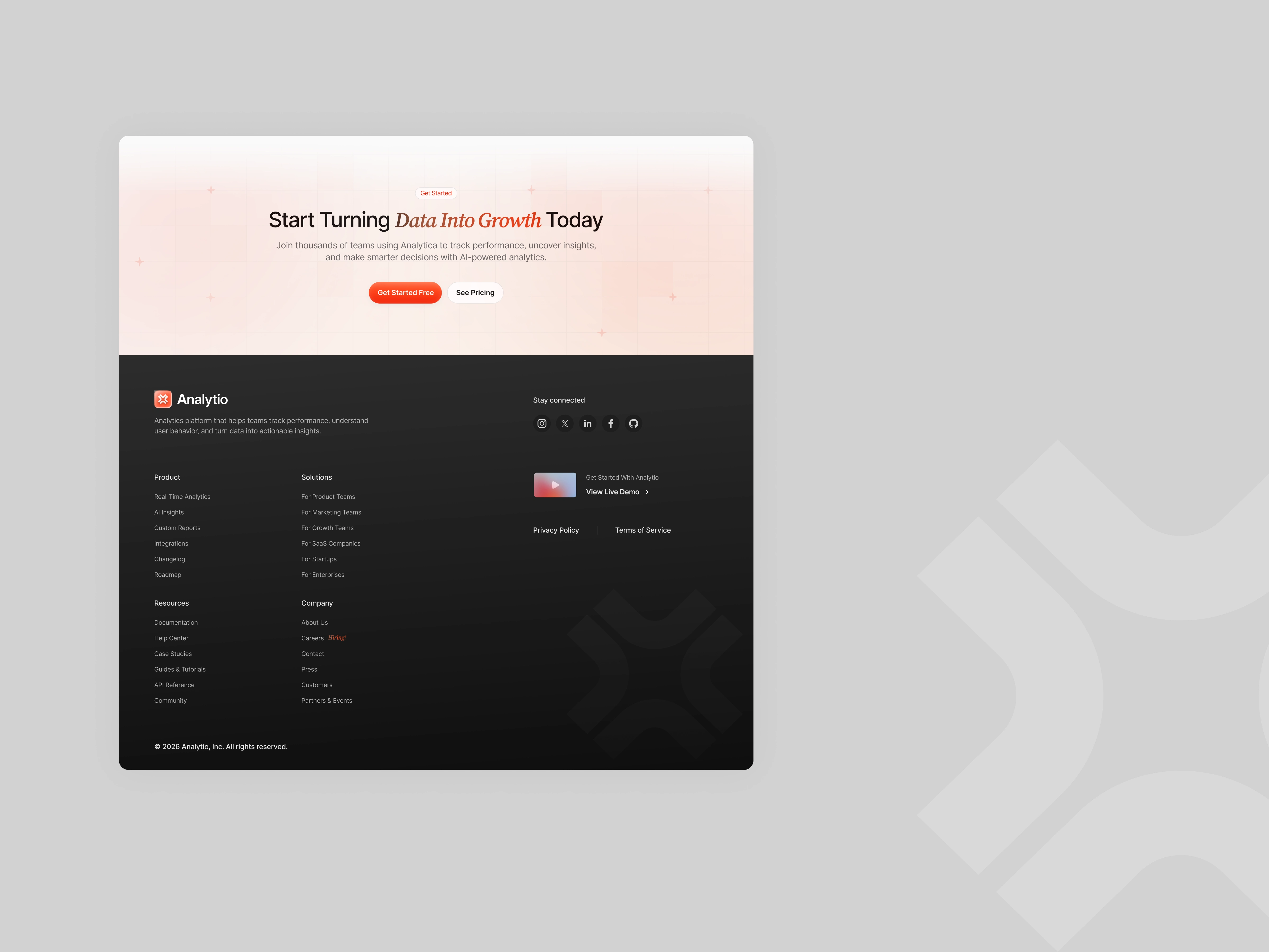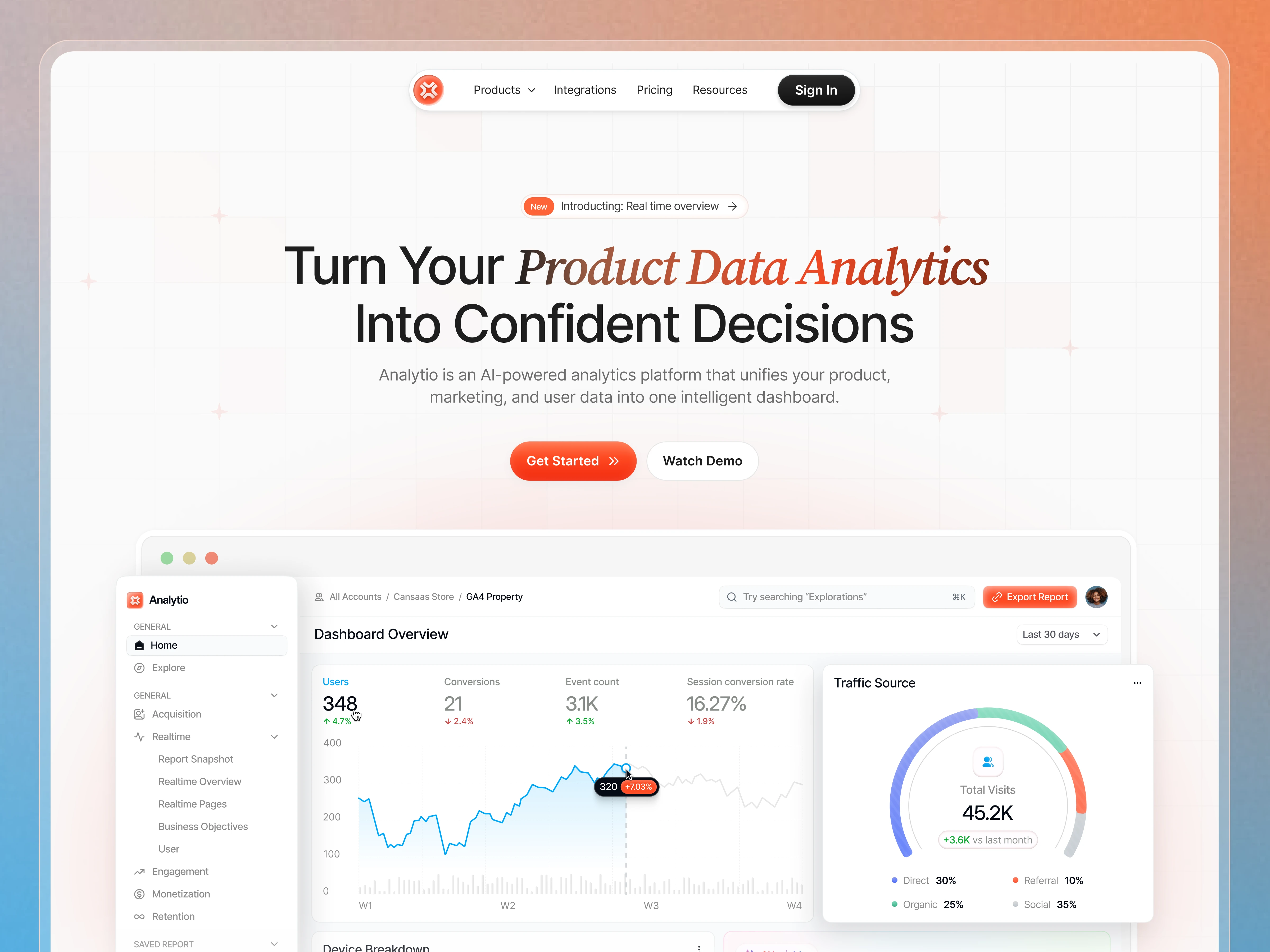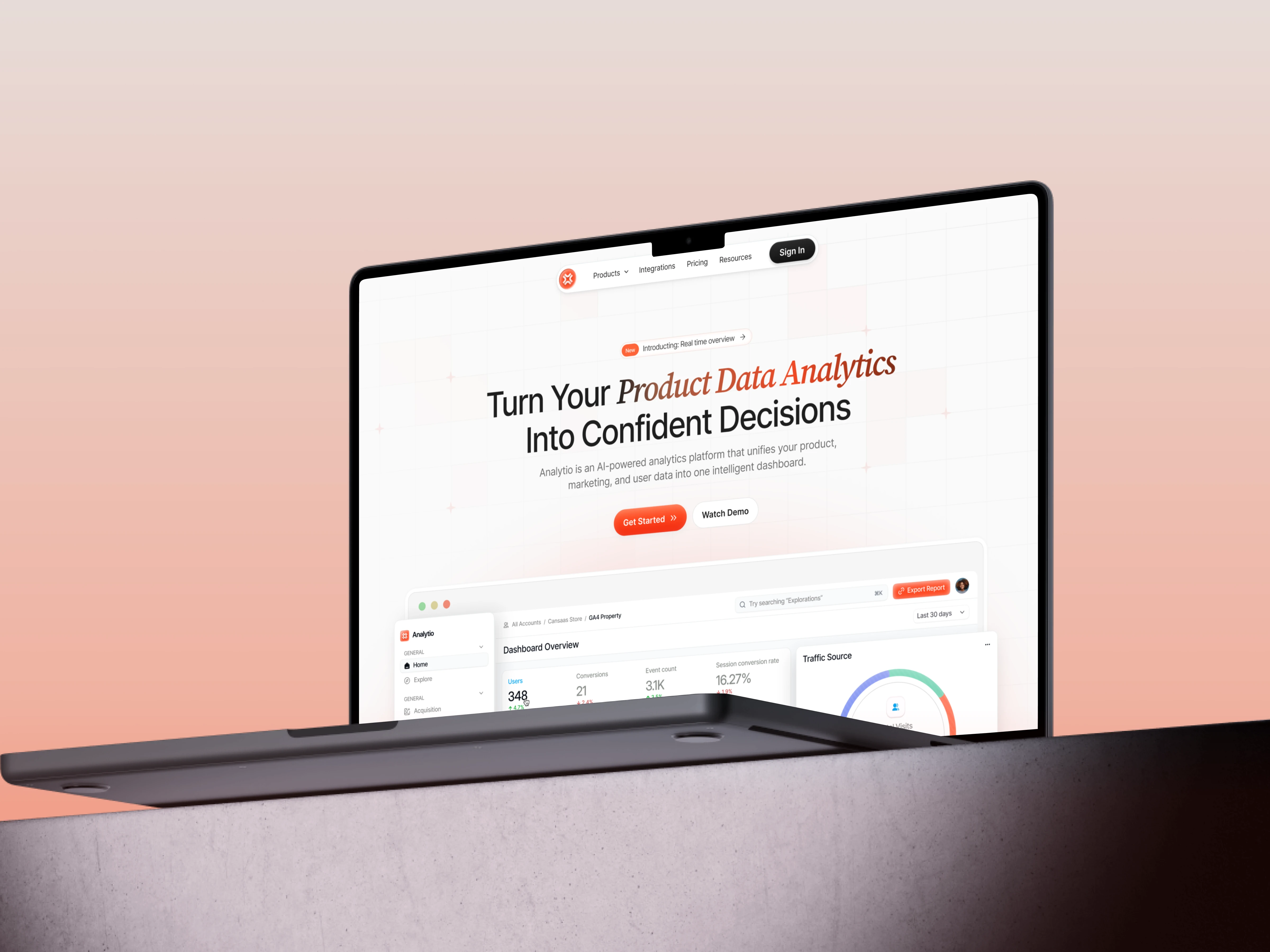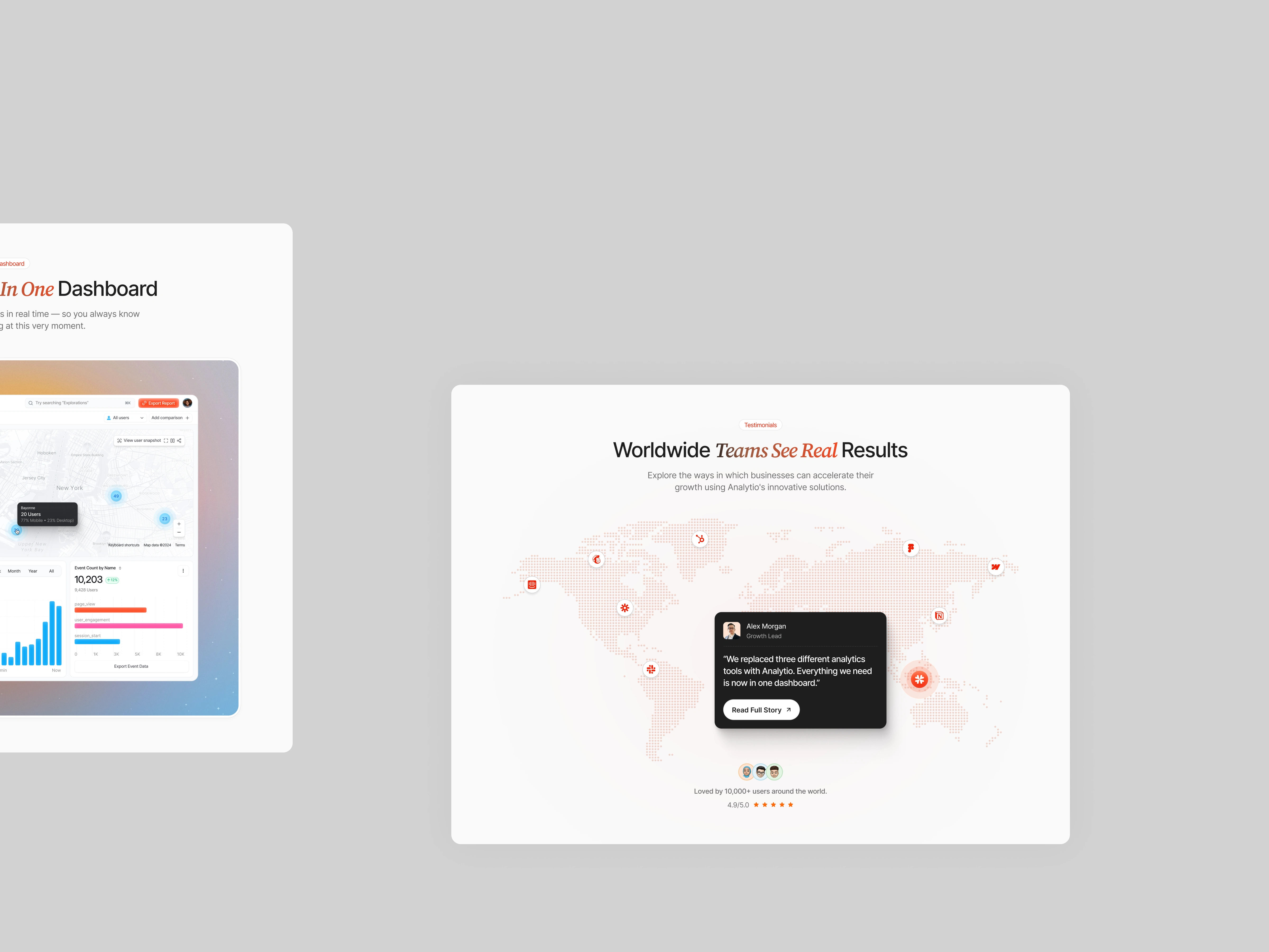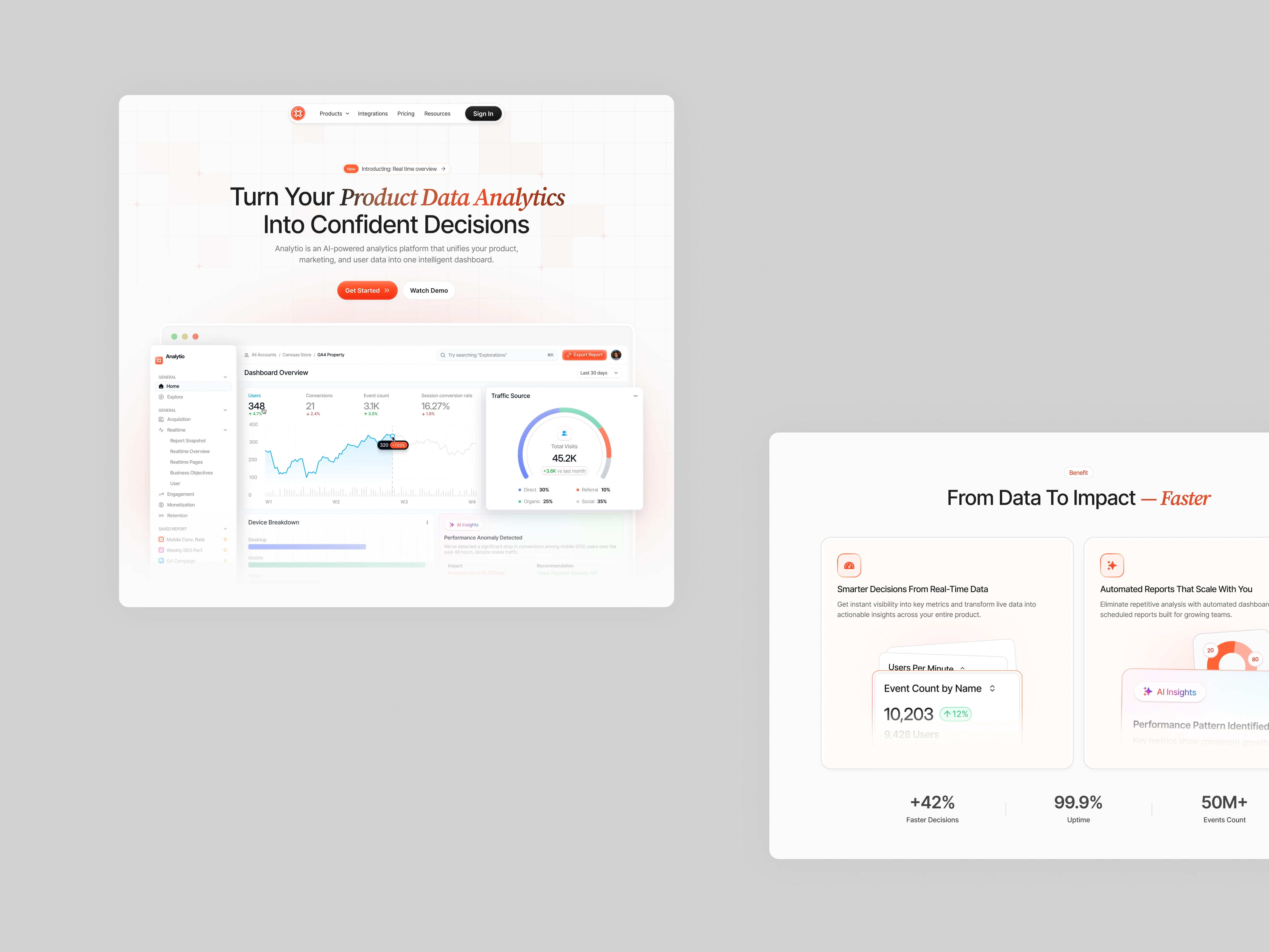 To build credibility, realistic dashboard UI previews are integrated directly into the hero and feature sections. These previews demonstrate real-time performance tracking, traffic analytics visualization, and automated reporting tools. Social proof elements, trusted brand logos, global testimonials, and performance metrics (uptime, faster decisions, events tracked) further strengthen authority.