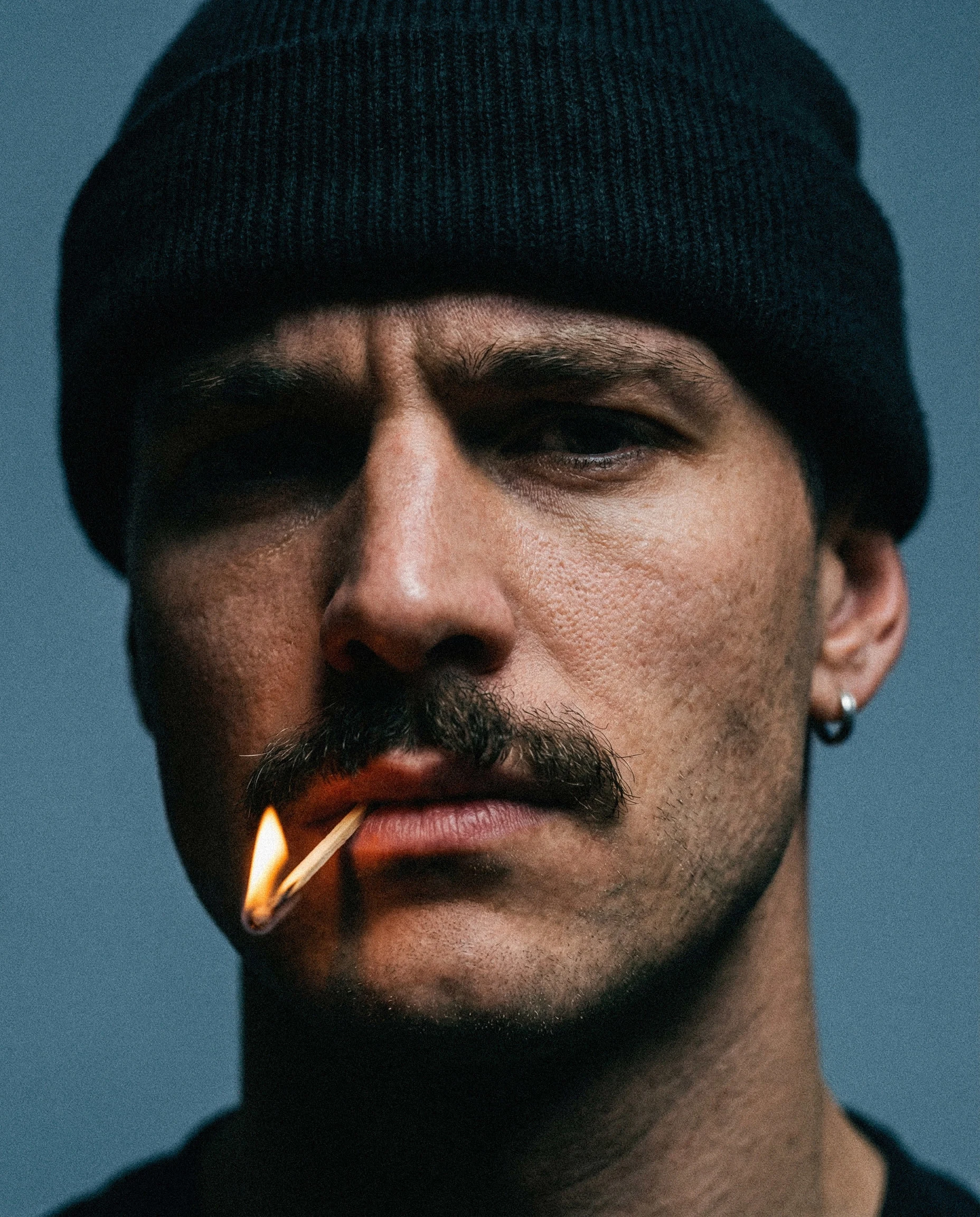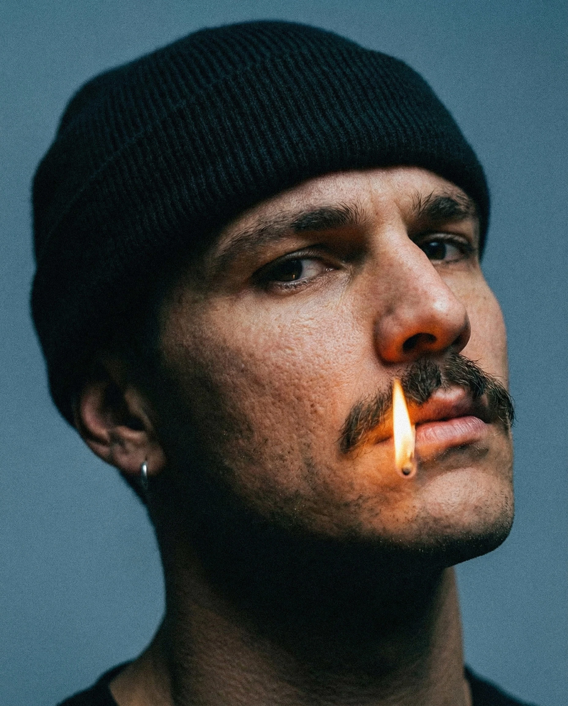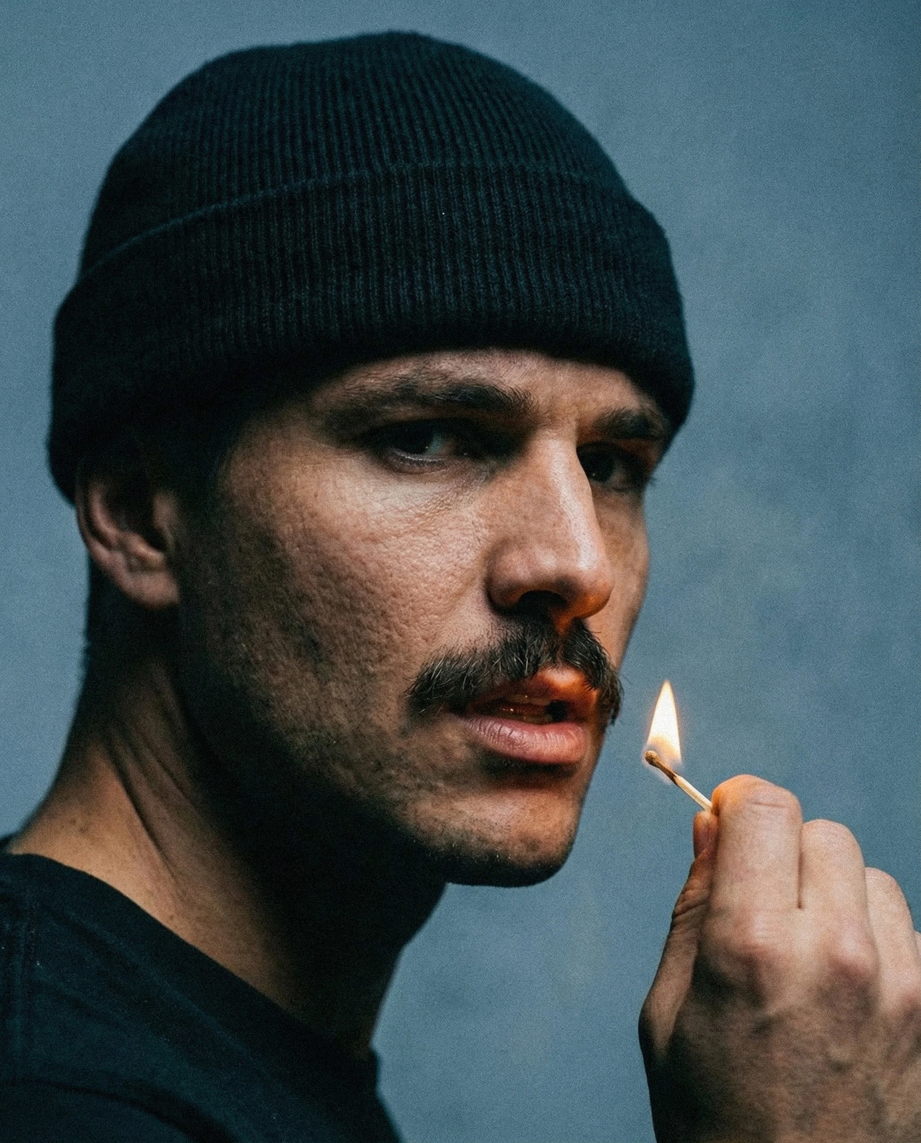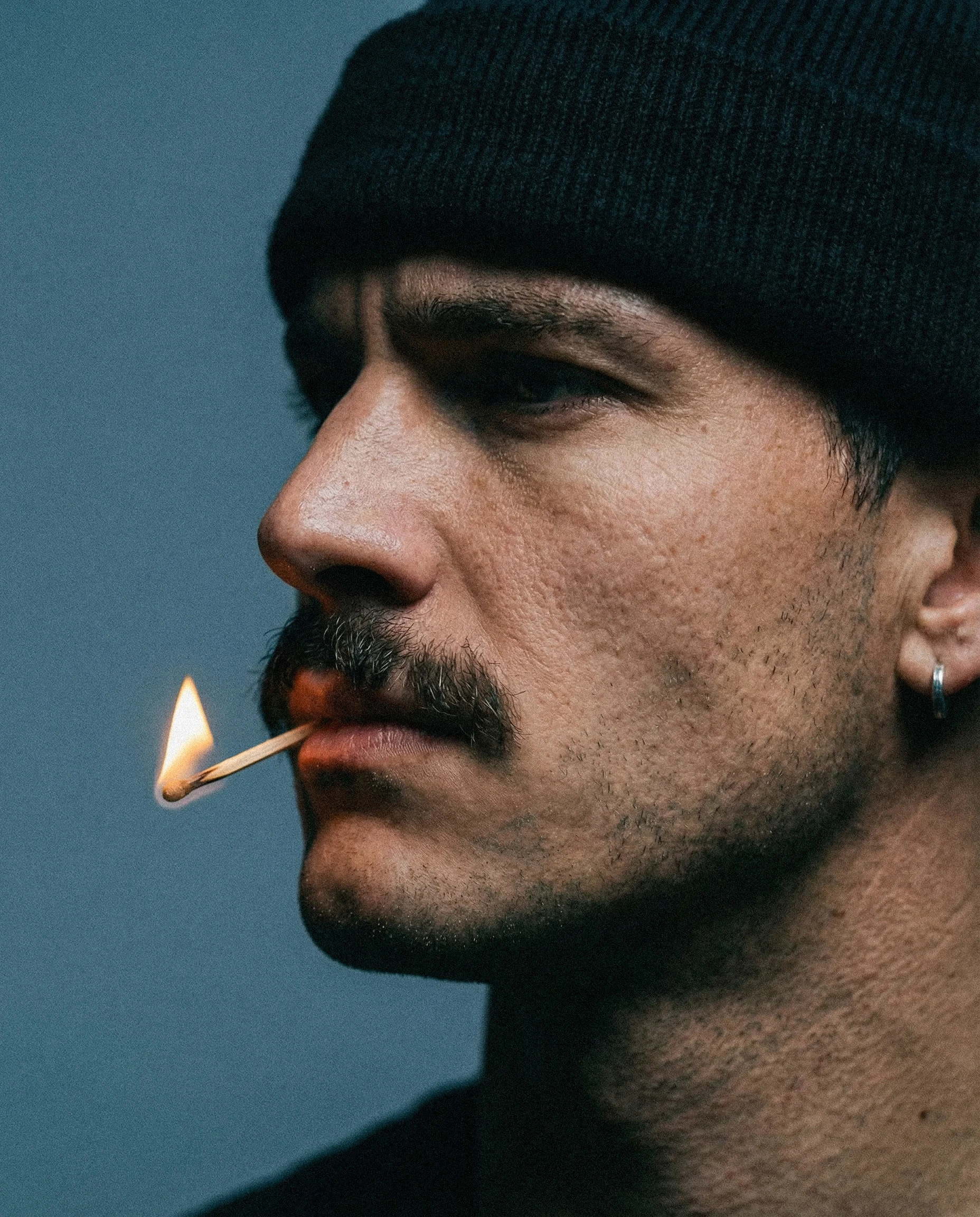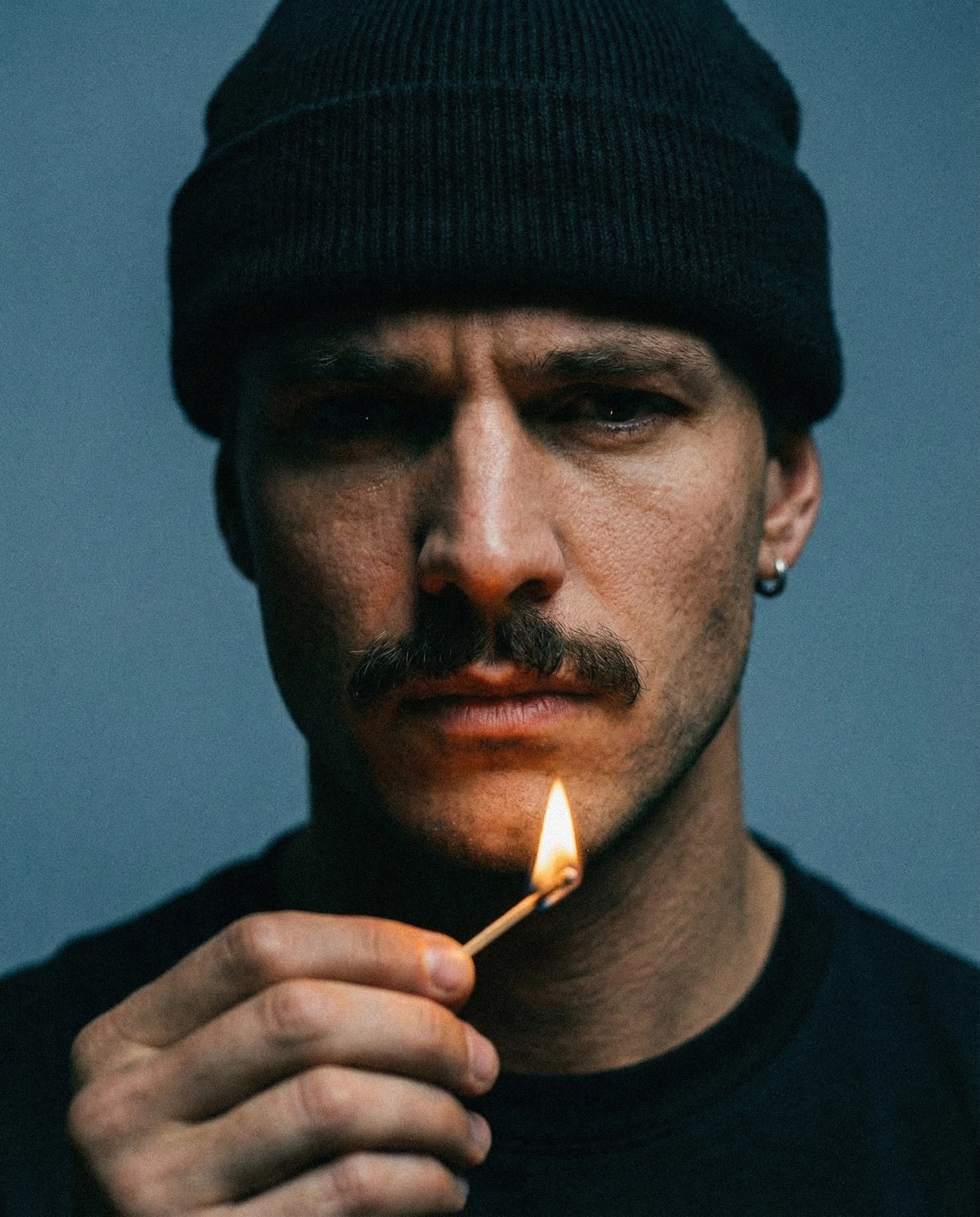 Shot against a muted, neutral background, the visuals rely on tight framing and deliberate pacing. Close-ups emphasize skin texture, facial structure, and micro-expressions, while the flame introduces contrast, warmth, and quiet danger. The match is never explosive — it exists in a suspended moment, reinforcing the idea of stillness under pressure.