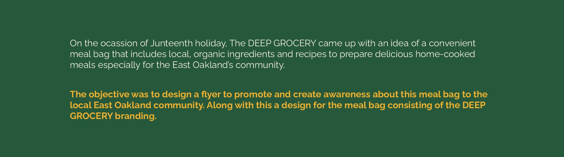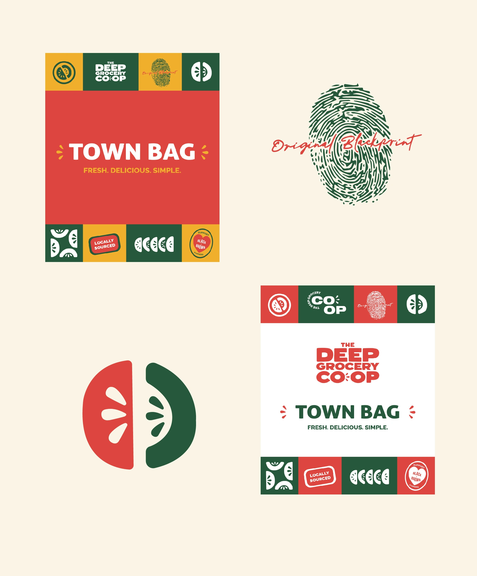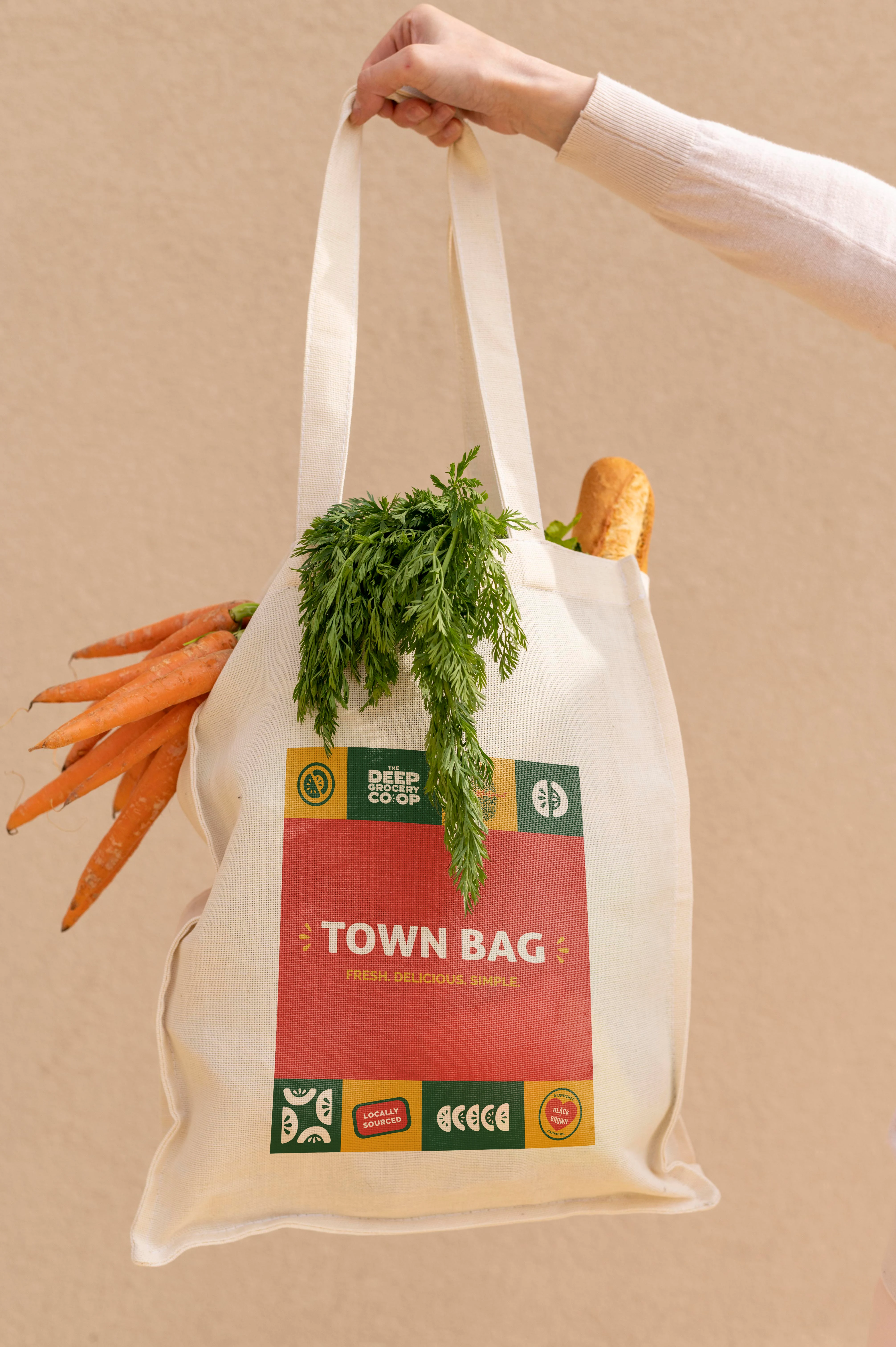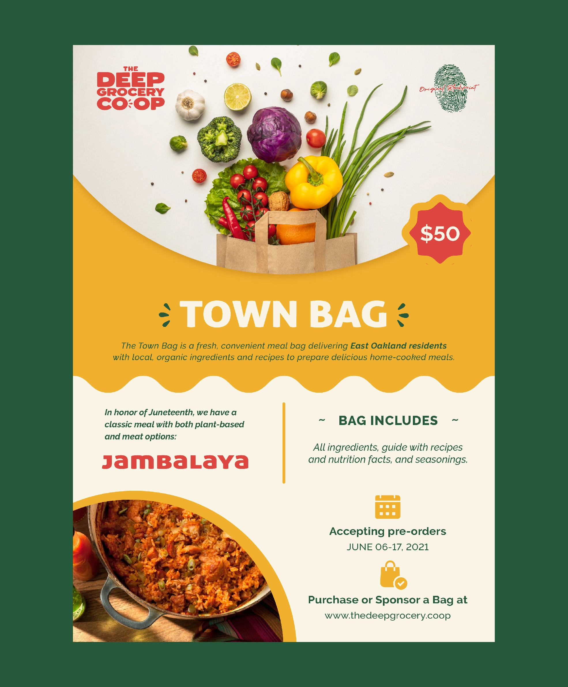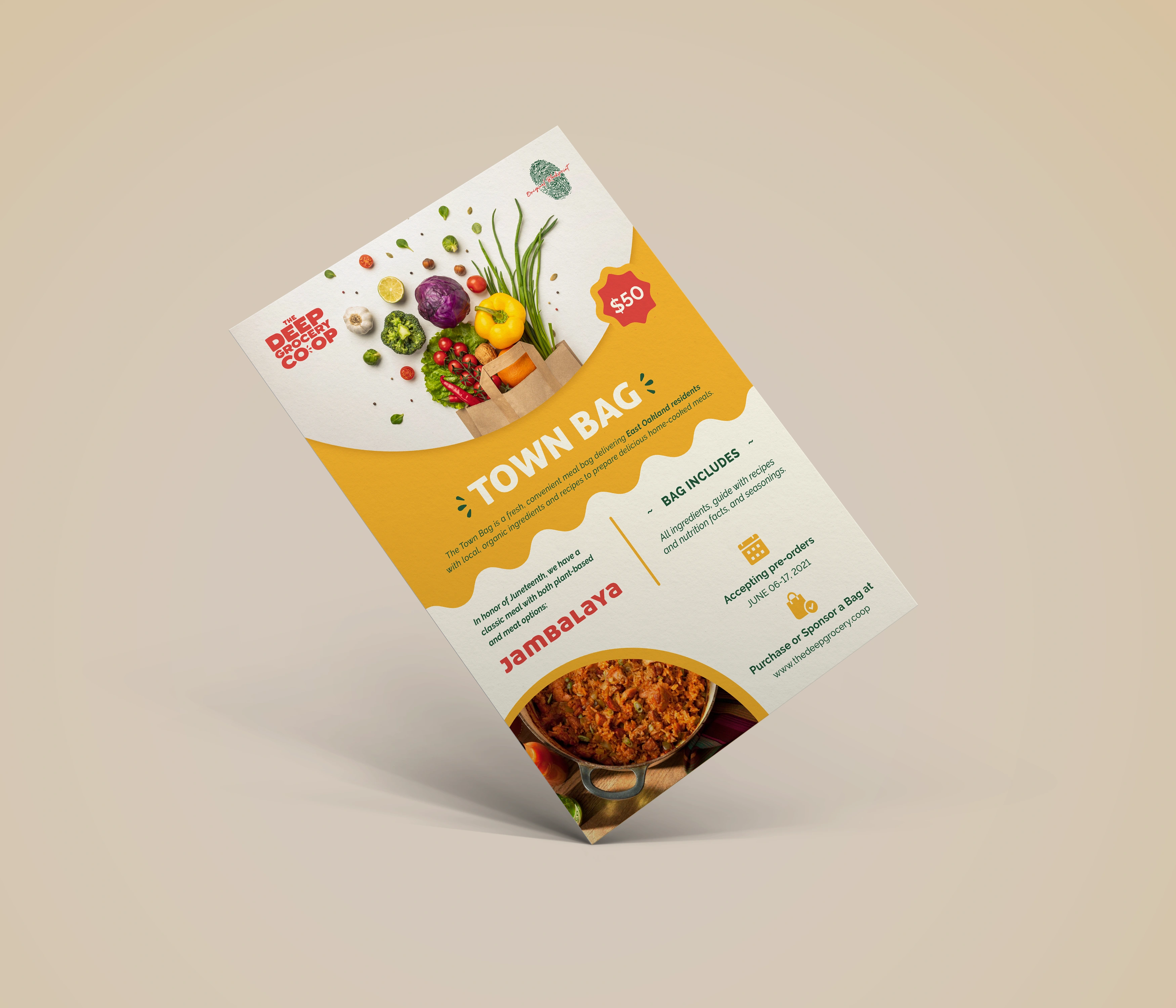 A flyer design and bag graphic for THE DEEP GROCERY to promote and create awareness about their idea of a Town Bag.