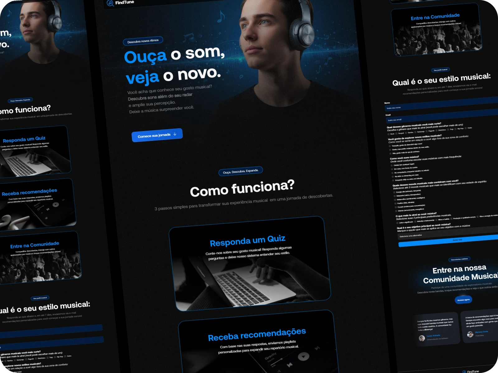FindTune is a fictional music discovery platform created during my early studies with Framer. The project explores how to blend community, music, and personalized discovery through intuitive UX and modern, responsive design.