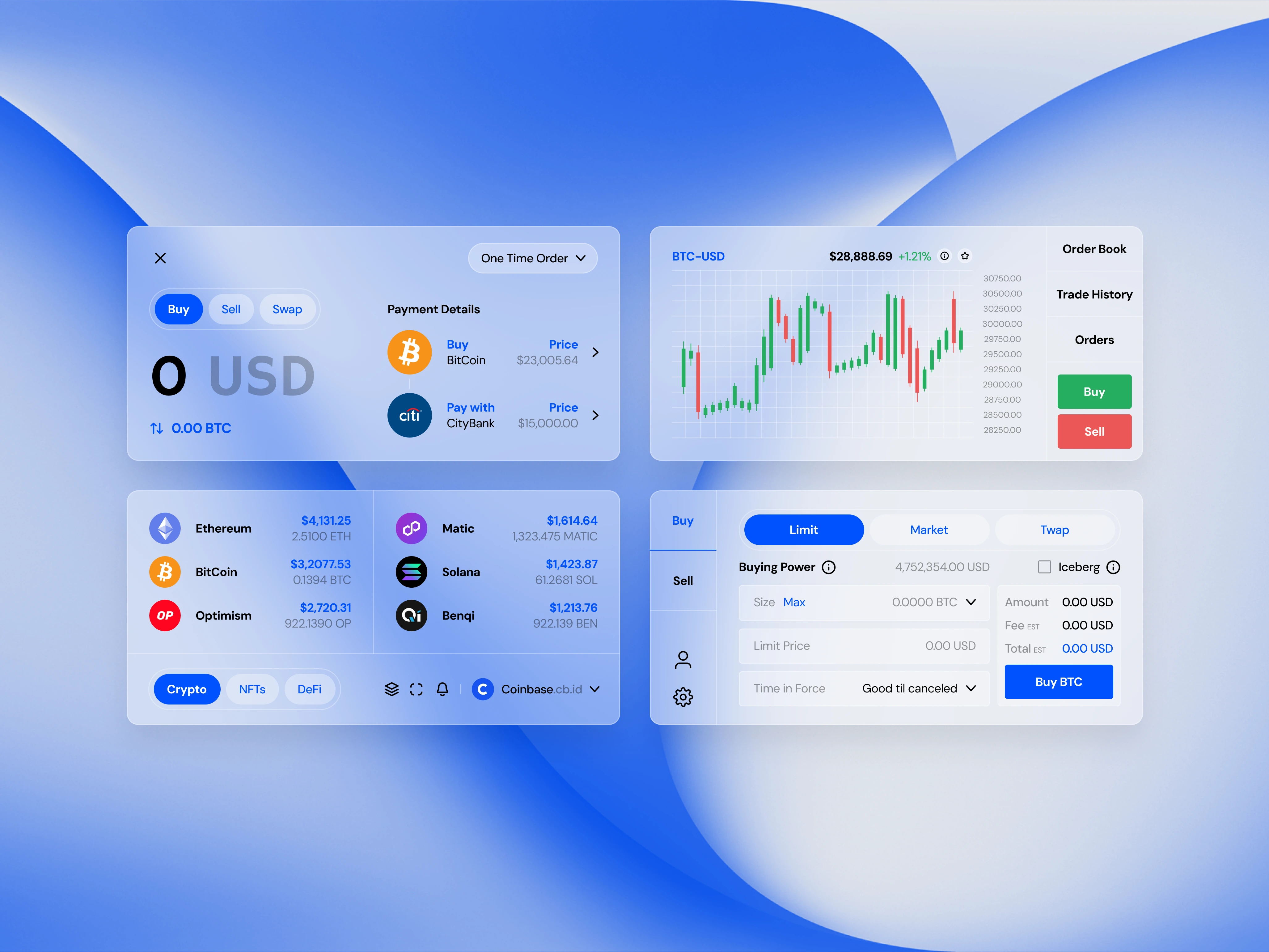 Modular "Bento" components for the Coinbase website redesign. Focus on clean data presentation, market snapshots, and intuitive trading calls-to-action.
