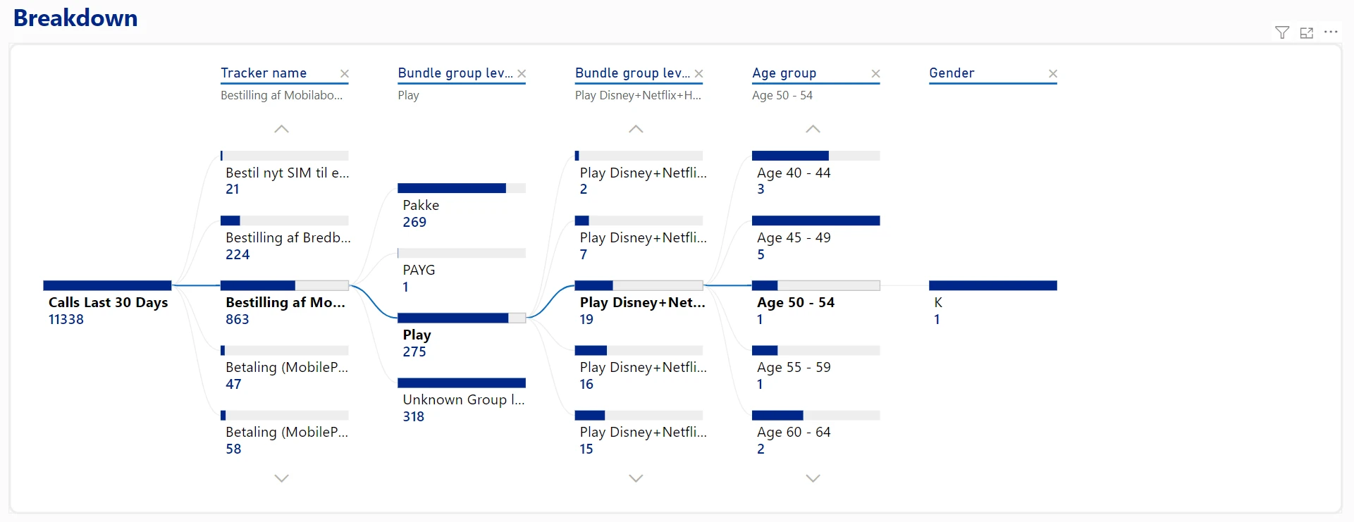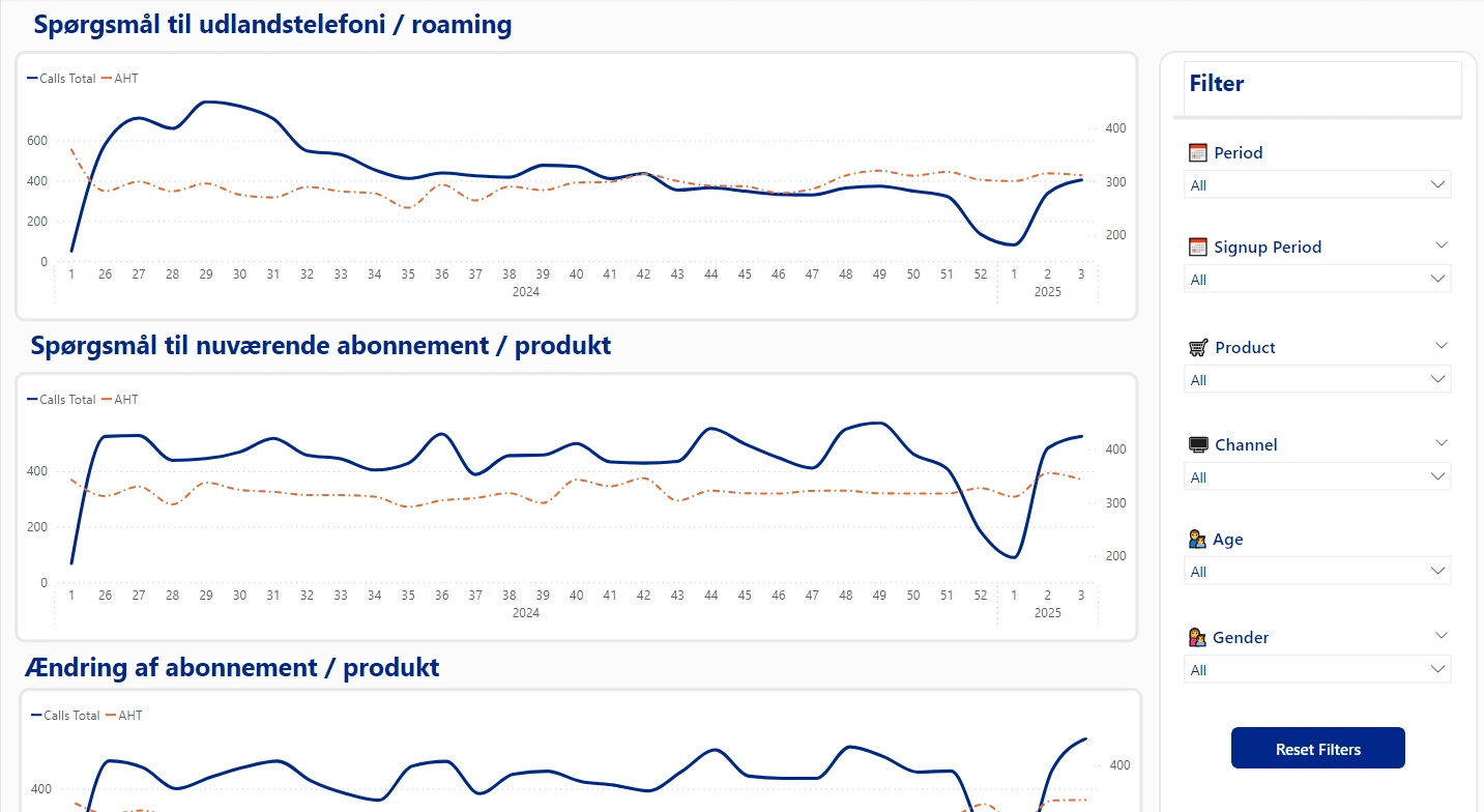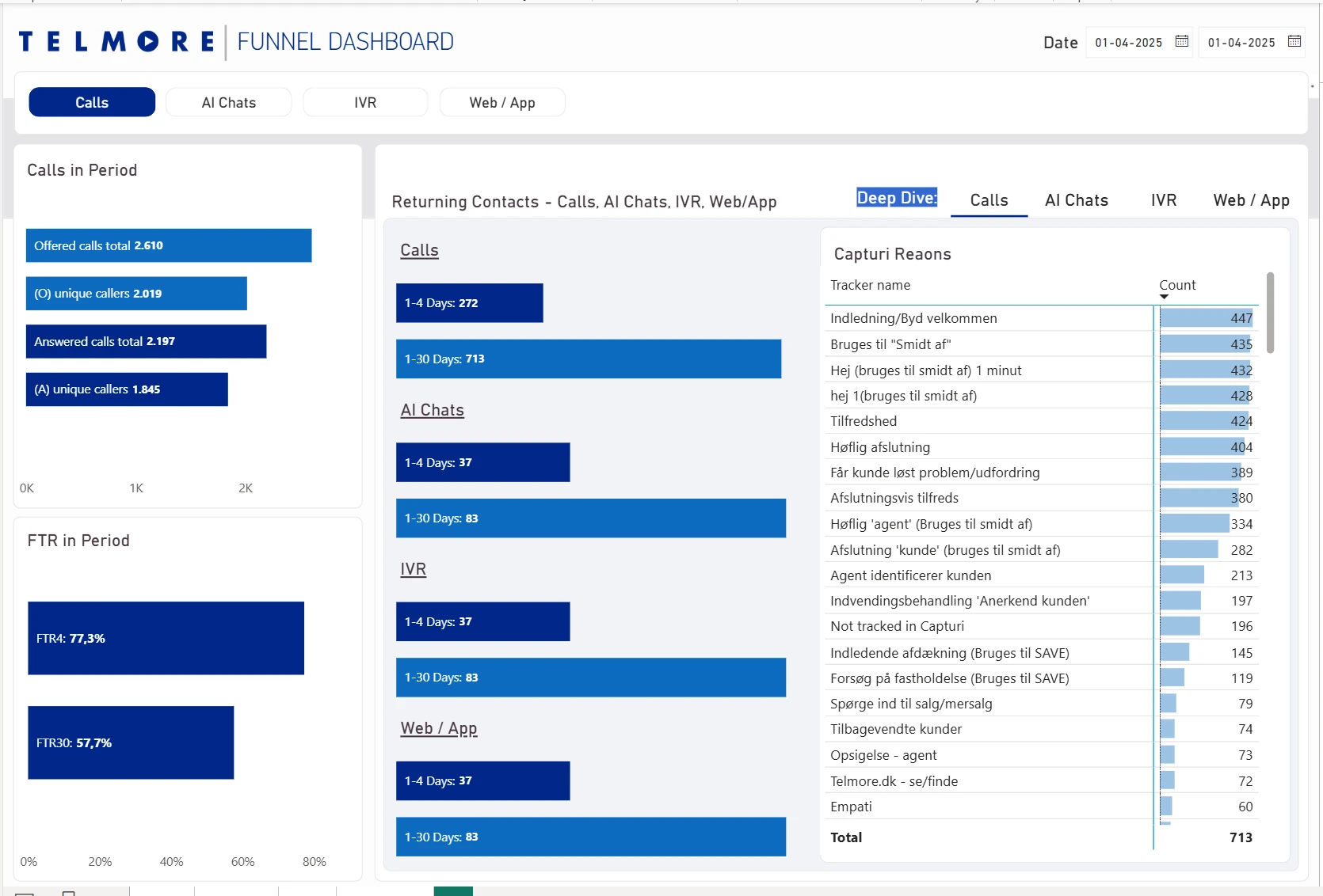 This dashboard tracks the topics that customers contact us about. Our calls are tracked using a tool called Capturi, that is an AI tool, that provide feedback on the phone calls in customer service.