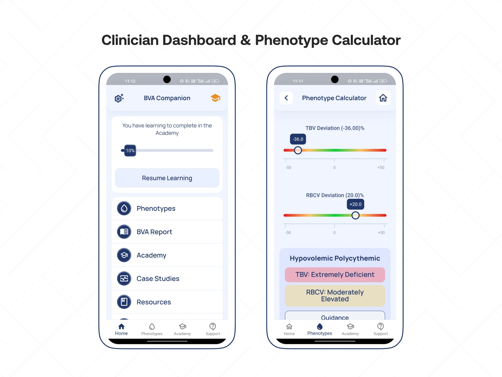 Clinicians performing Blood Volume Analysis often rely on complex reference tables, manual calculations, and external resources to interpret BVA results. This leads to slower decision-making and inconsistent phenotype determination. The client needed a streamlined, accurate, and user-friendly solution that: