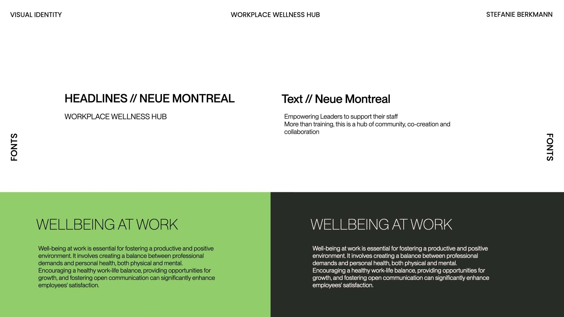 For the Workplace Wellness Hub branding, I developed a clean, modern logo that embodies the essence of well-being and professionalism. The color palette is designed to evoke calm and focus, incorporating soft, natural tones that promote a sense of relaxation and balance. The typography is a blend of approachable sans-serif fonts that communicate clarity and inclusivity, ensuring the brand feels both professional and welcoming.