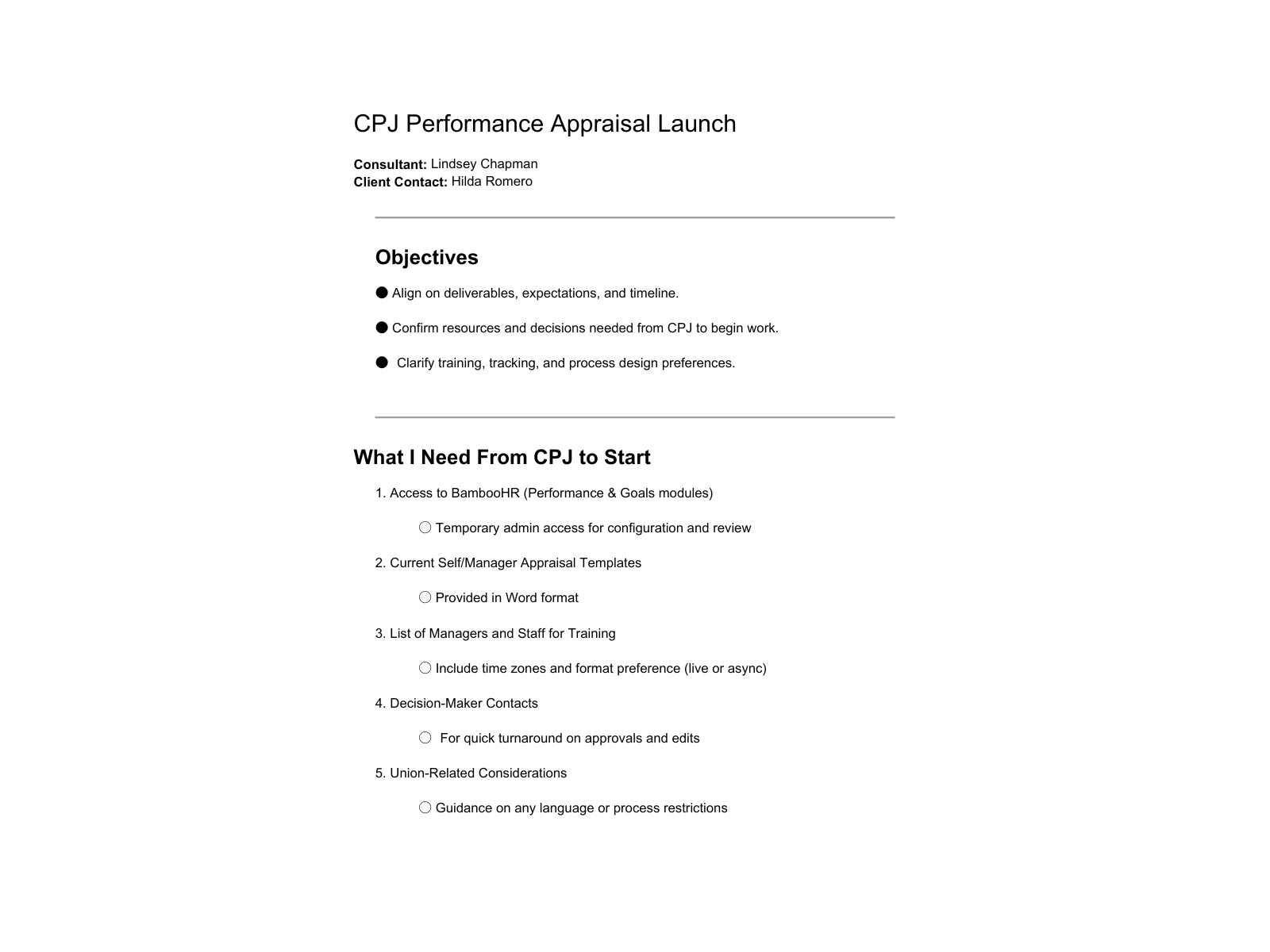 Set up or relaunch your performance appraisal process with tracking, training, timelines, and stakeholder alignment.