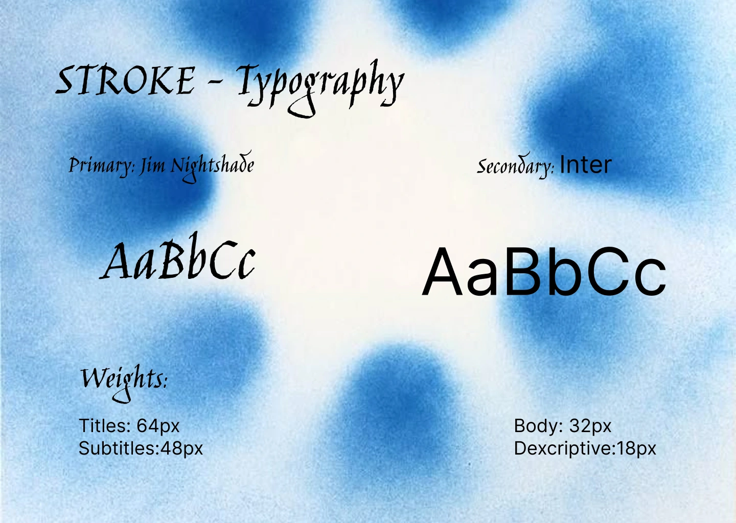Jim Nightshade is the primary voice — an italic blackletter with genuine irregularity, almost calligraphic, historically rooted but not decorative. It carries the brand's headings, titles, and all display-scale text at 64px for titles, 48px for subtitles. The choice is deliberate and unexpected: a gothic script in a contraculture streetwear context reads as anachronistic aggression. It looks like it was pulled from a medieval manuscript and stenciled onto a loading bay door. That contradiction is the point.