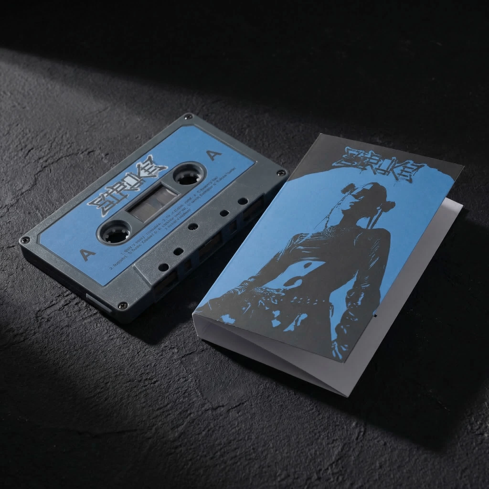 The cassette tape is the artifact that makes no functional sense and therefore makes complete sense for this brand. Steel Blue shell, the wordmark on the A-side label, a duotone figure on the inlay card. It is not a music release. It is a collectible object that communicates the brand's relationship with obsolete formats — things that were declared dead and kept being used anyway by the people who understood them.