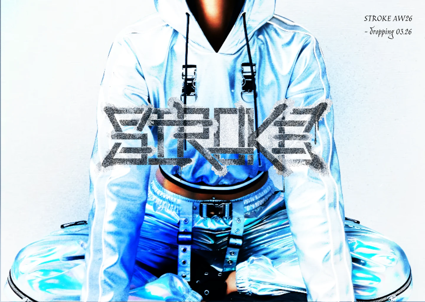 The hero is full-bleed: a high-contrast duotone figure rendered in Steel Blue on Graphite Black, with the STROKE wordmark centered at eye level, spray texture visible at full resolution, overspray halos bleeding into the background image. The subline sits below in Inter at minimum size, left-aligned, understated against the scale of everything above it.