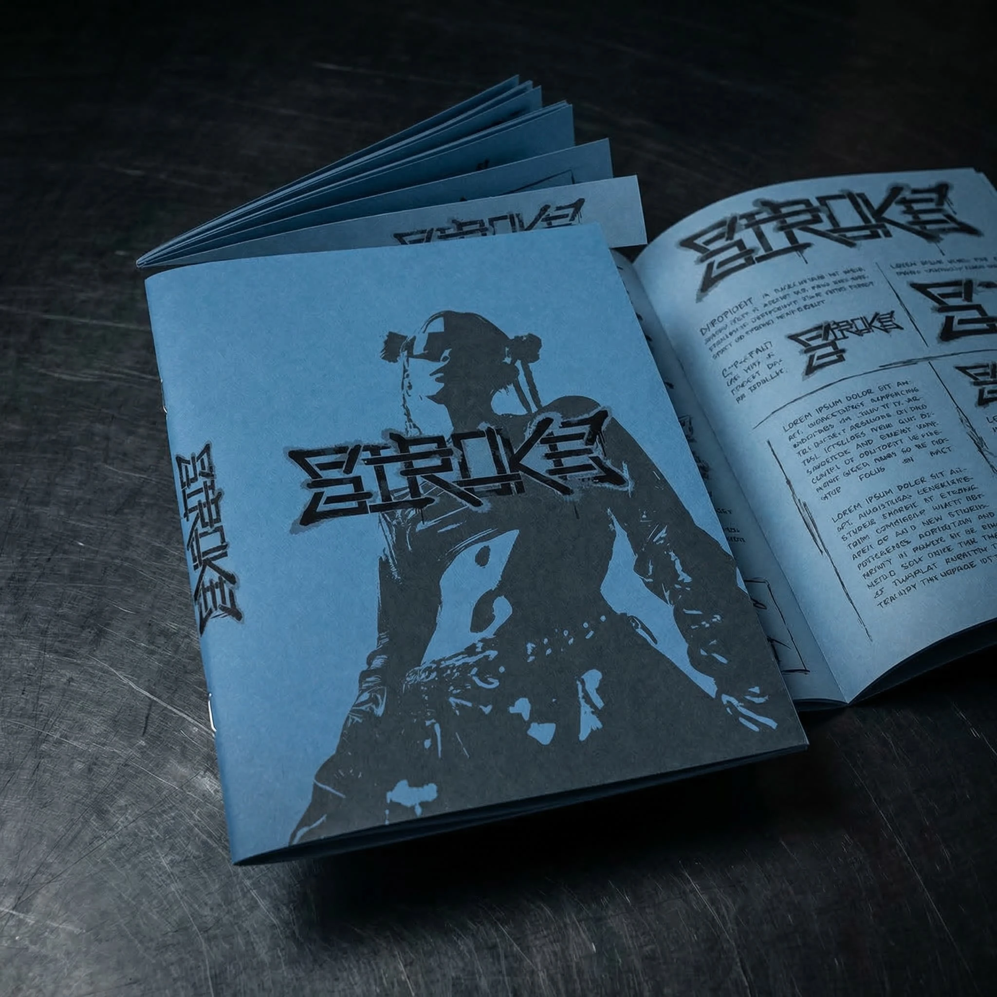 The zine is A5, saddle-stitched, Steel Blue cover stock, the logo screenprinted in Graphite Black. Inside: brand imagery, the logo system at various scales, fragments of the copywriting set in different configurations across Jim Nightshade and Inter. It is distributed physically only, at specific locations, with no announcement of where or when.