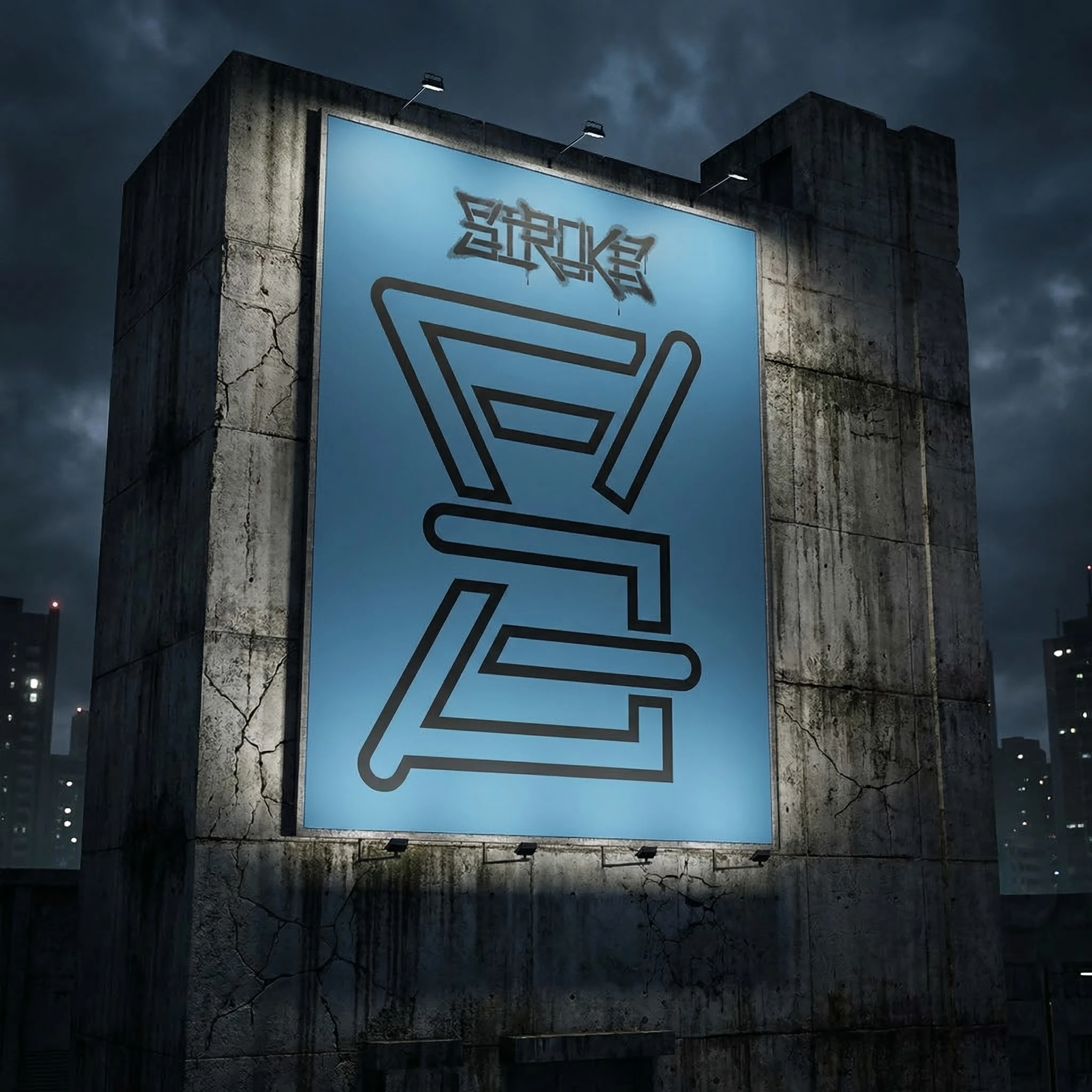 The billboard shows the S monogram enlarged to architectural scale on a backlit Steel Blue panel mounted on a brutalist concrete structure under storm clouds. The brand name sprayed above it in small scale in Jim Nightshade, as if someone tagged the billboard after it was installed. As if the brand arrived before the advertising did.