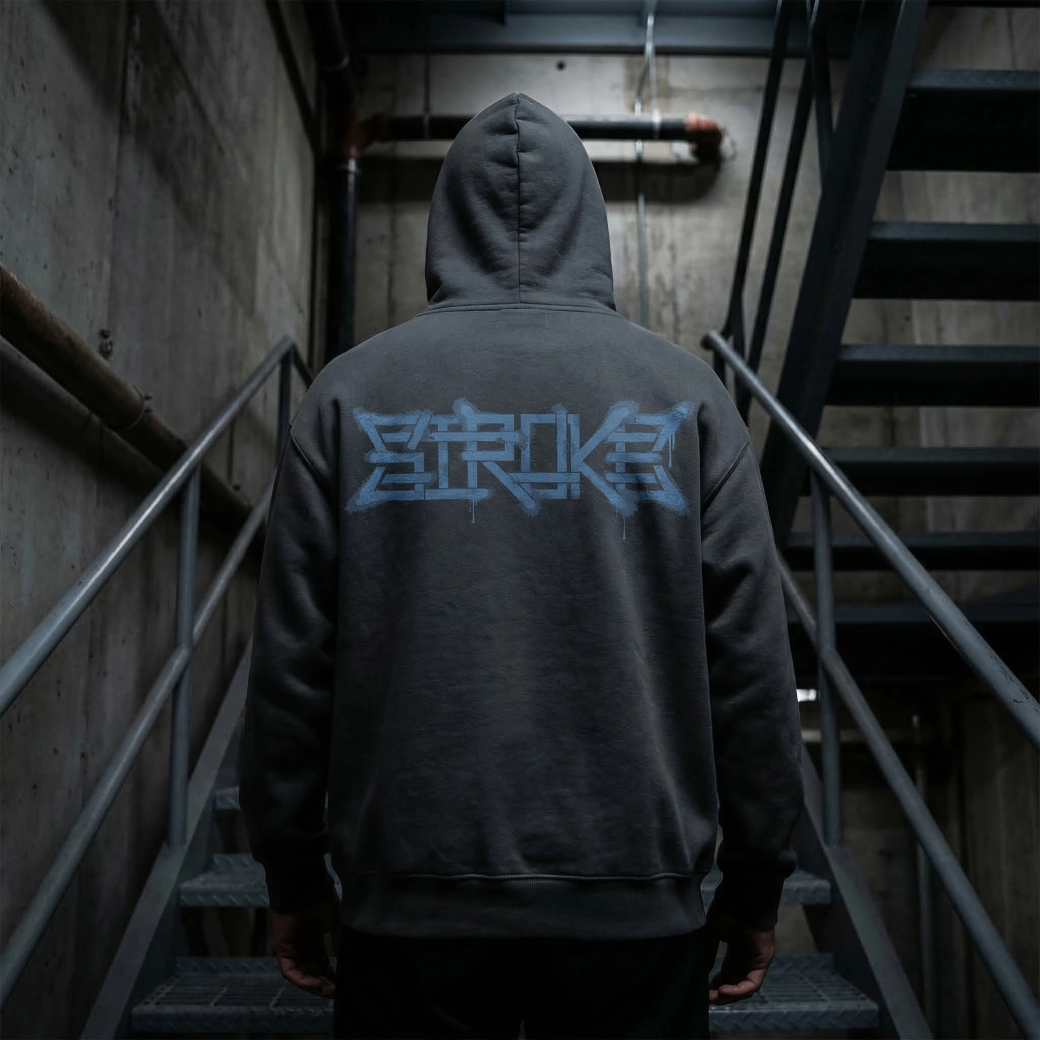 The hoodie is the primary object. 500gsm stonewashed cotton, charcoal, the STROKE wordmark sprayed across the full back panel in Steel Blue — not printed, stenciled. The spray bleeds into the fabric weave at the letter edges. No two are identical. Shot from behind in a raw concrete stairwell, single overhead source, the figure walking away. The brand never shows a face.