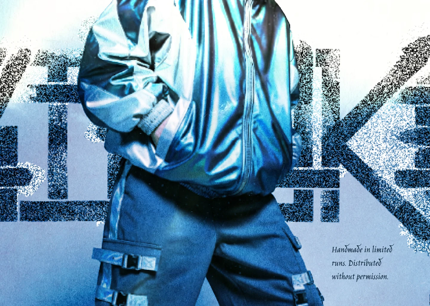 The wheat-paste poster is A0 newsprint, two colors, the duotone figure and the wordmark. It exists in the street first, in the lookbook second. The photograph of it peeling off a crumbling wall in late afternoon light is the most honest image in the entire project.