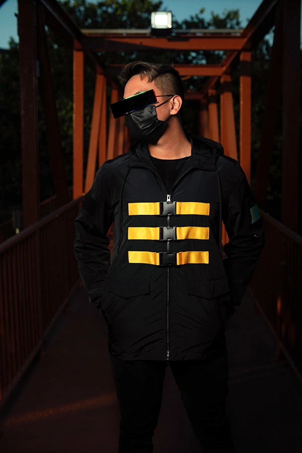 The Compliance Jacket was developed as the central piece of the collection, featuring graphic placements and details aligned with VHS-era distortions and the project's emotional themes.