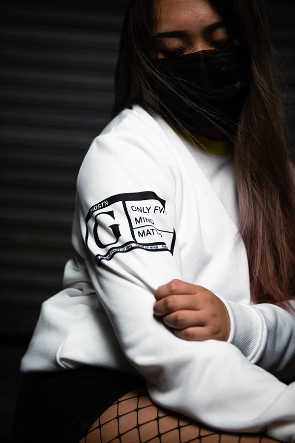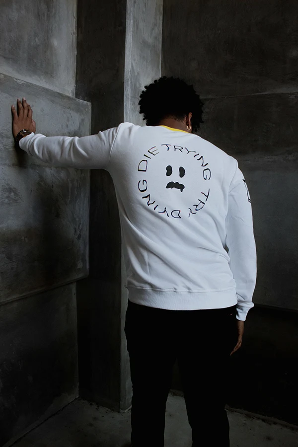 The Die Trying Sweater was designed as the contrasting piece to the two black pieces. It's both softer in color and in texture than the other two while still remaining ominously positive messages about mental health.