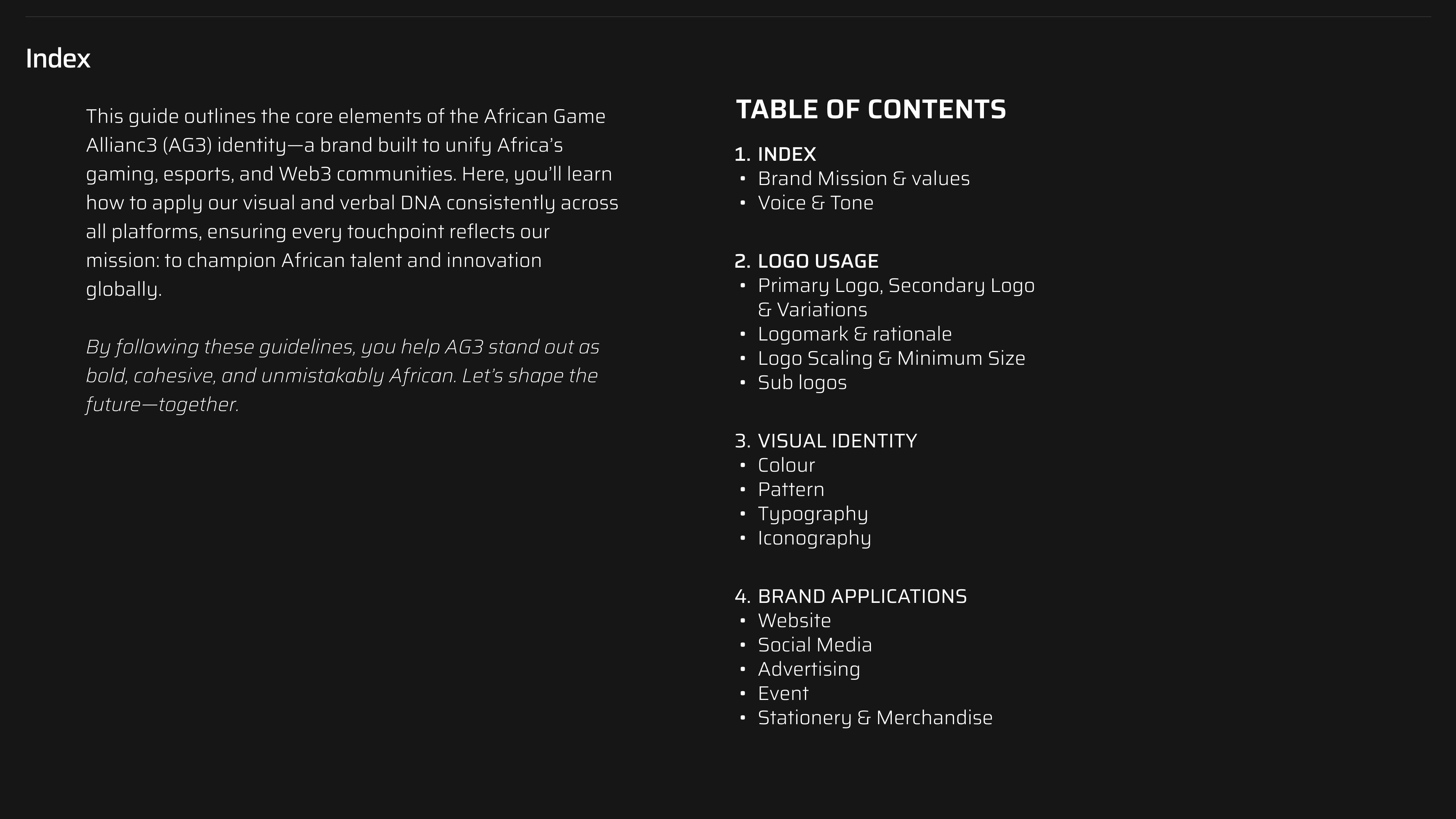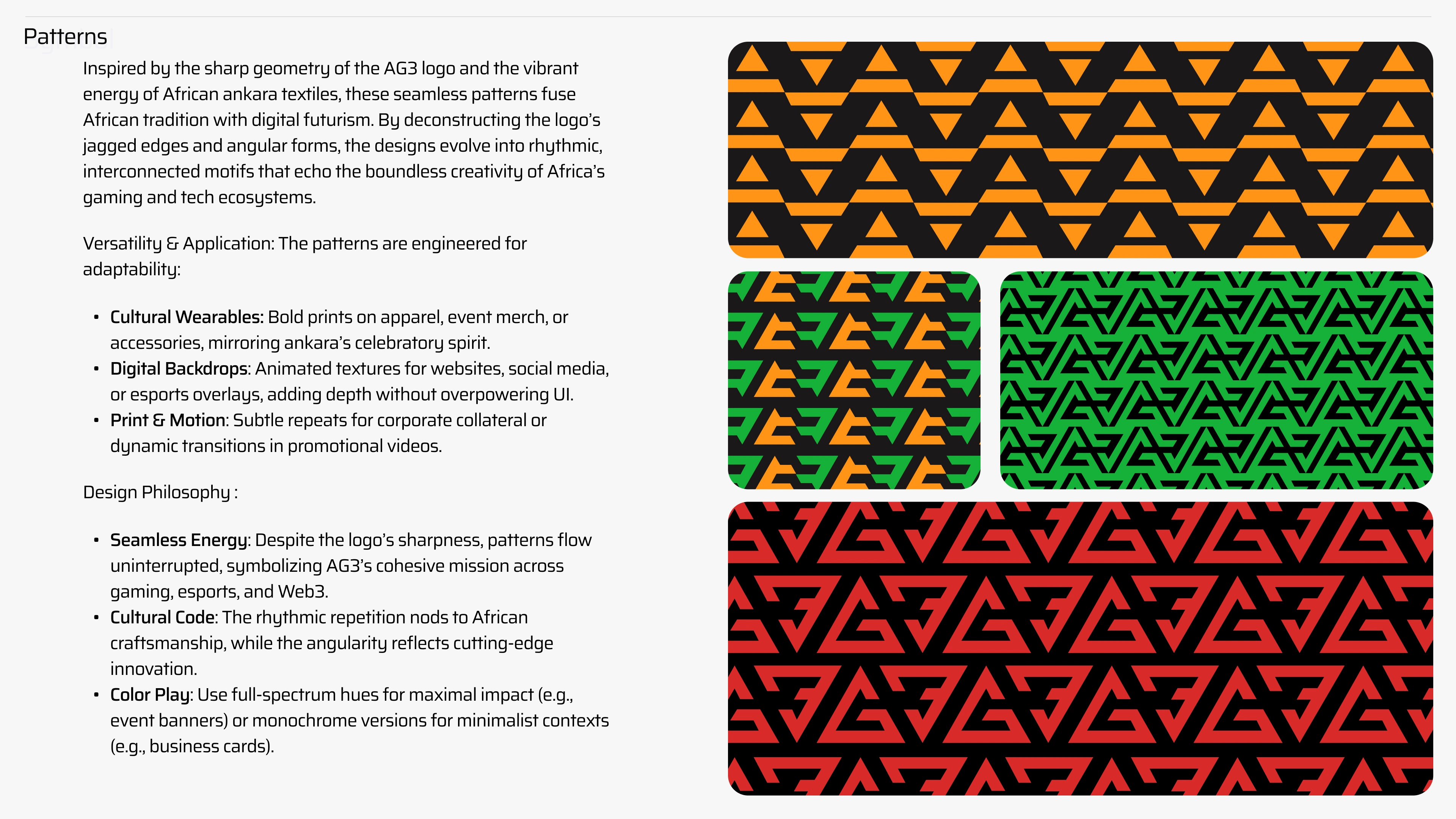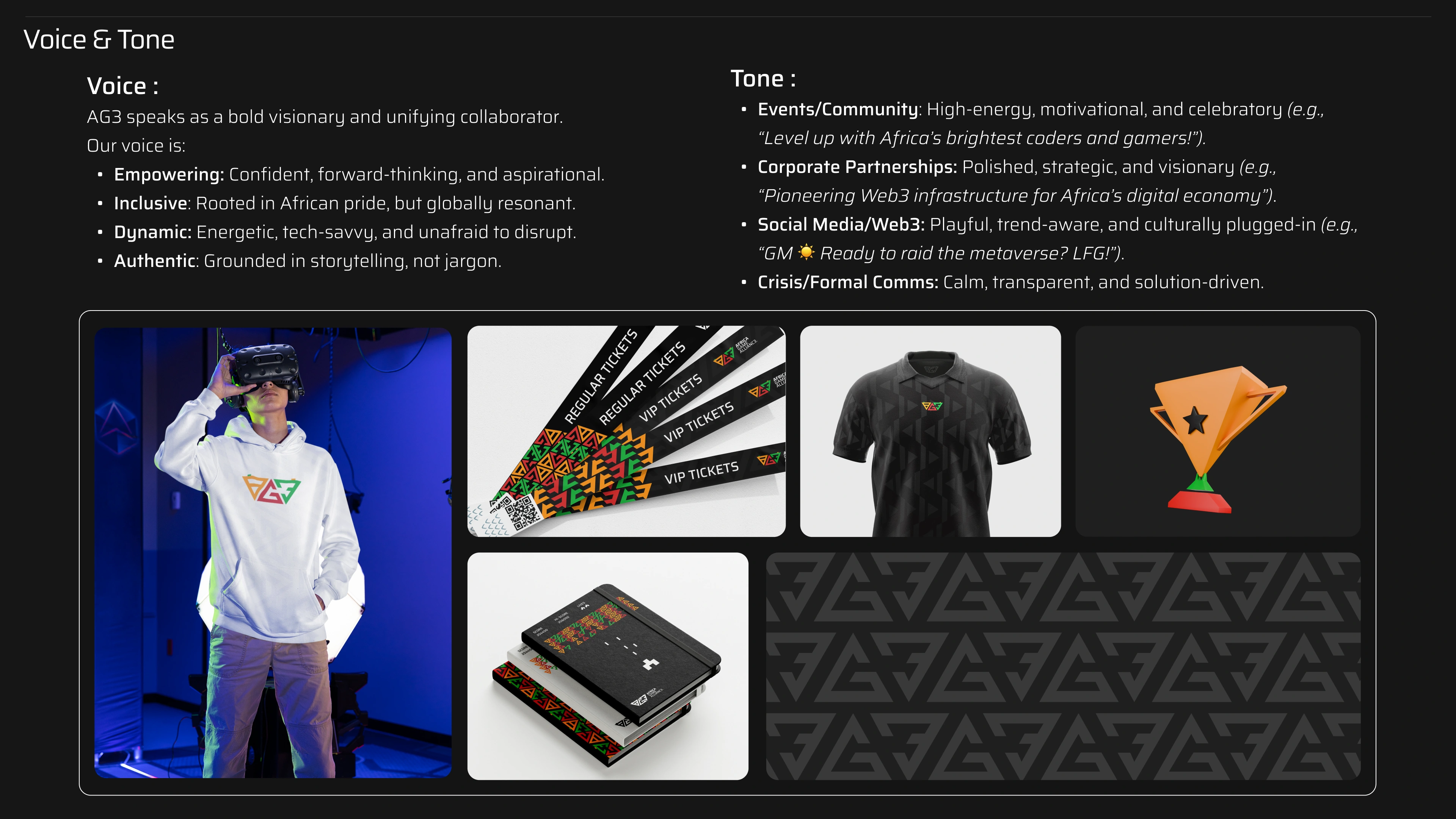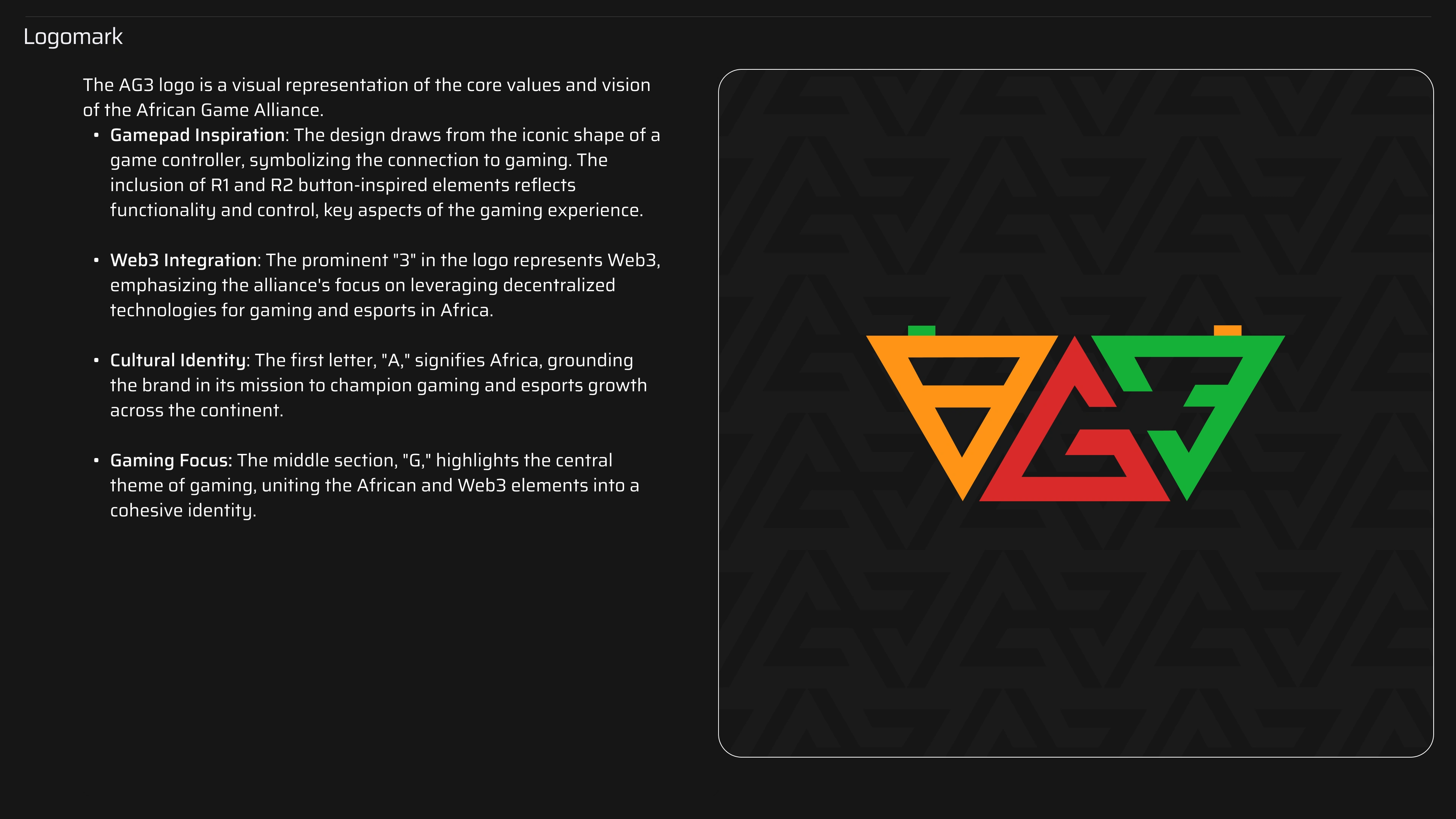 AG3's brand guideline is a dynamic visual identity crafted for Africa’s gaming, esports, and Web3 community.