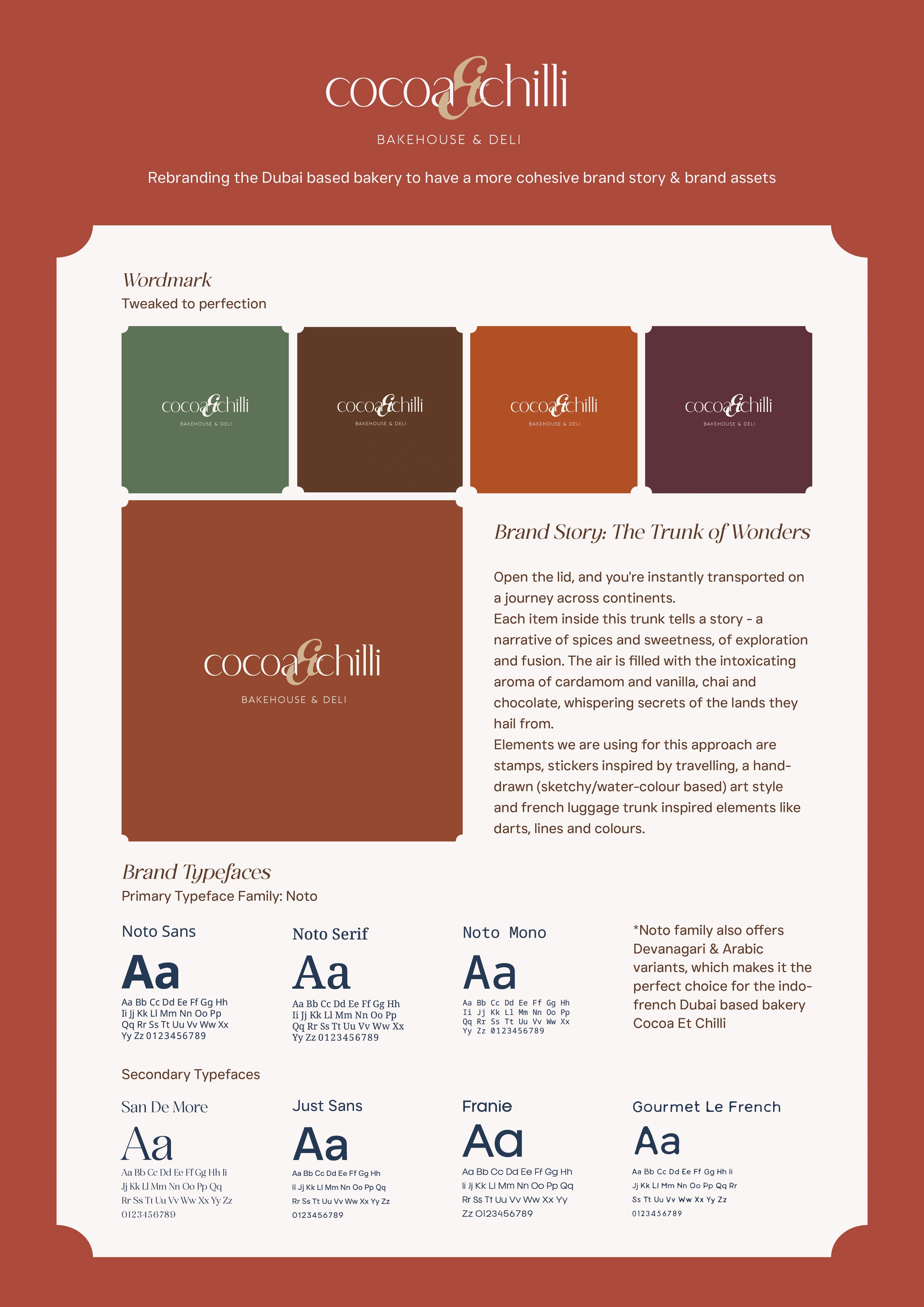 The Trunk of Wonders is a Dubai-based bakery where every product tells a story. From spices and sweets to chai and chocolate, each item evokes exploration and nostalgia. Visual elements like stamps, stickers, and watercolor-inspired sketches combined with trunk motifs create a sense of travel and discovery.