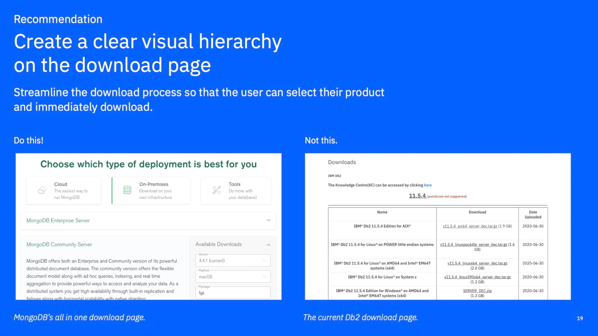 At IBM, I conducted end-to-end, mixed-method research on IBM Db2, IBM's 30+ year old relational database. I tested all sorts of different features including: monitoring dashboards, SQL editor, replication-based disaster recovery, backup and restore, and the administration settings area. My research methods included: usability testing, card sorting, tree testing, concept testing, prototype testing, jobs to be done (JTBD), and generative interviews.