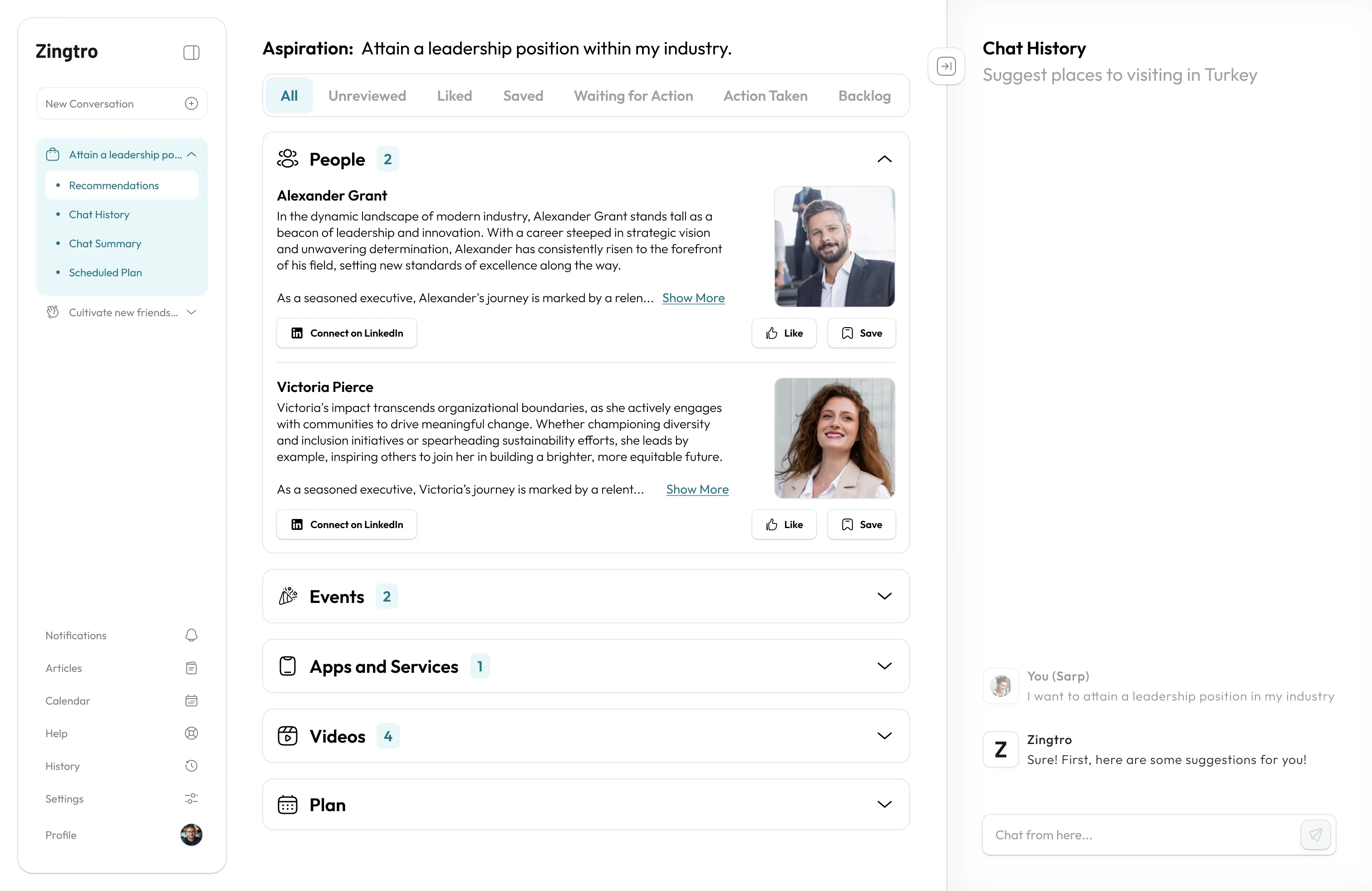 AI-driven platform helping users achieve personal and professional aspirations. Connects users with people, events, content, and tools to reach their goals.