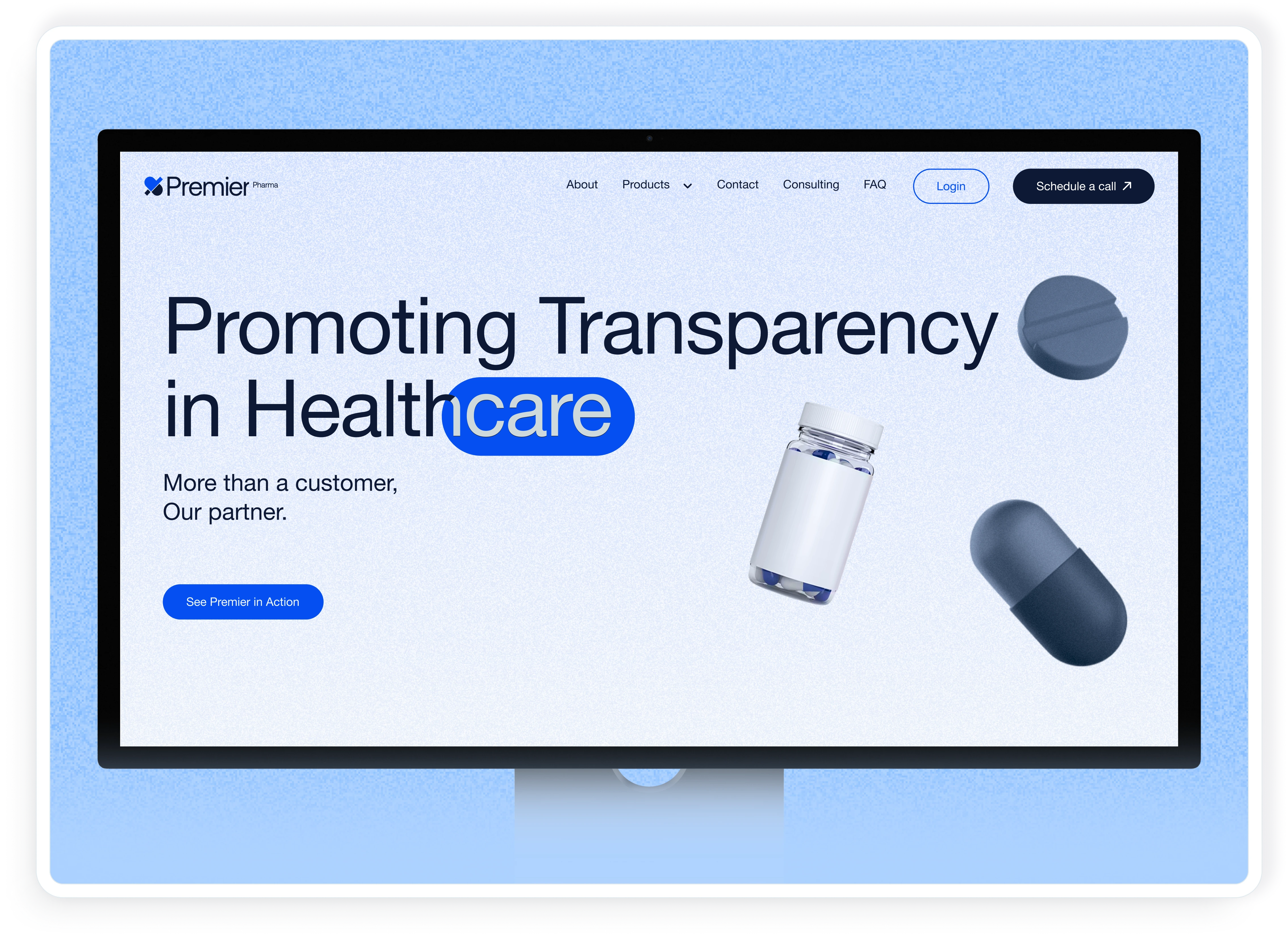 Premier Pharma, a leading healthcare services provider, faced a challenge of attracting new customers in an increasingly competitive market. Their marketing website felt outdated, the client-facing web app lacked consistency with the brand, and conversion opportunities were slipping through the cracks.