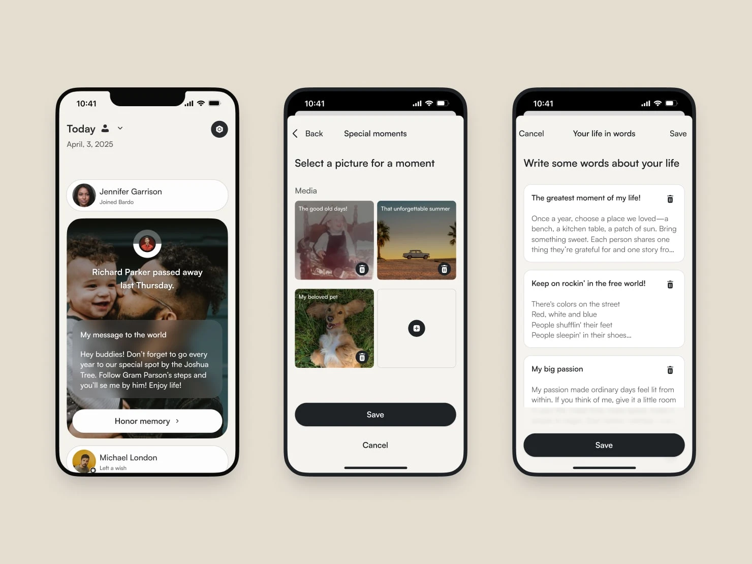 The system combines guided prompts, free writing, and explicit confirmations to avoid sensitive mistakes. Recipient selection integrates phone contacts and Bardo users, with invitations when someone isn’t a member yet. The flow ends with a verifiable summary and a success screen that communicates calm and control. Visual identity, microcopy, and accessibility (≥44pt targets, Dynamic Type, VoiceOver) support an inclusive, respectful experience.