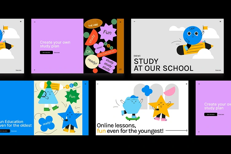 A vibrant and engaging set of hero sections designed for online education platforms. I have used bold colors, clean typography, and charming geometric characters to create an approachable and dynamic user experience. Each frame combines quirky illustrations (stars, triangles, circles with expressive faces) to create emotional connection between user and platform. The design leverages high contrast backgrounds, oversized elements, and sticky call-to-actions (e.g., “Start education”) to draw users into exploring the platform. Ideal for education startups targeting children, teens, or even adults with a fun-first approach.