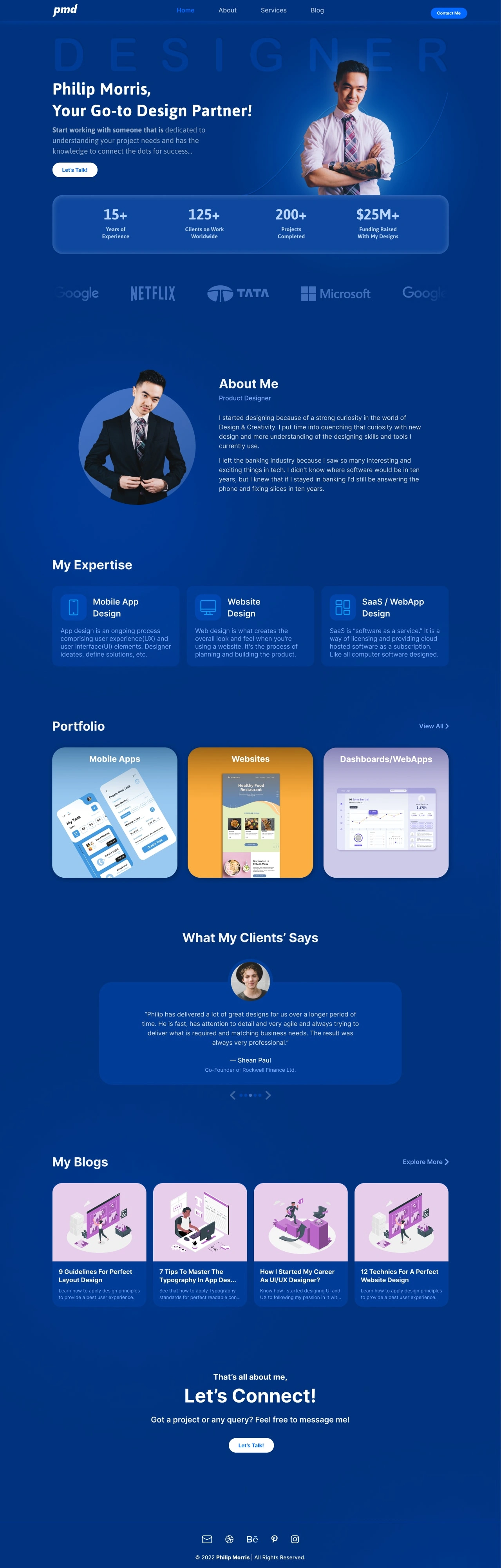 Website Design of a Designer offering his services, showcasing portfolio, and knowledge through blogs, and presenting himself to potential clients.