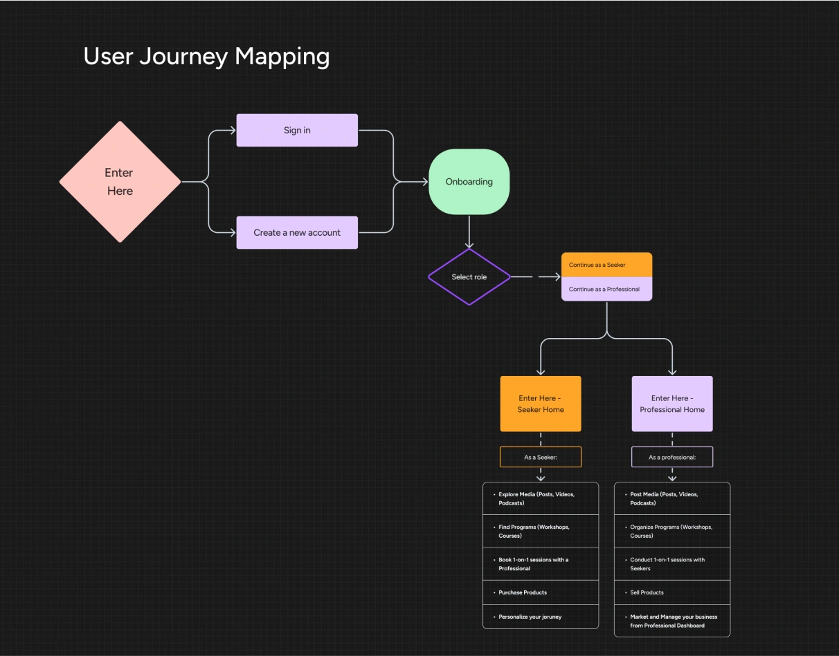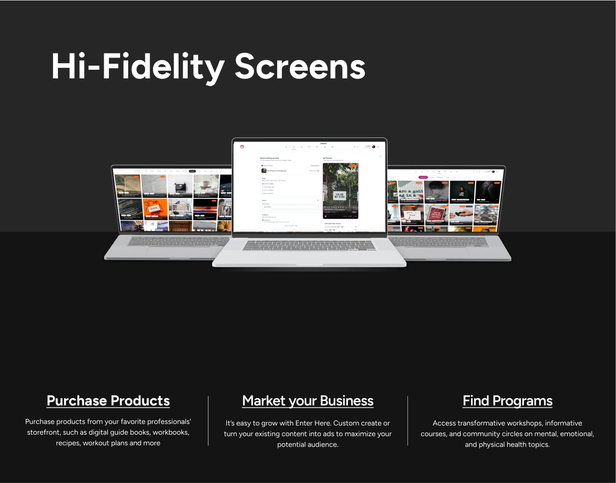 I partnered with Enter Here to design a holistic, multi-platform user experience that communicates emotional safety, credibility, and modernity. Working across web and mobile, I redesigned critical user journeys including onboarding, home experience, 1-on-1 sessions, product pages, event creation, and healer dashboards.