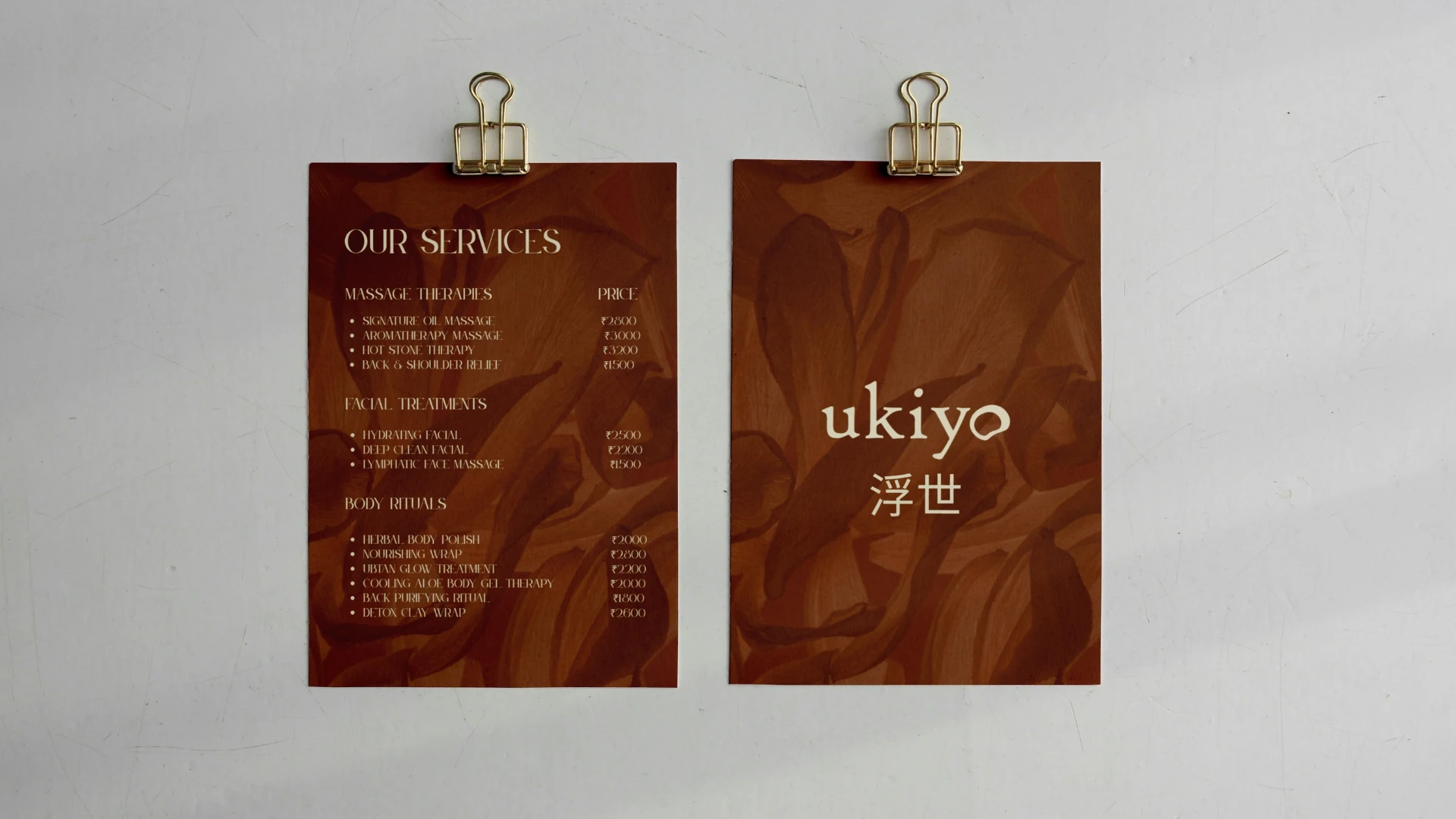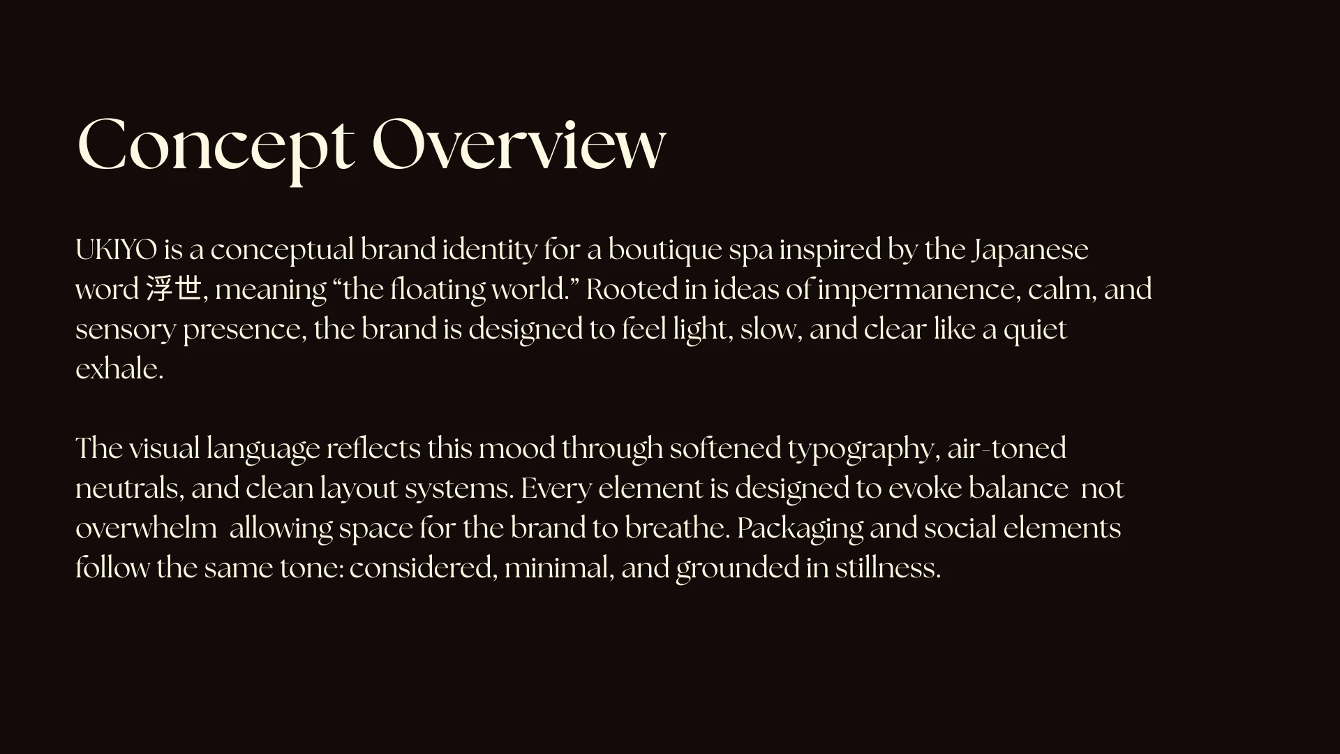 UKIYO is a conceptual brand identity for a boutique spa The design reflects this mood through softened typography , air-toned neutral and clean layout systems.