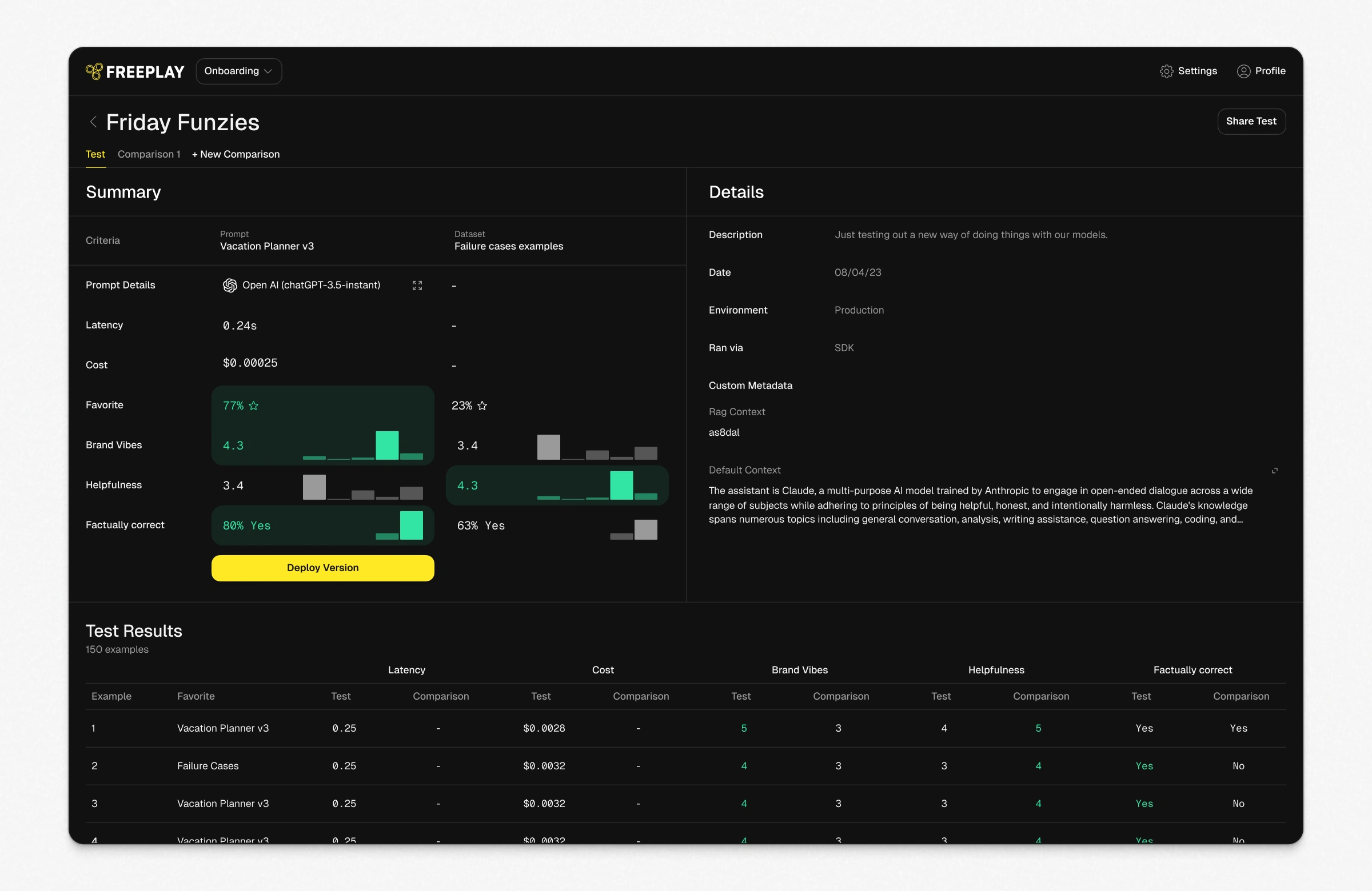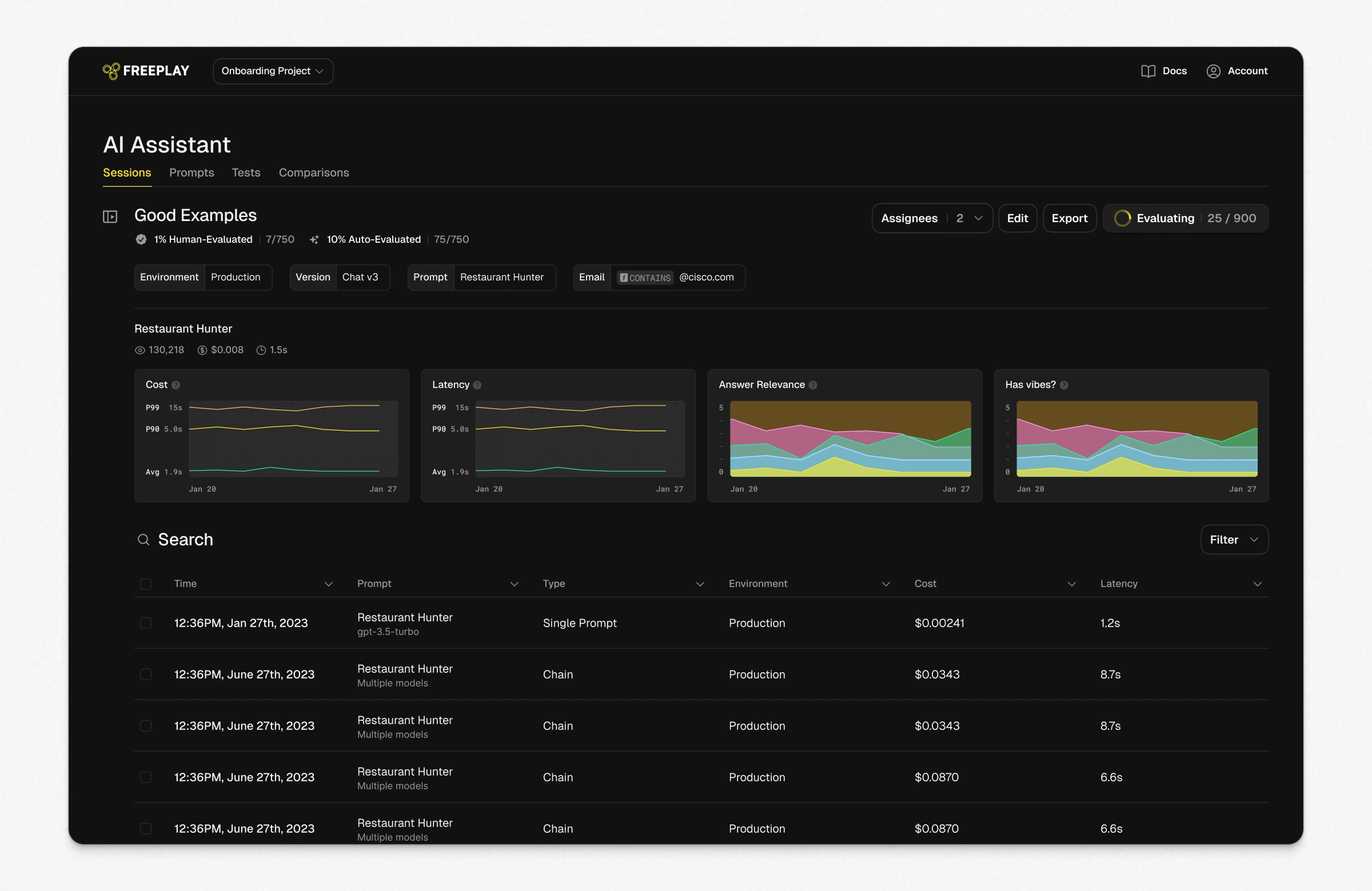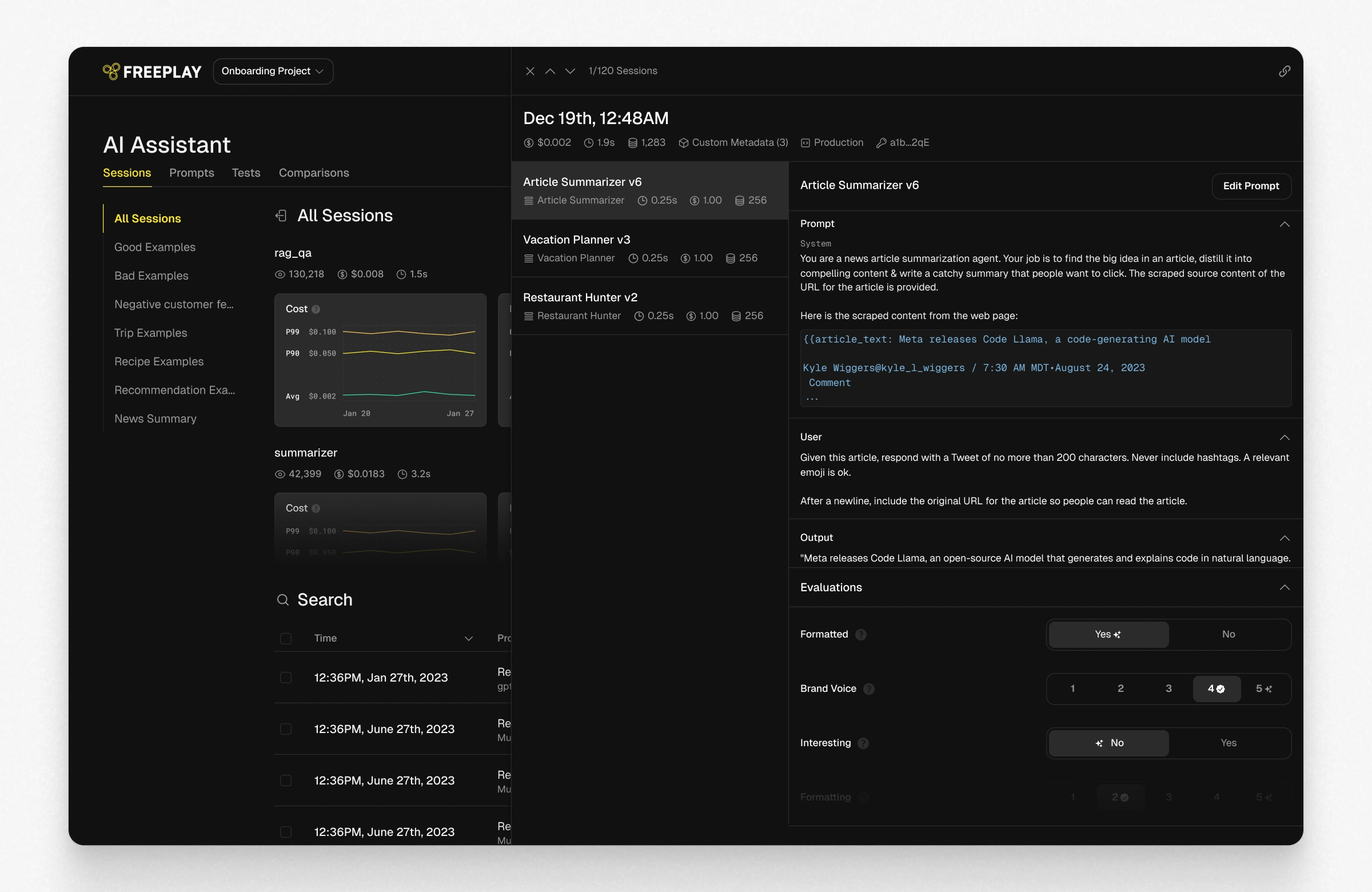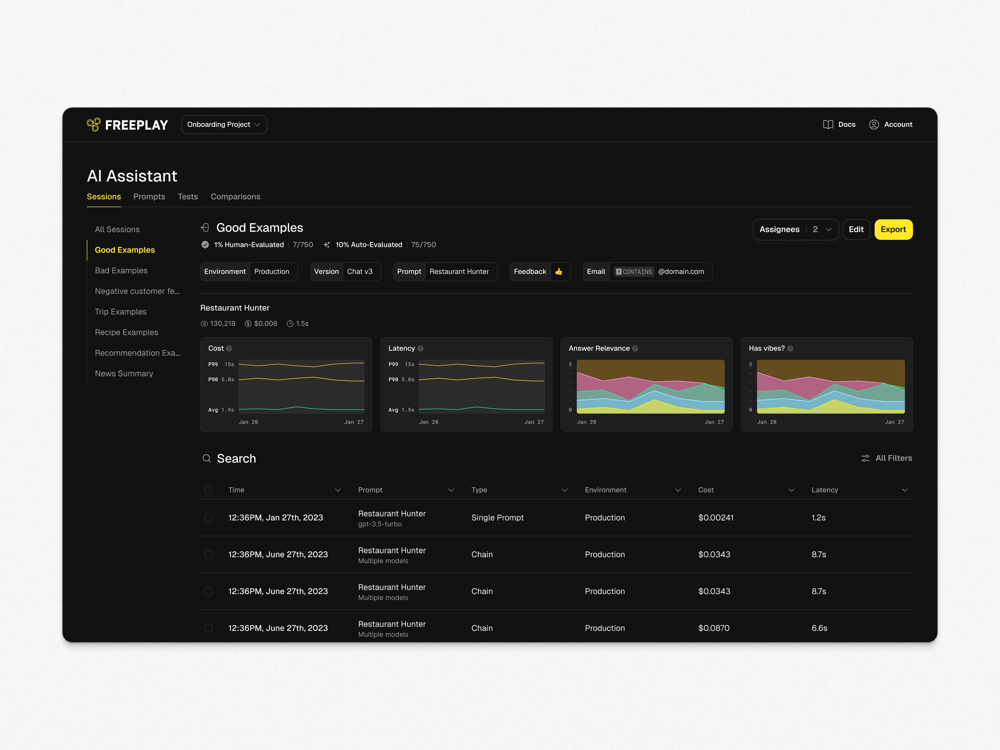Freeplay enables technical product teams to capture every LLM request and interaction, offering a comprehensive view that enables your team to seamlessly evaluate completion data, manage prompts and test prompt outputs.