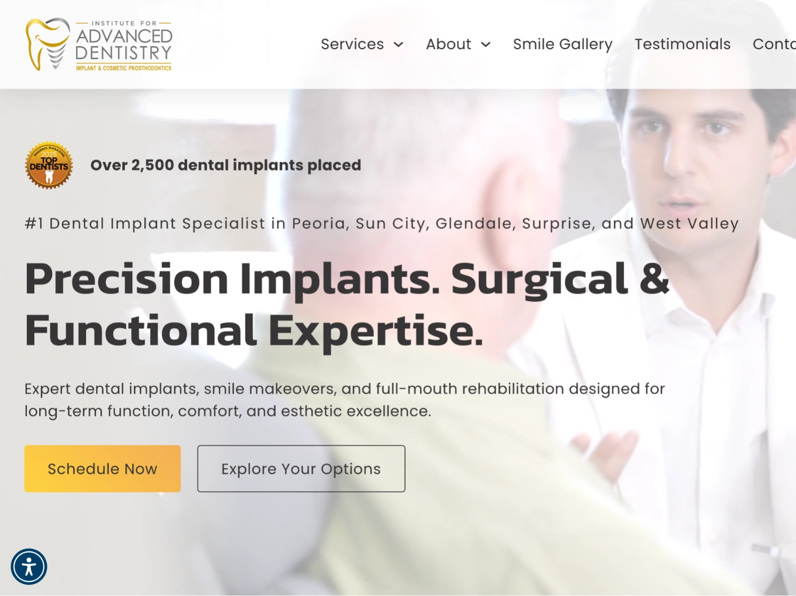 A full-on redesign of a dental prosthodontist's website to target his customers in his local area, including new pages and copy!