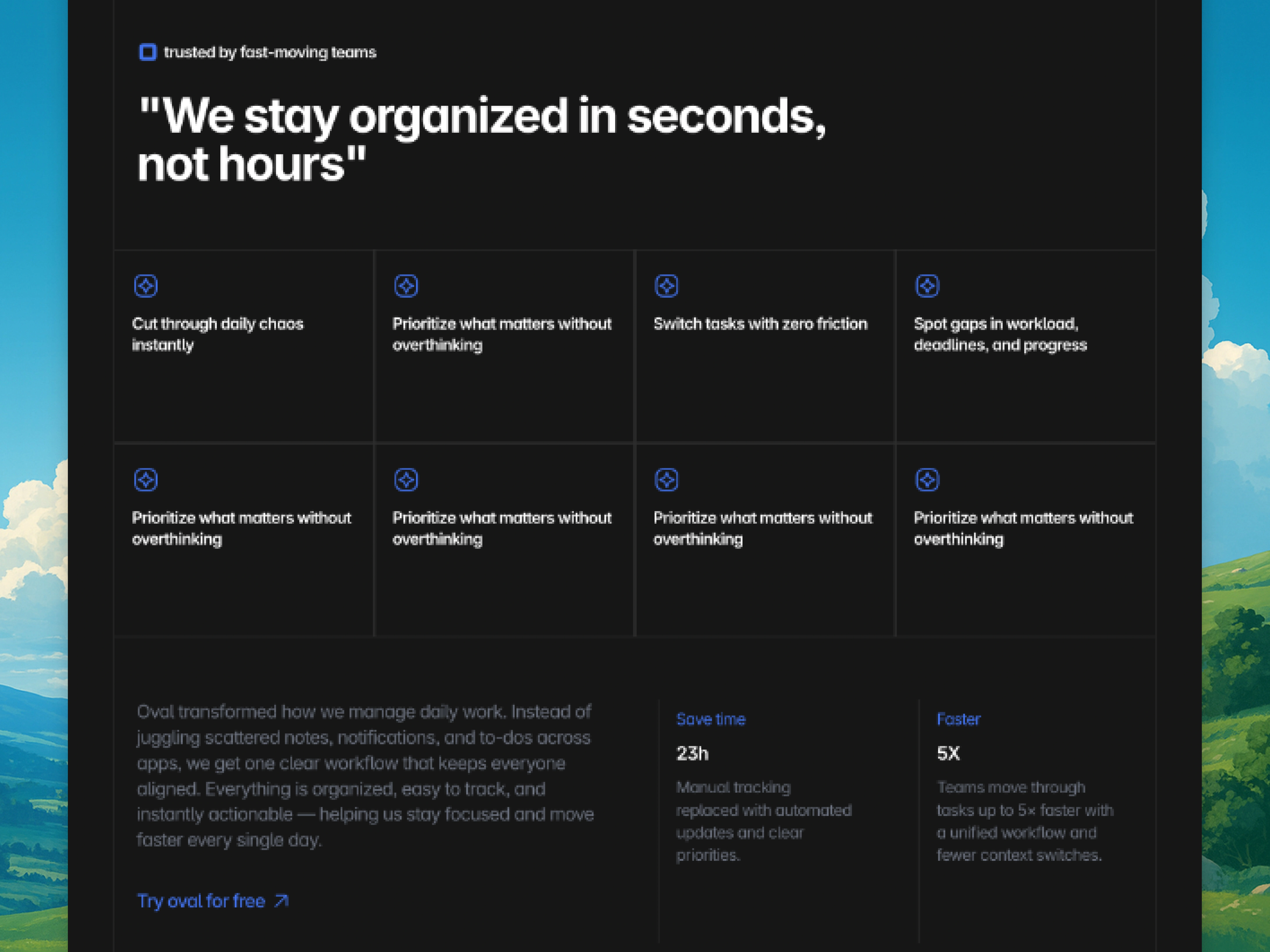 I imported high quality screenshots from the Oval app and placed them carefully to feel like natural extensions of the page. Framer’s image handling made this process smooth and accurate.