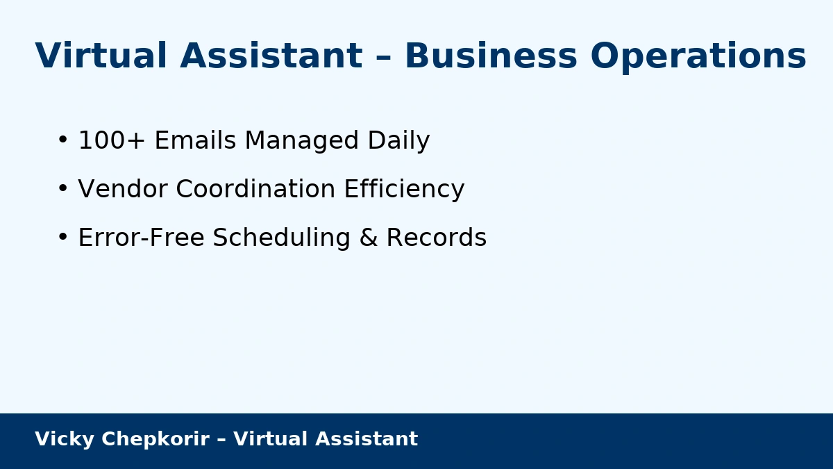 Provided end-to-end virtual assistant support to manage email, calendar, vendor communications, and document preparation. Implemented efficient workflows