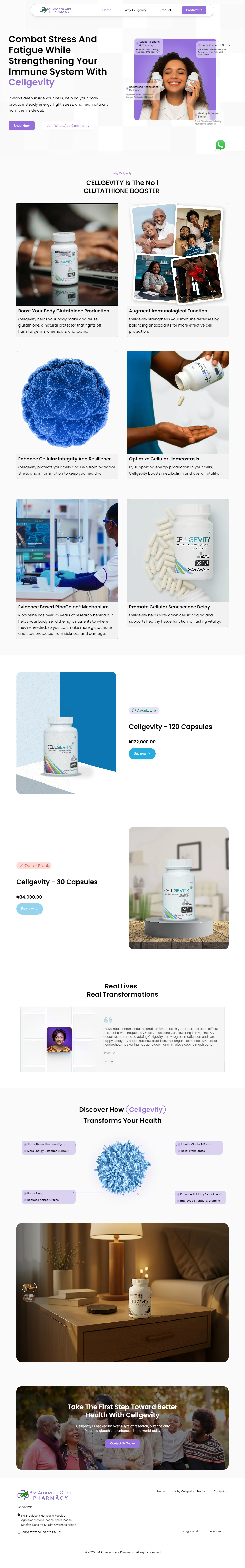 • Image-forward layout with large product photography and testimonial blocks to build trust.