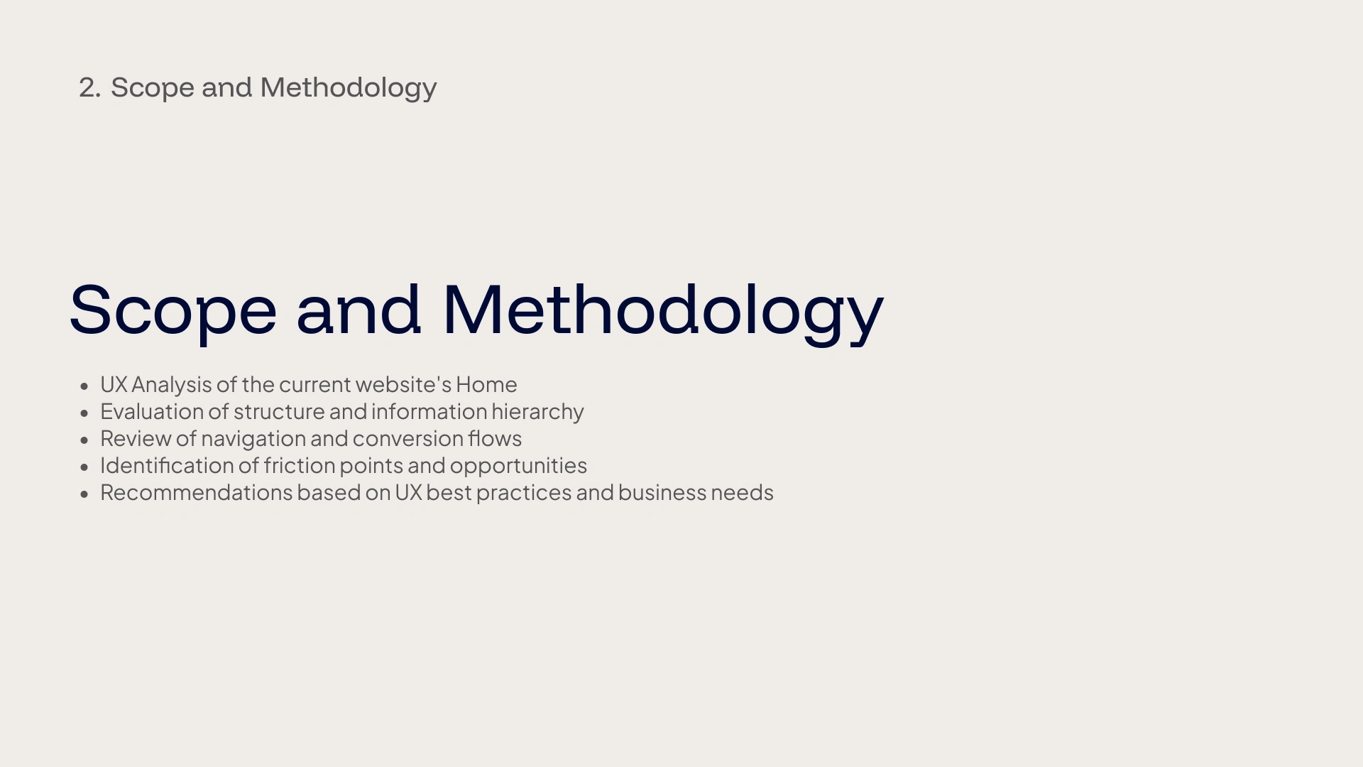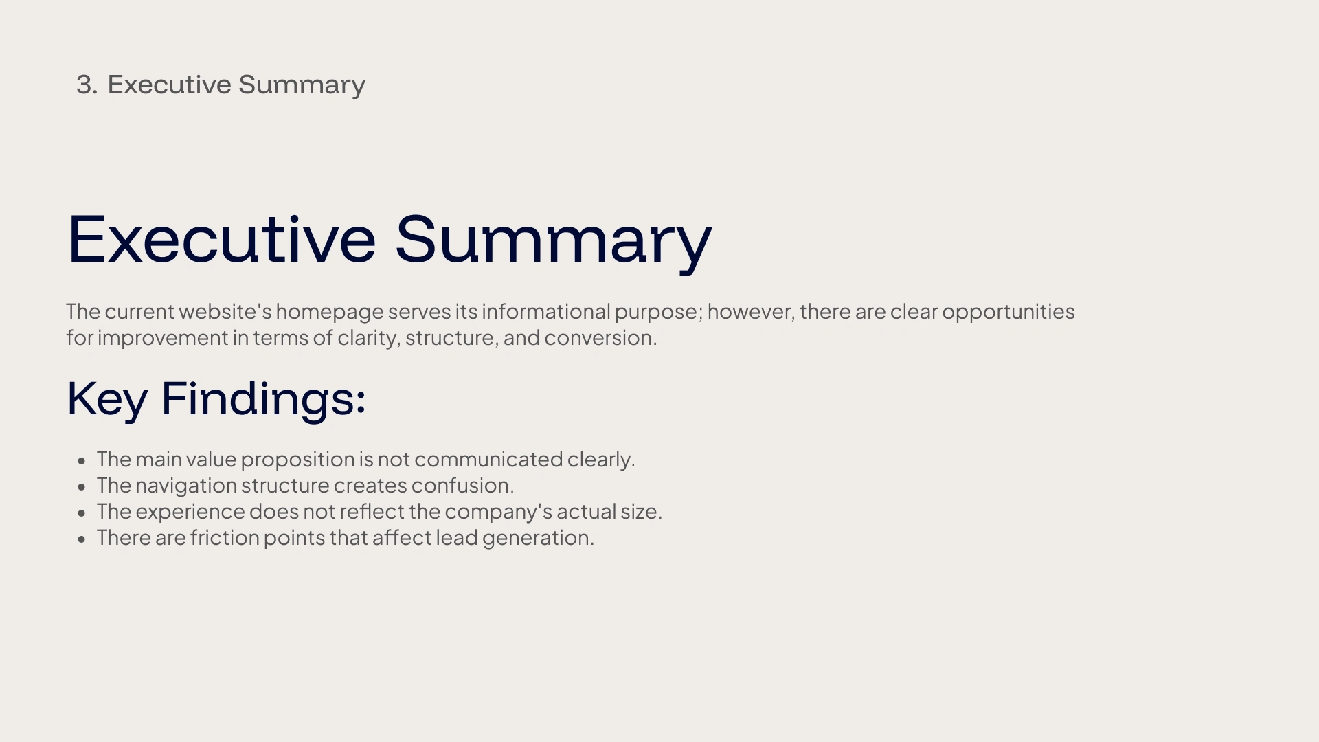 The goal is to identify improvement opportunities that allow the website to adequately represent the size of the company, reduce friction for users, and enhance the capture of business opportunities.