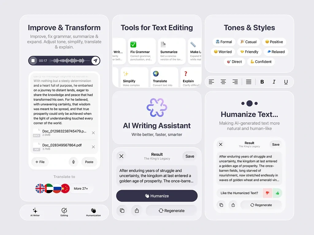 Our AI Writing Assistant project represents a comprehensive approach to content creation that bridges the gap between human creativity and AI efficiency. We developed a complete ecosystem featuring voice input, manual editing, intelligent tone adjustment, and multi-language support, ensuring users can craft content that matches their exact needs and style preferences.