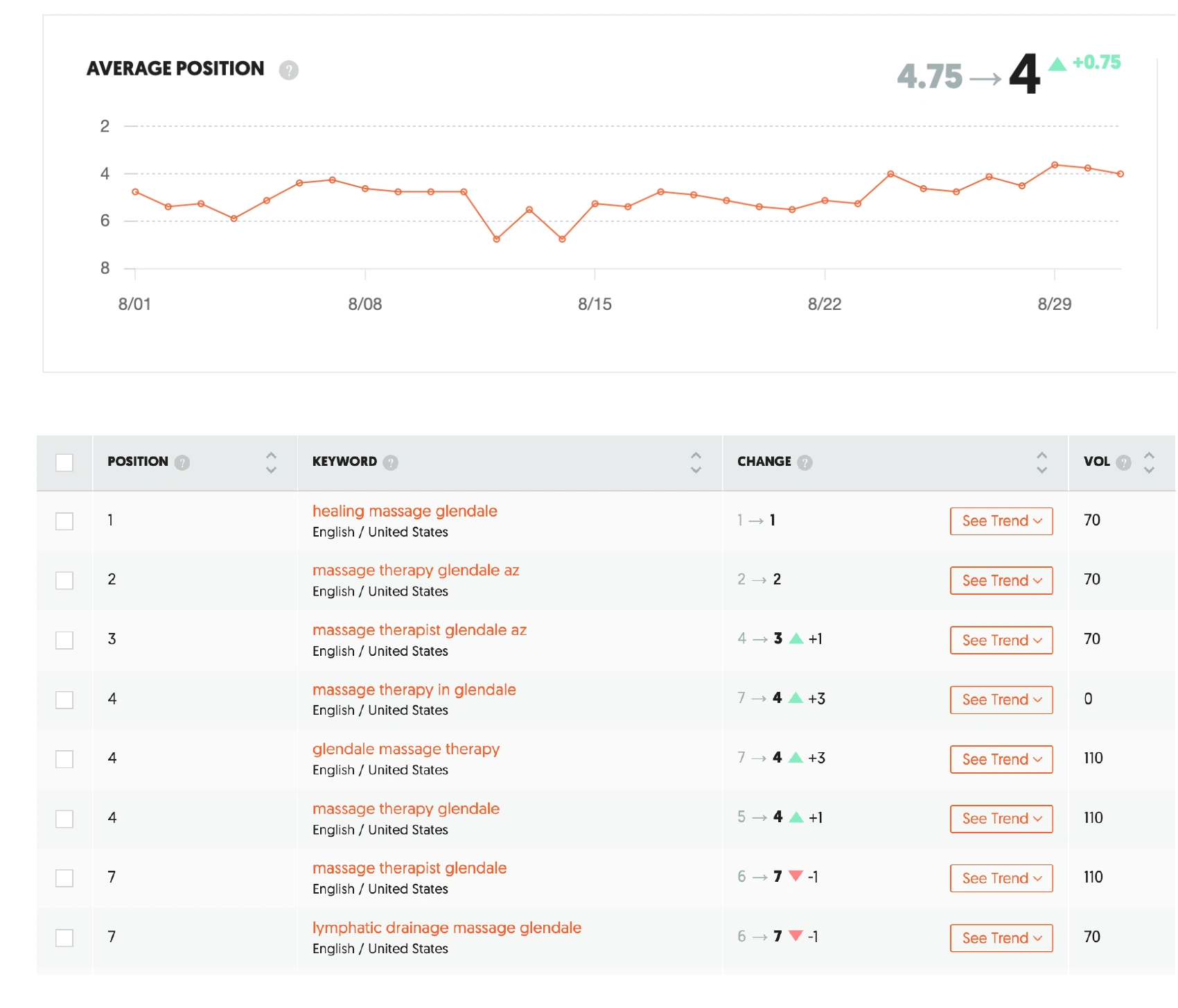 The new website is ranking well on the first page for local searches. Searches with "near me" in them or mention of the towns that the massage studio serves.