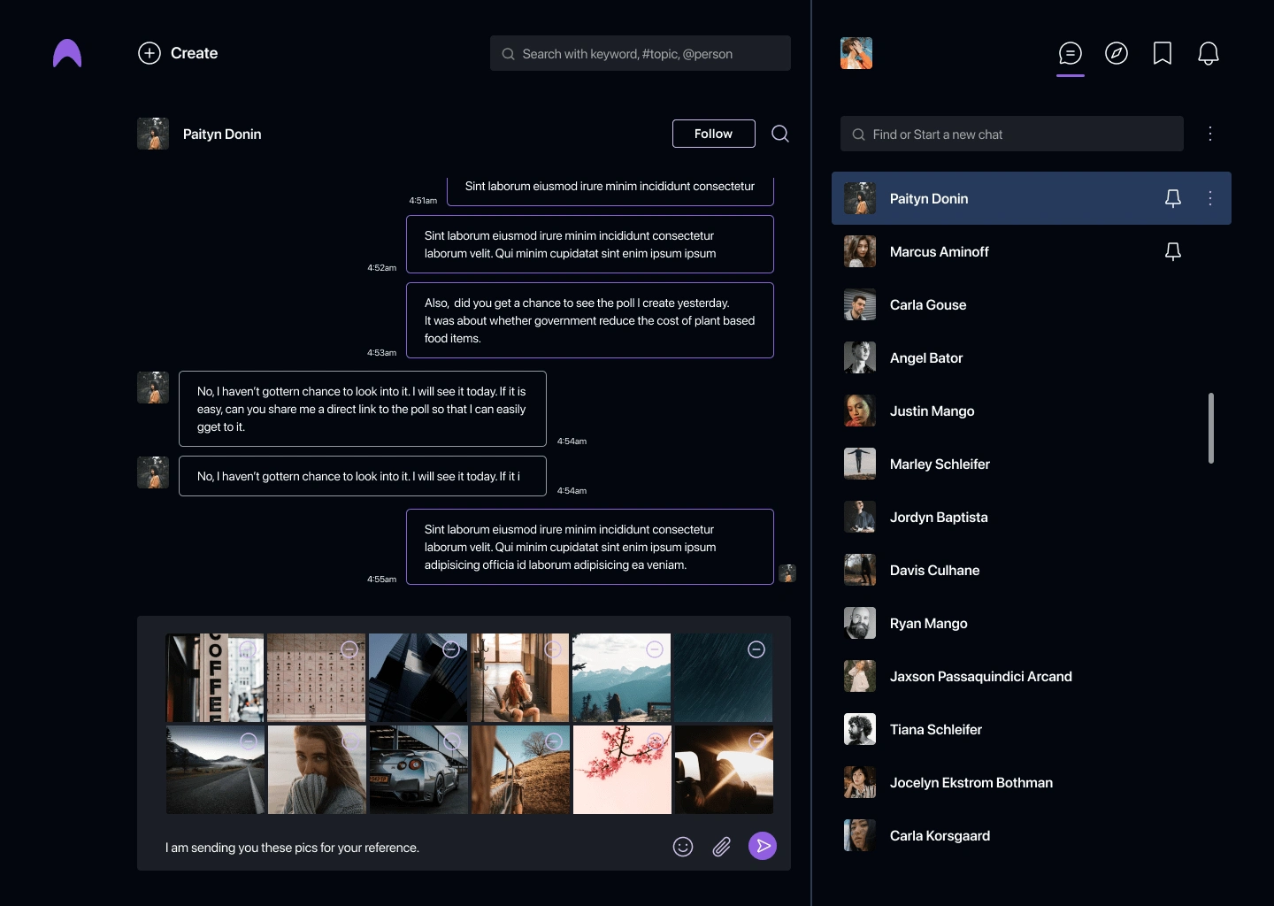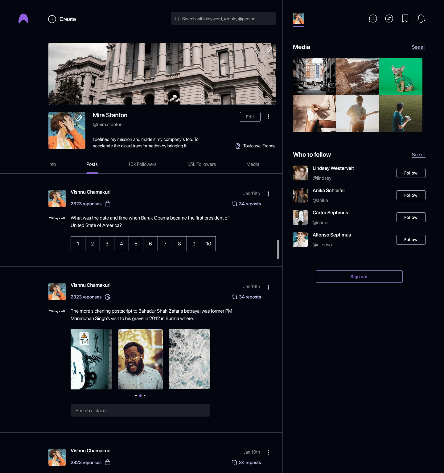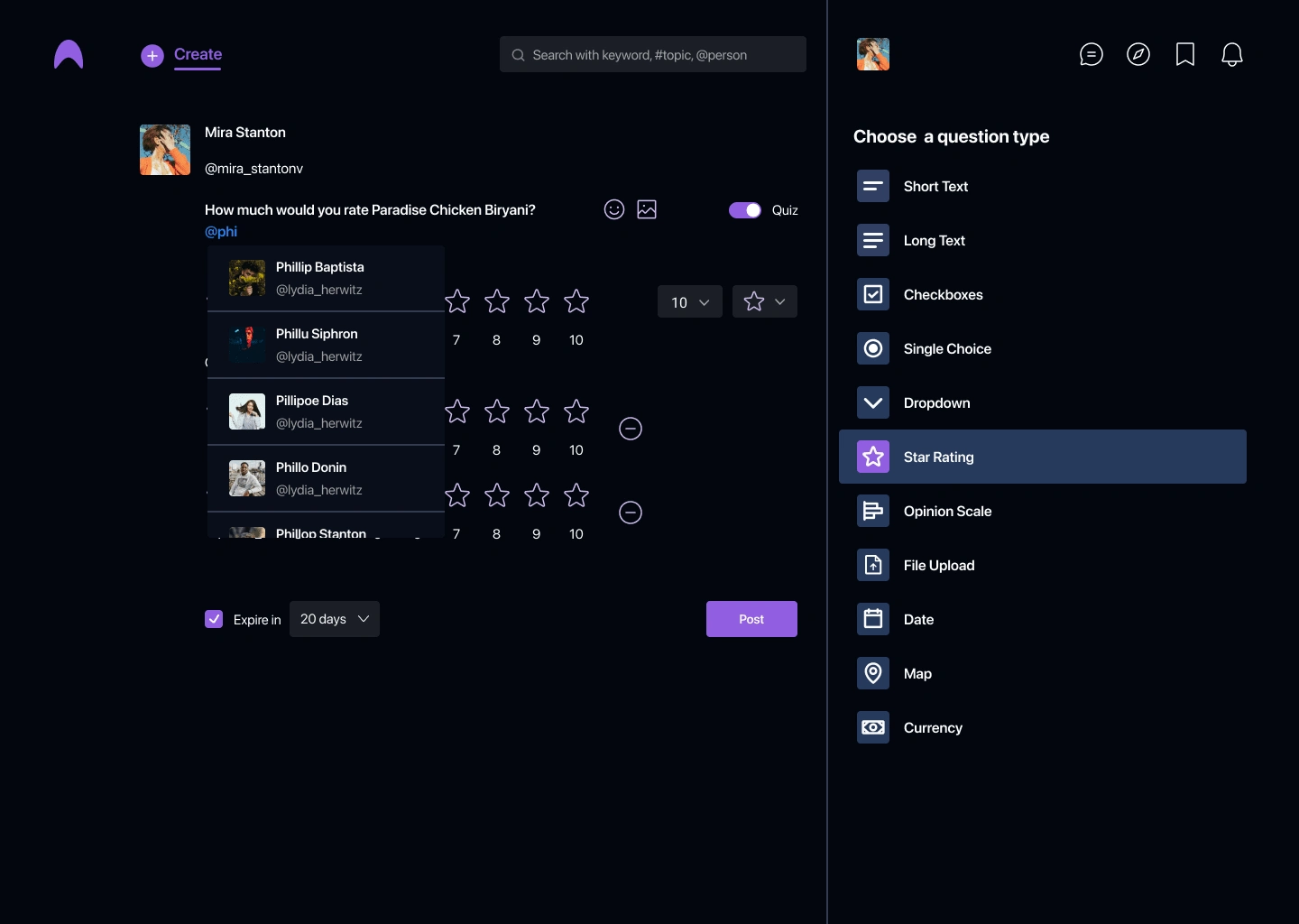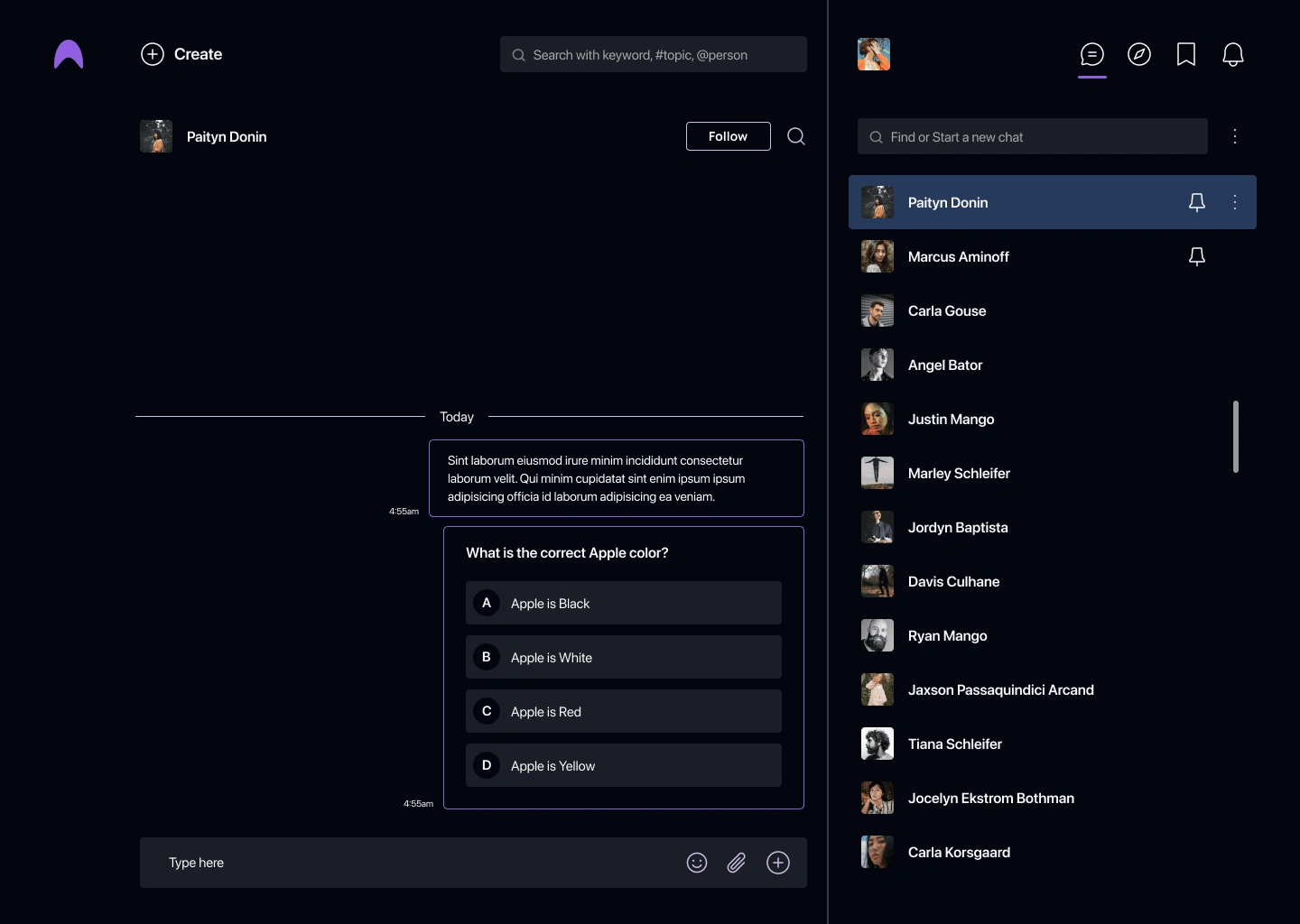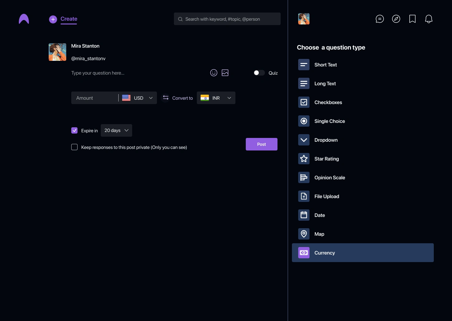 Users can post quizzes and ask a variety of questions here, including ratings, polls, location, and single- and multiple-choice questions. In the feed, the user will be able to see additional analyses and the distribution of options for the given question. Micqro additionally included community-building groups and one-on-one conversation options. For front-end development, I used React.js, Next.js, and Github to sync the code. AWS and Vercel were used for deployment.