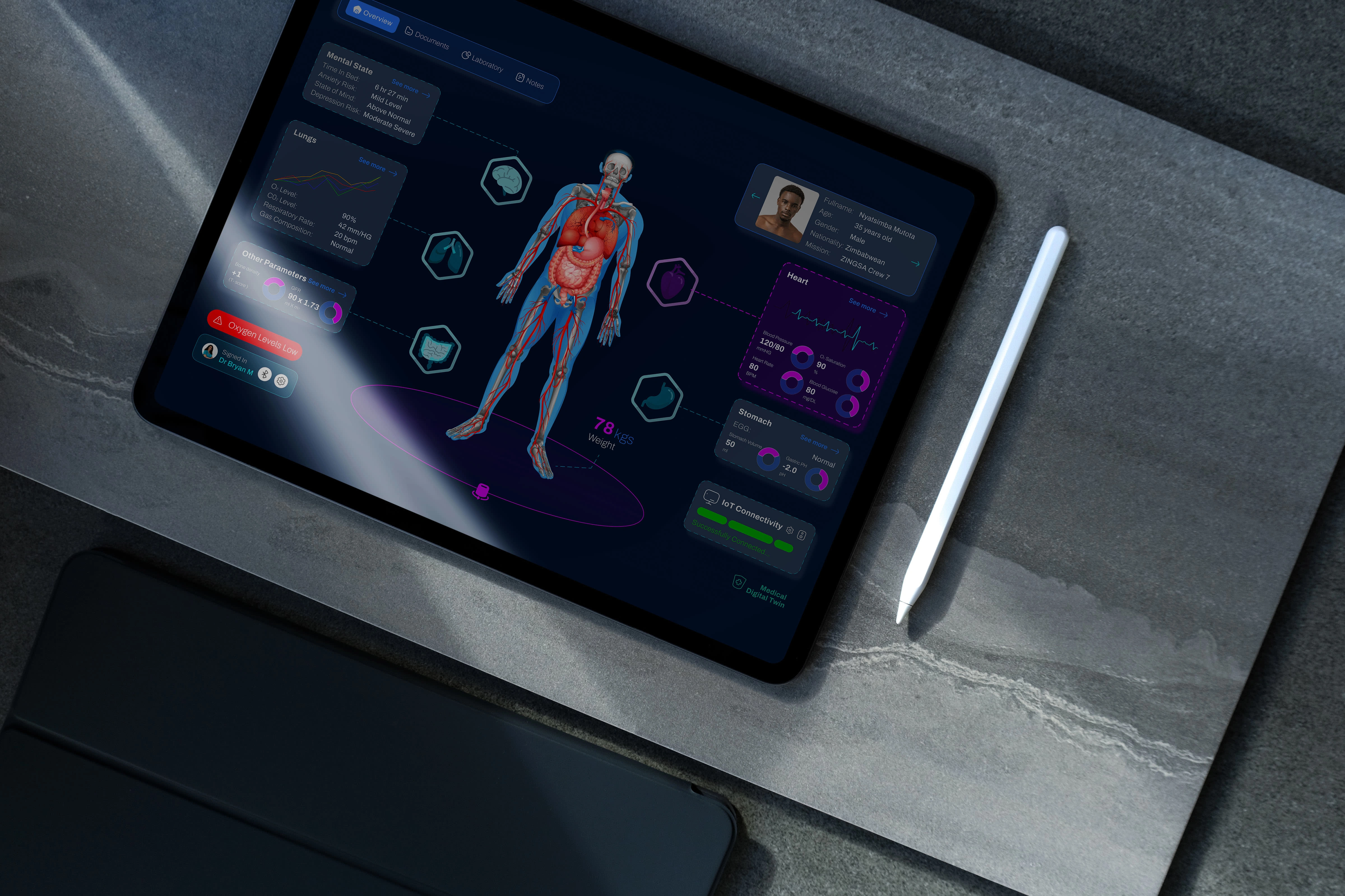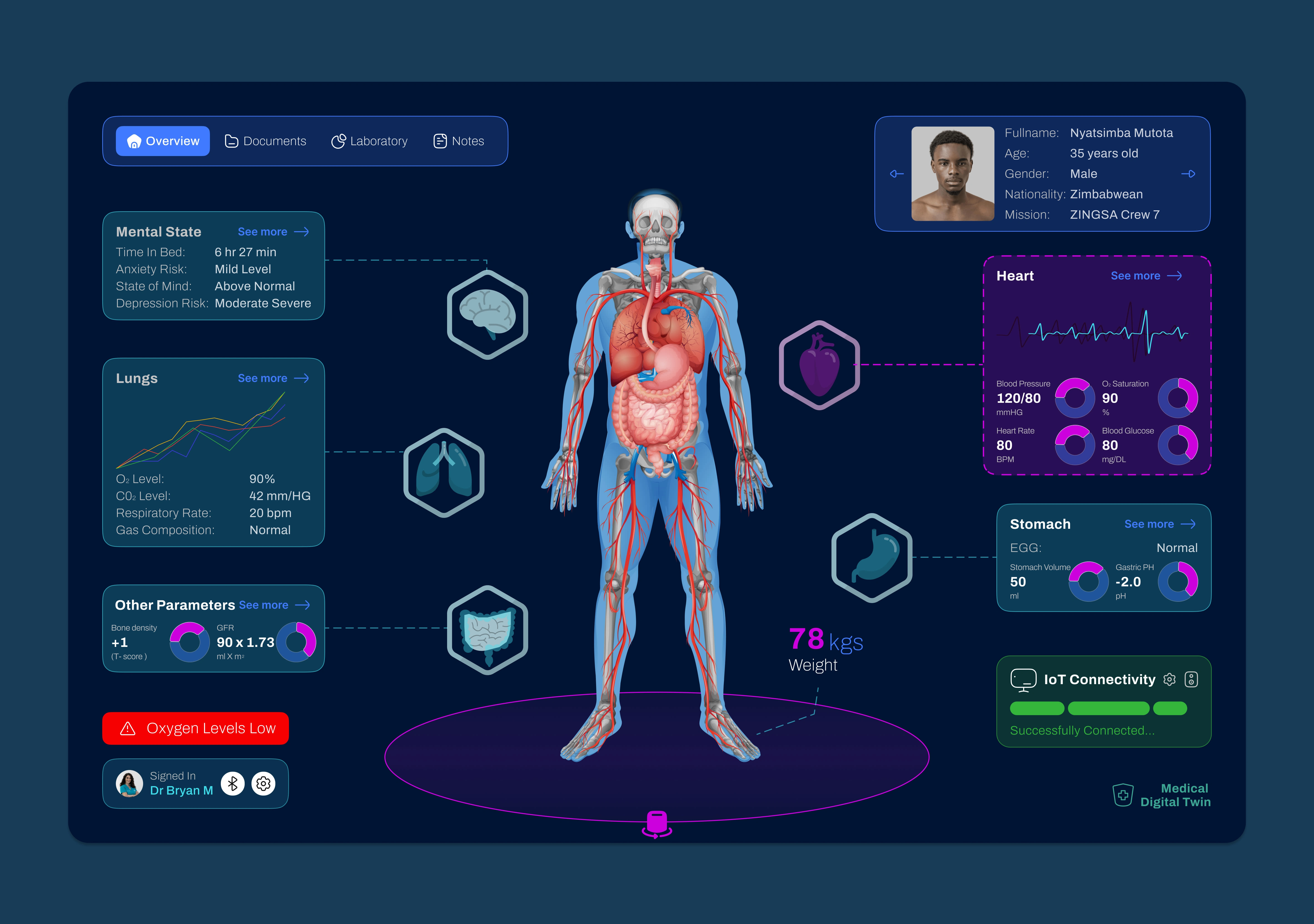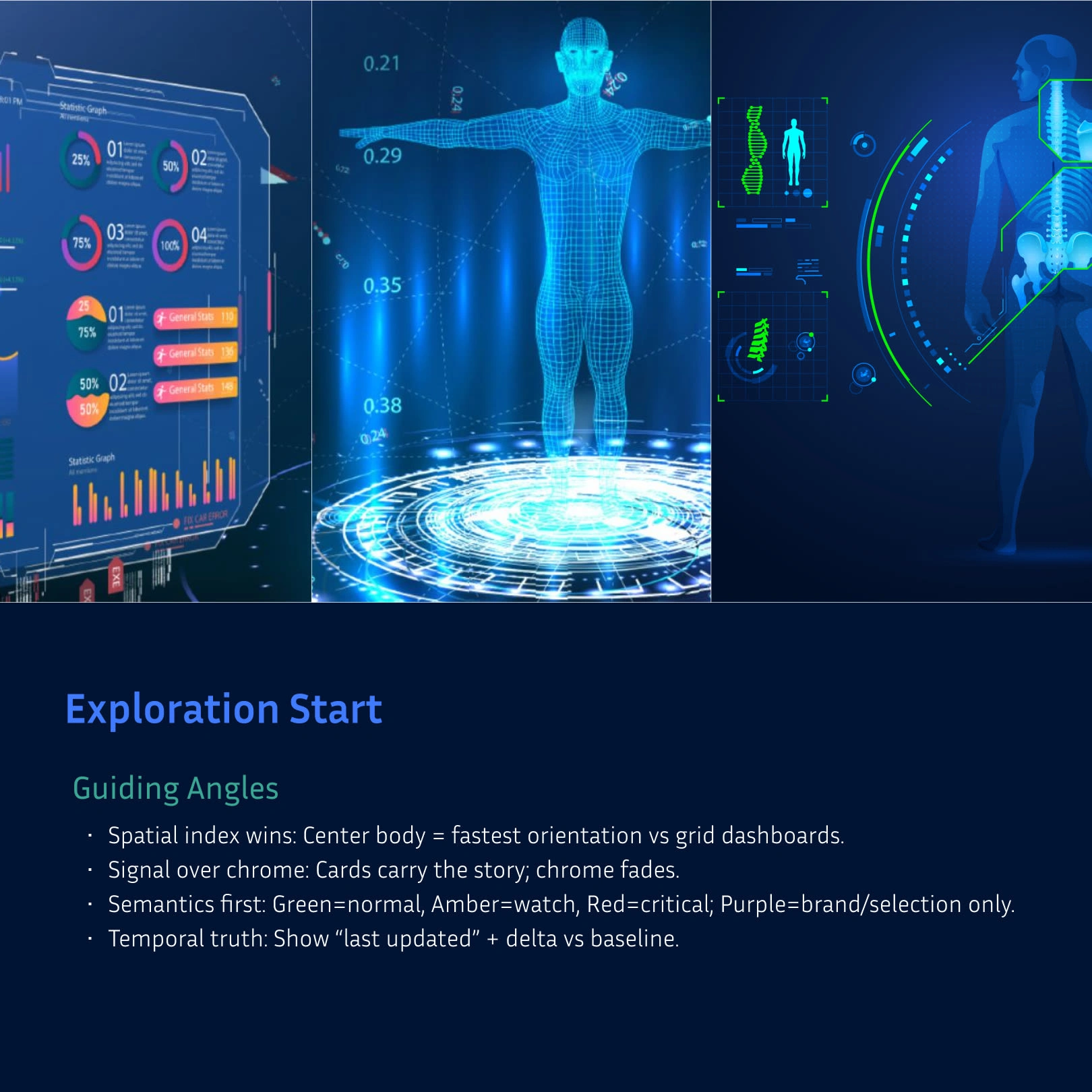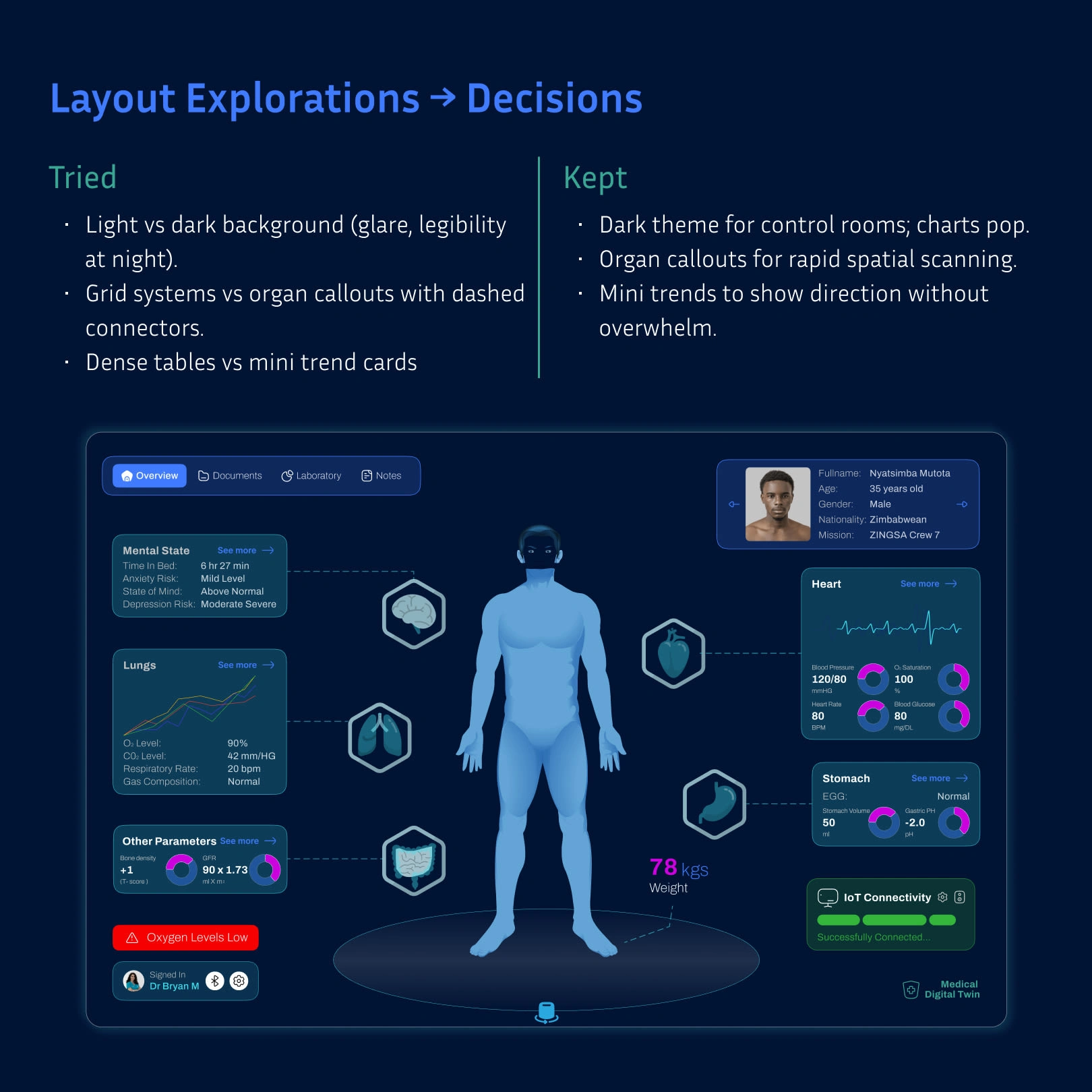 I designed a dark-themed control dashboard that maps live IoT vitals to a spatial body model.