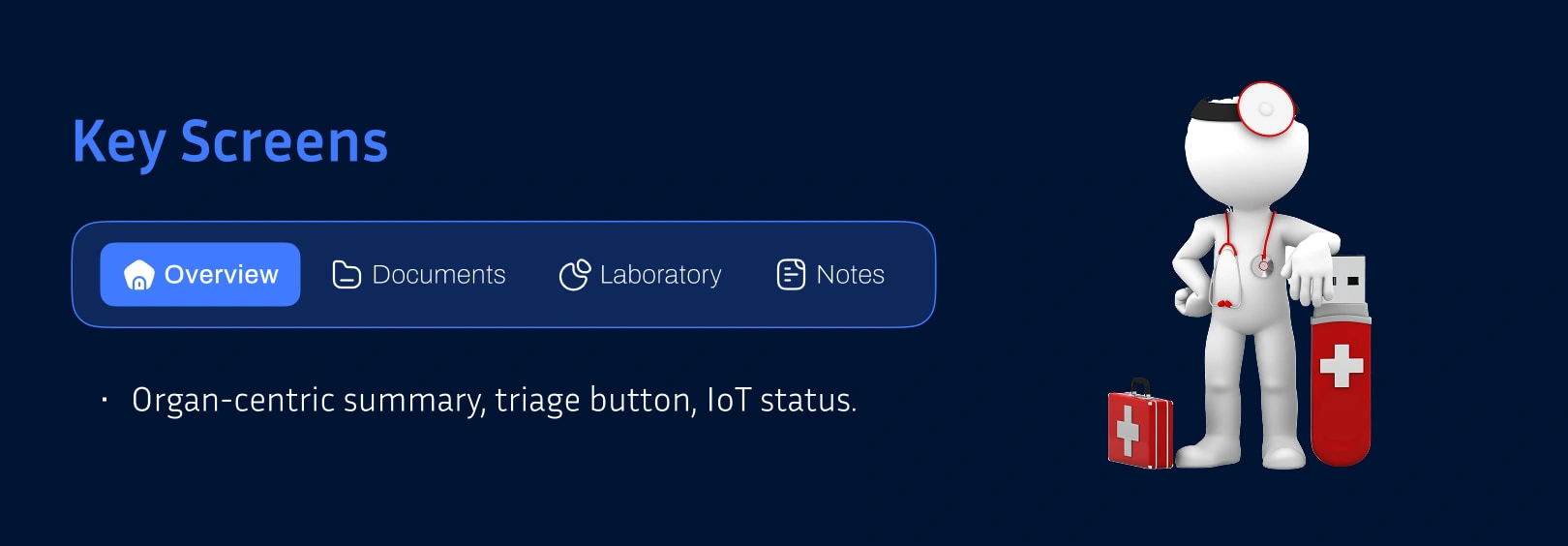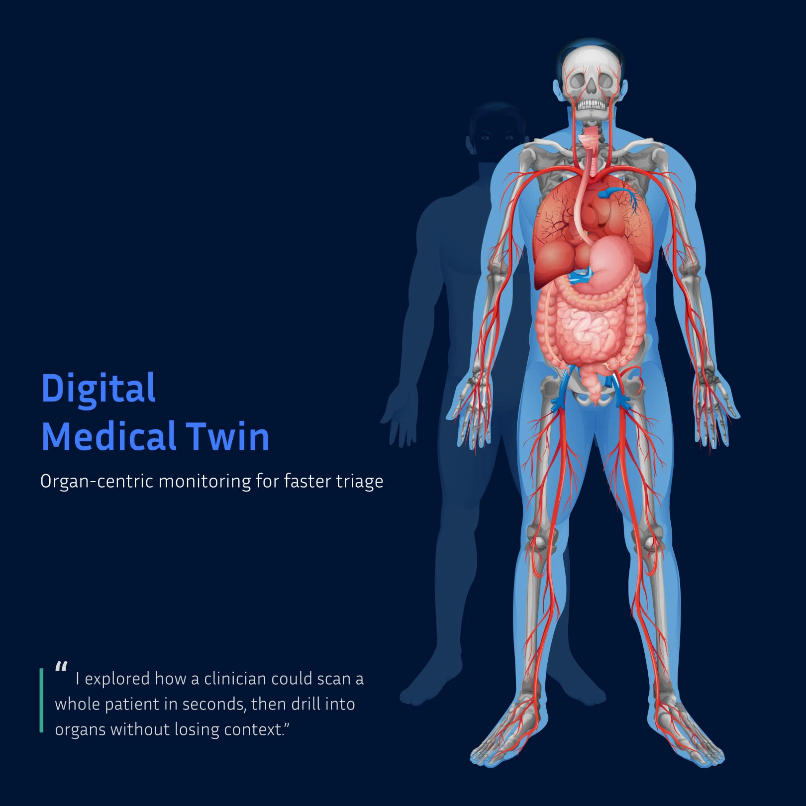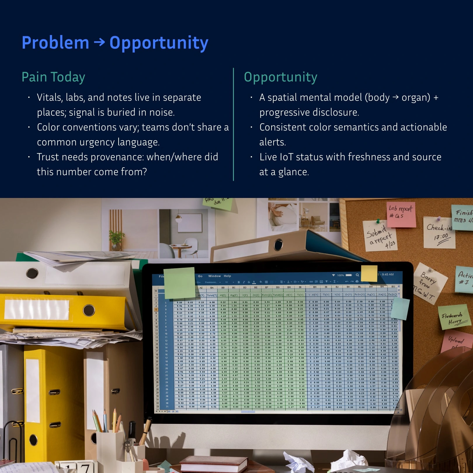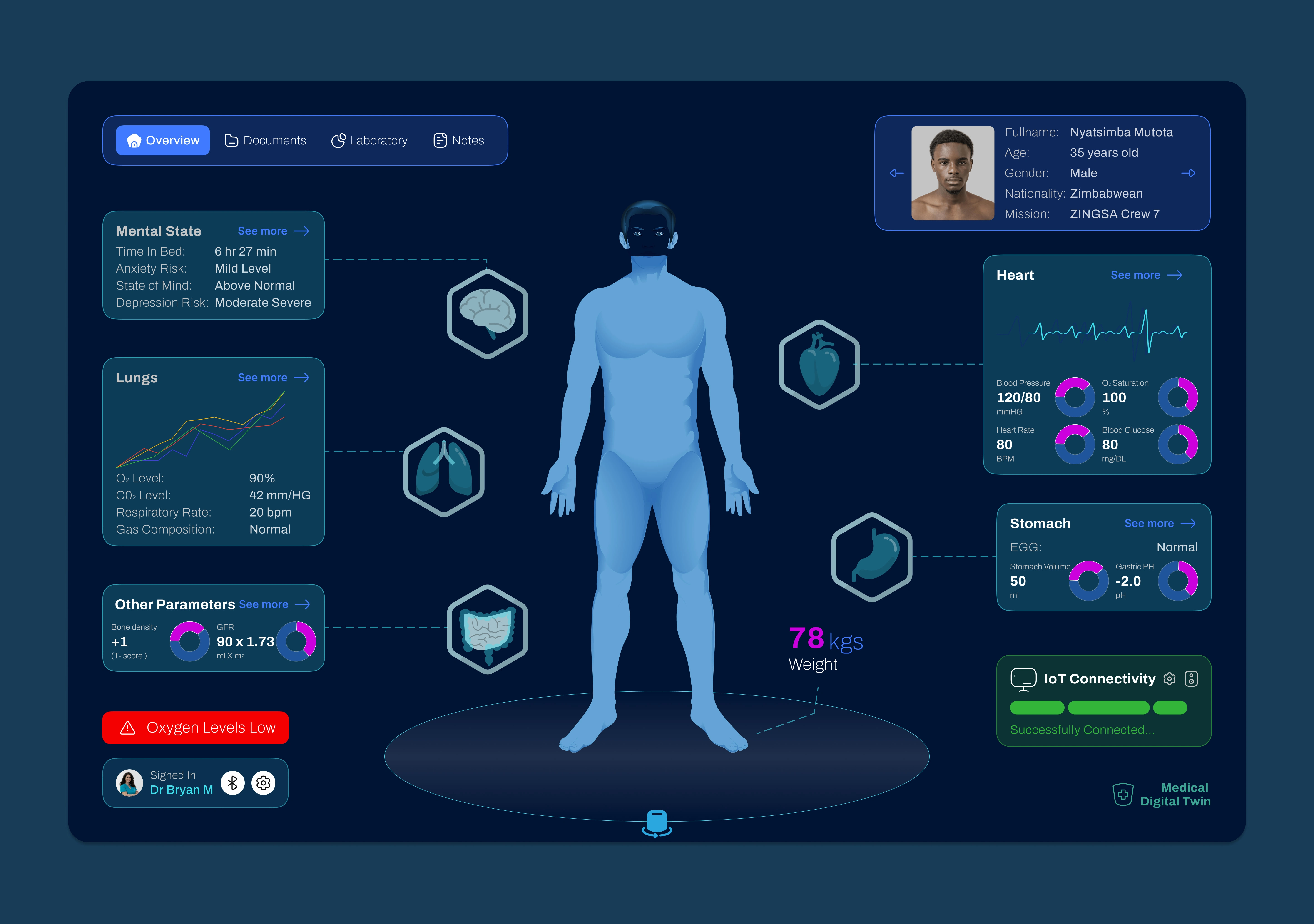 I designed a dark-themed control dashboard that maps live IoT vitals to a spatial body model.