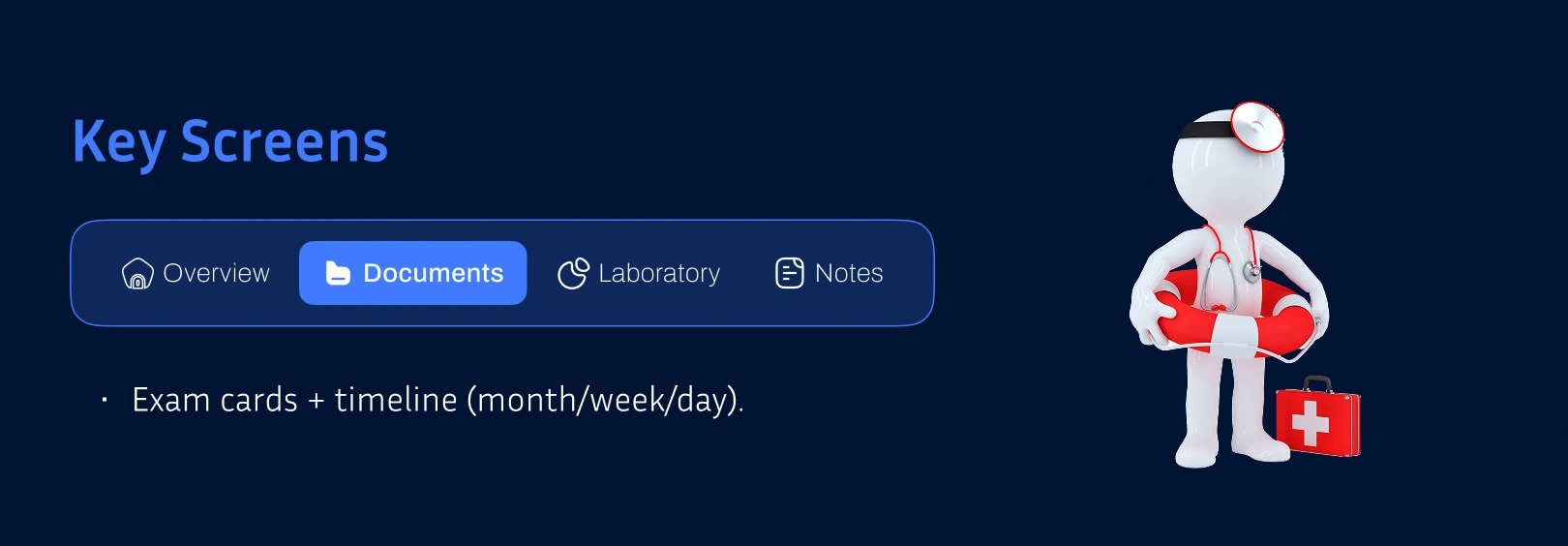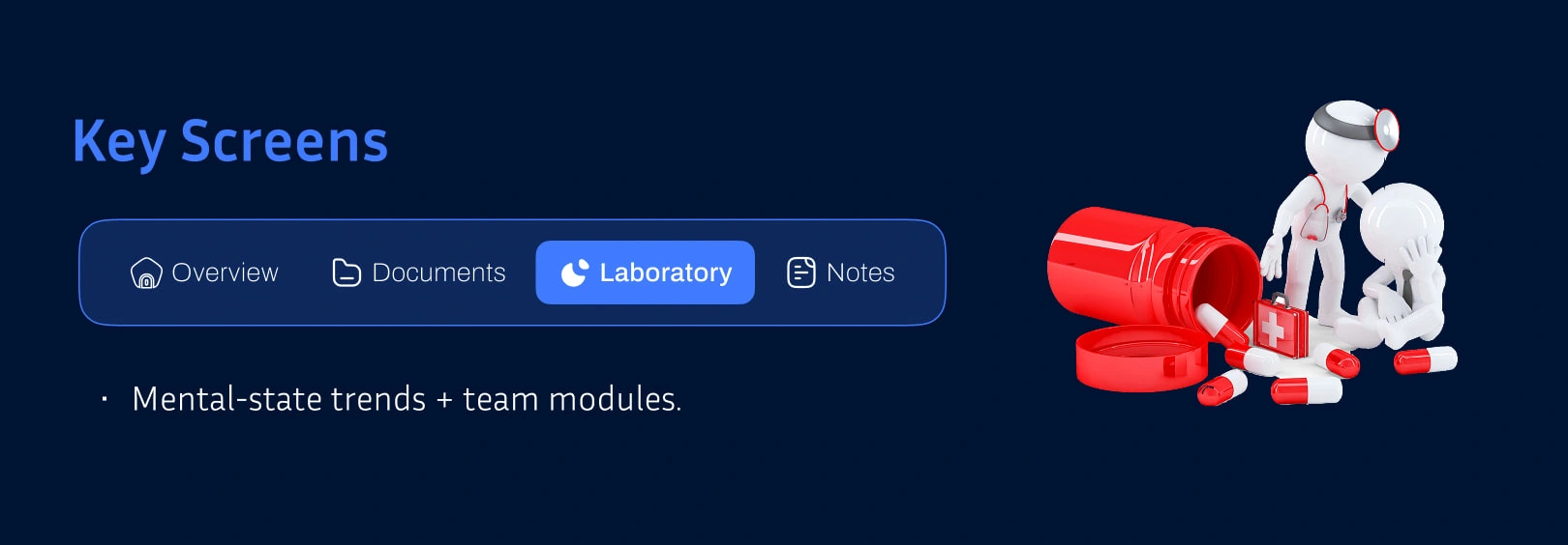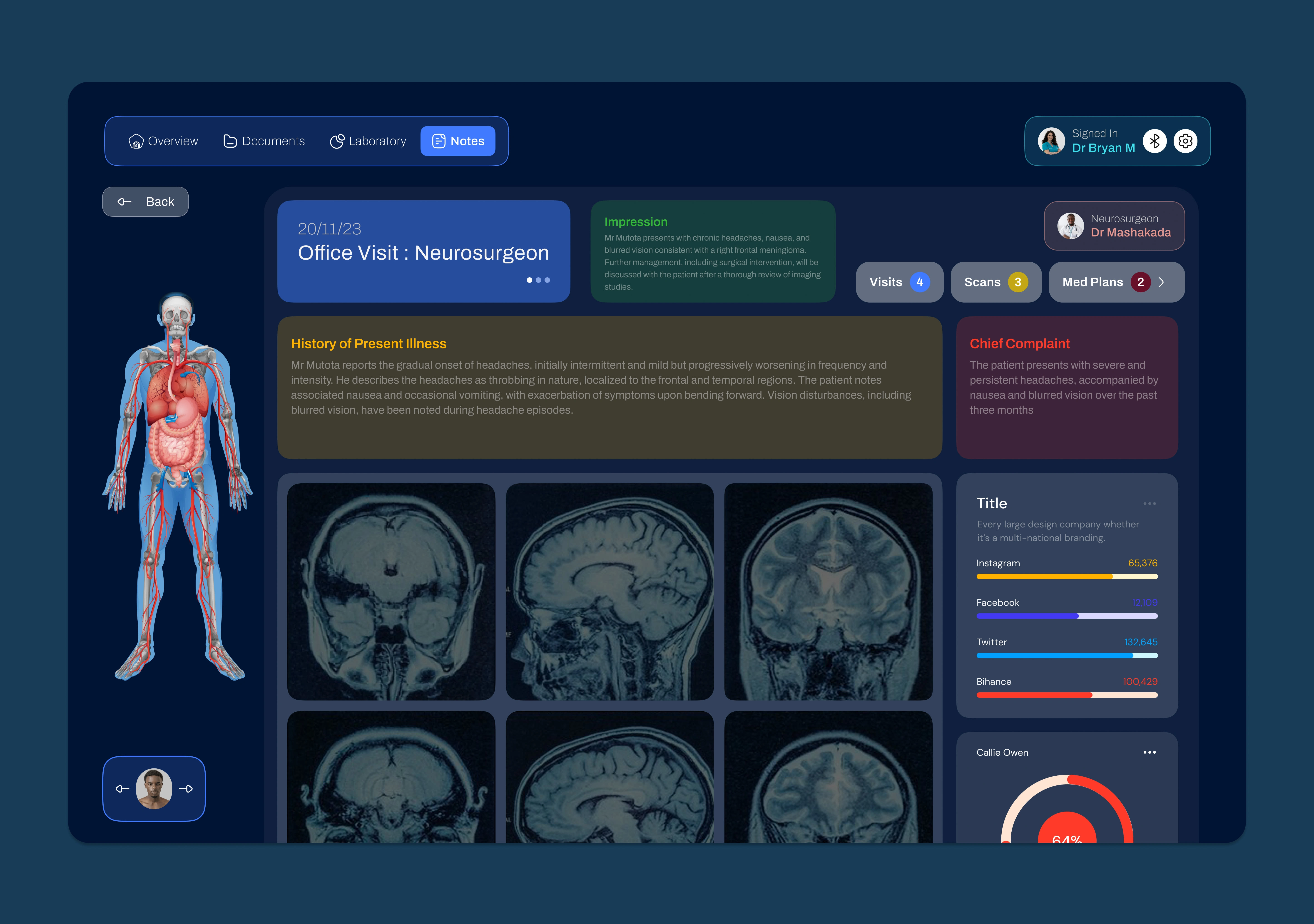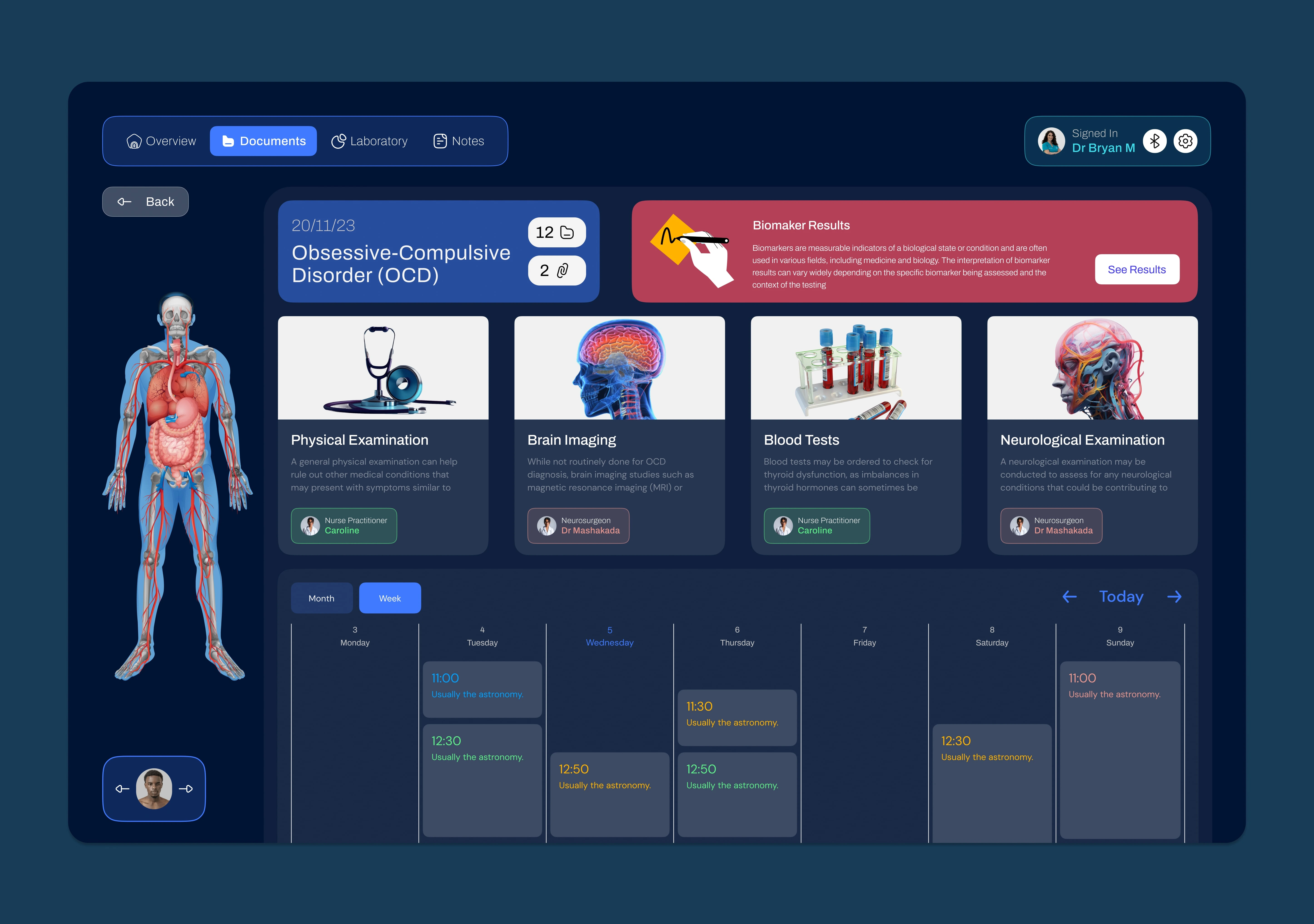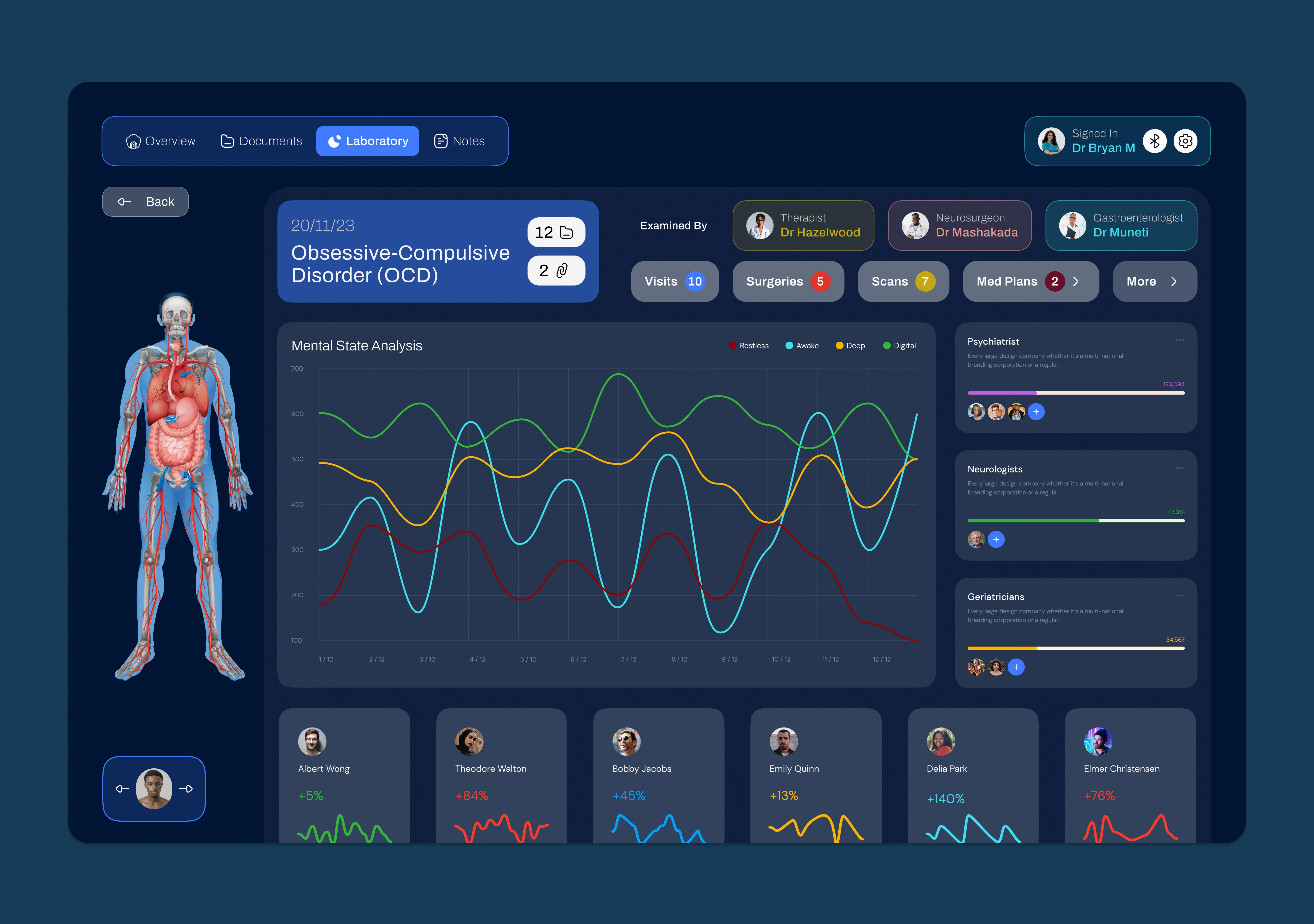 I designed a dark-themed control dashboard that maps live IoT vitals to a spatial body model.