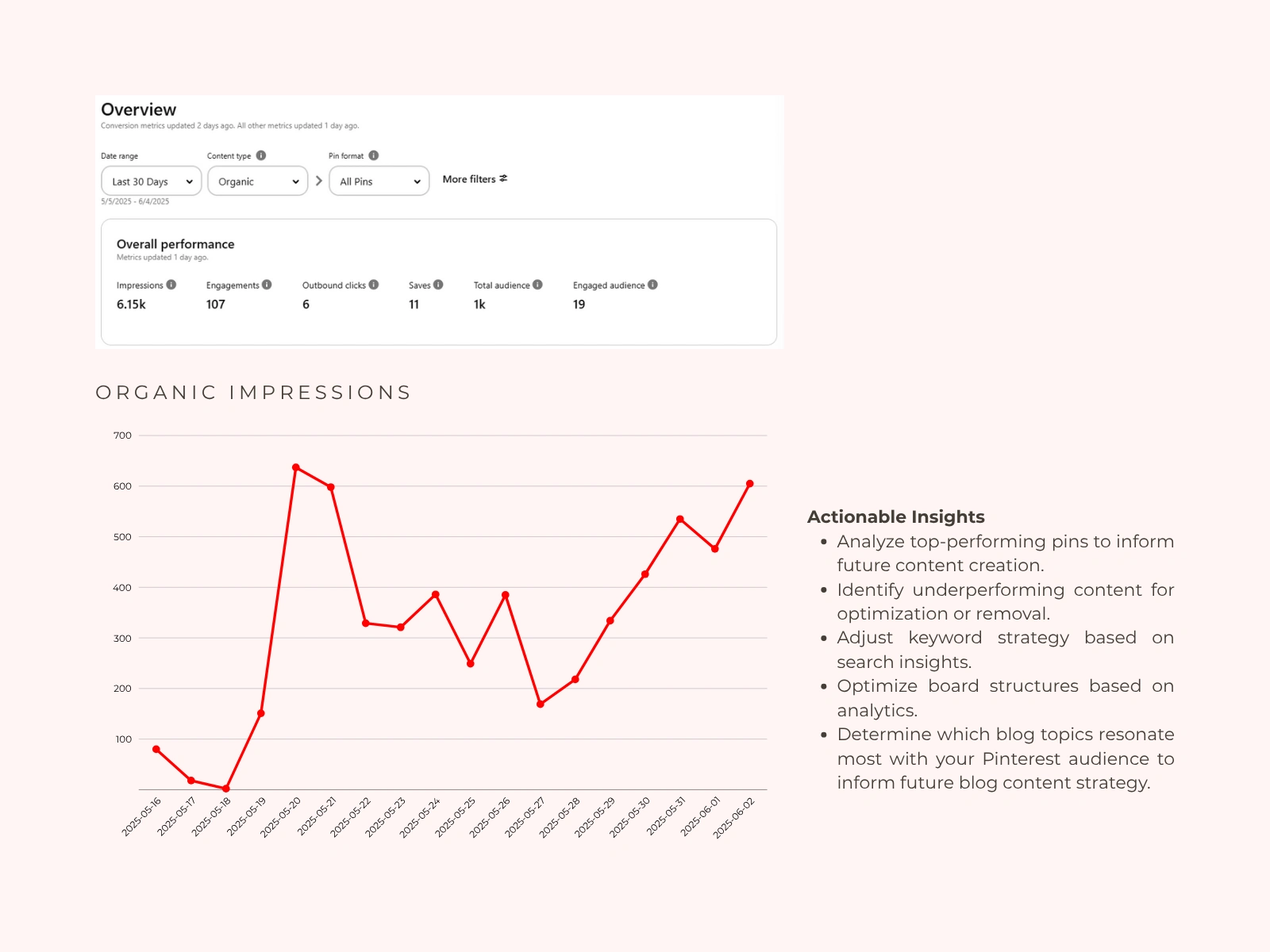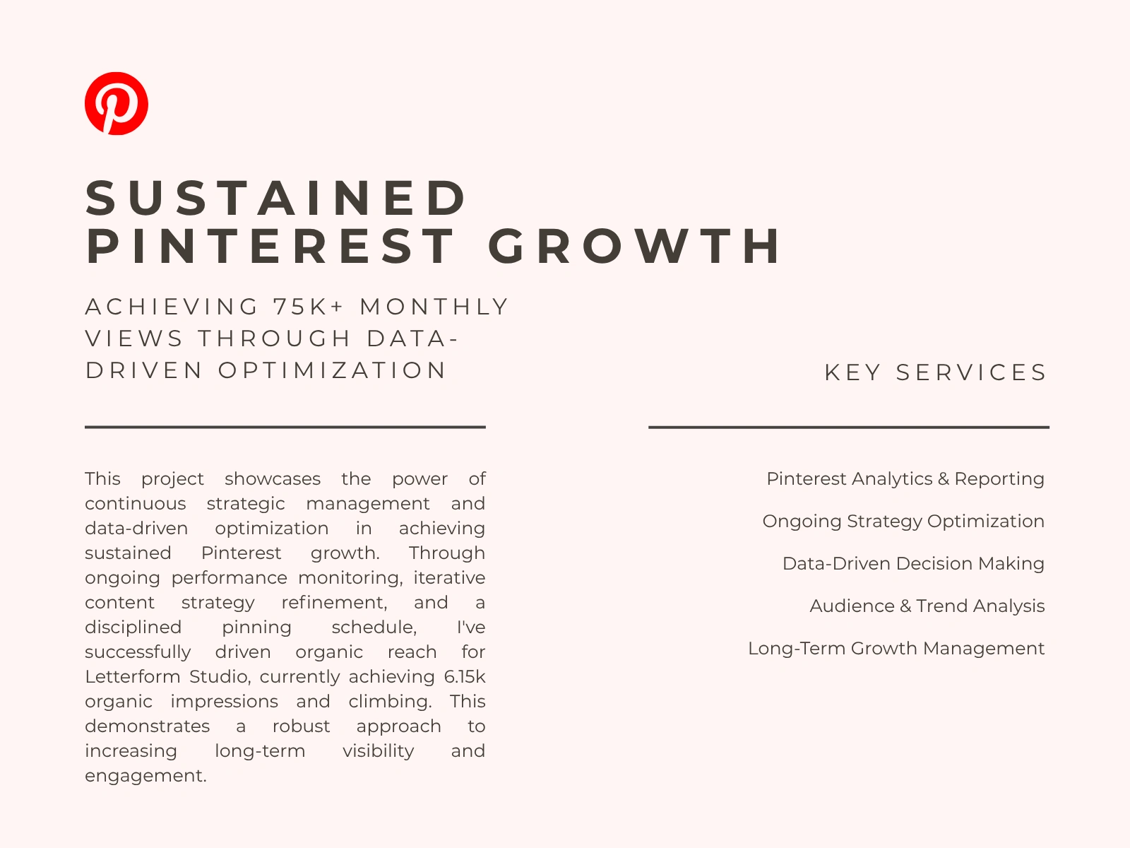 I drove 6.15k organic Pinterest impressions in the first two weeks (and climbing) for Letterform Studio through strategic management and optimization.