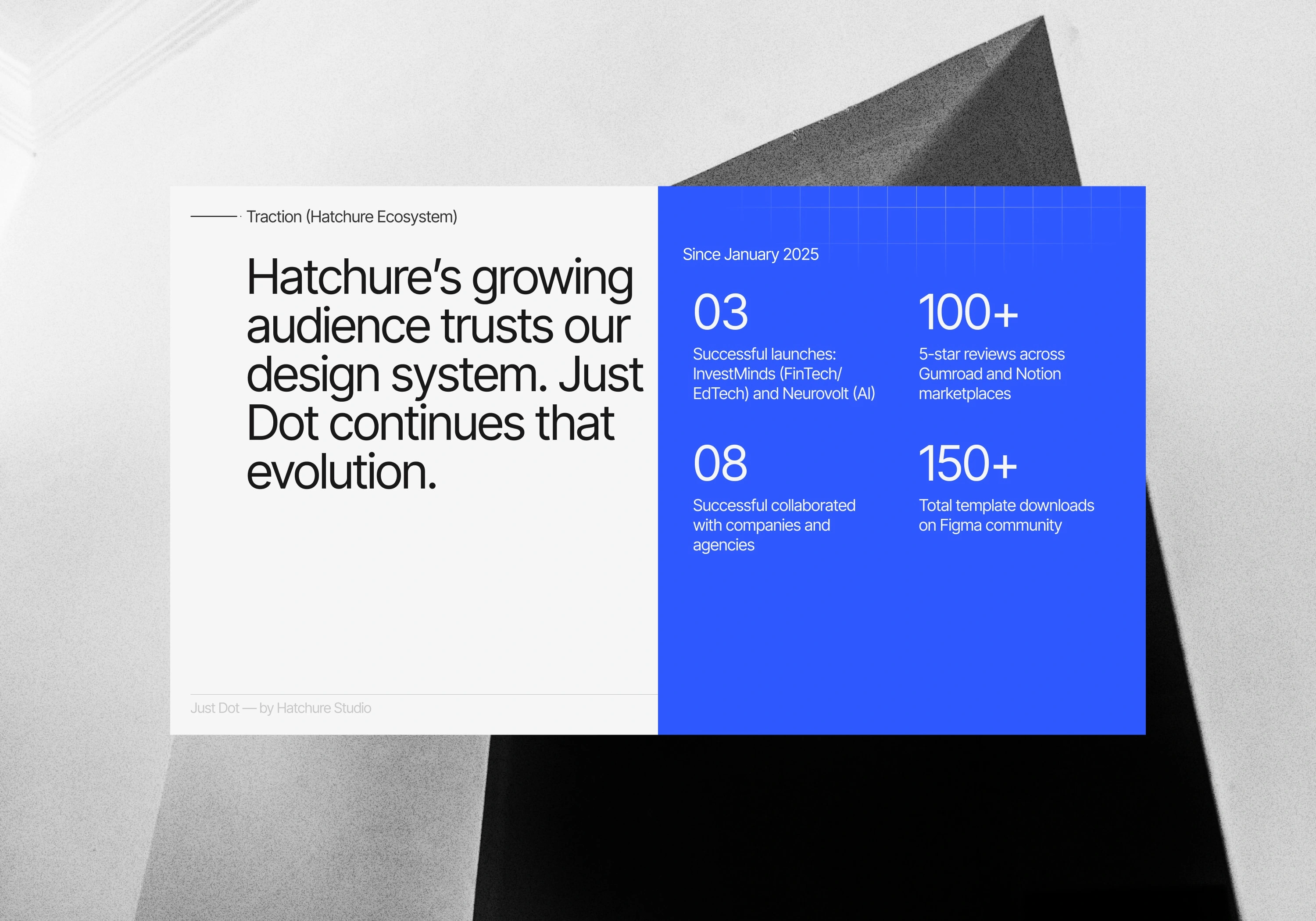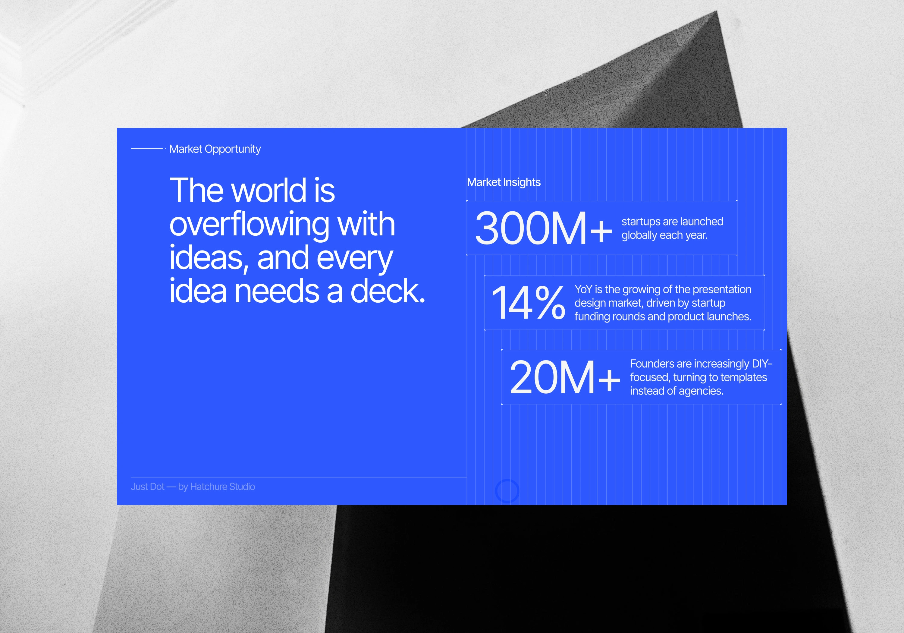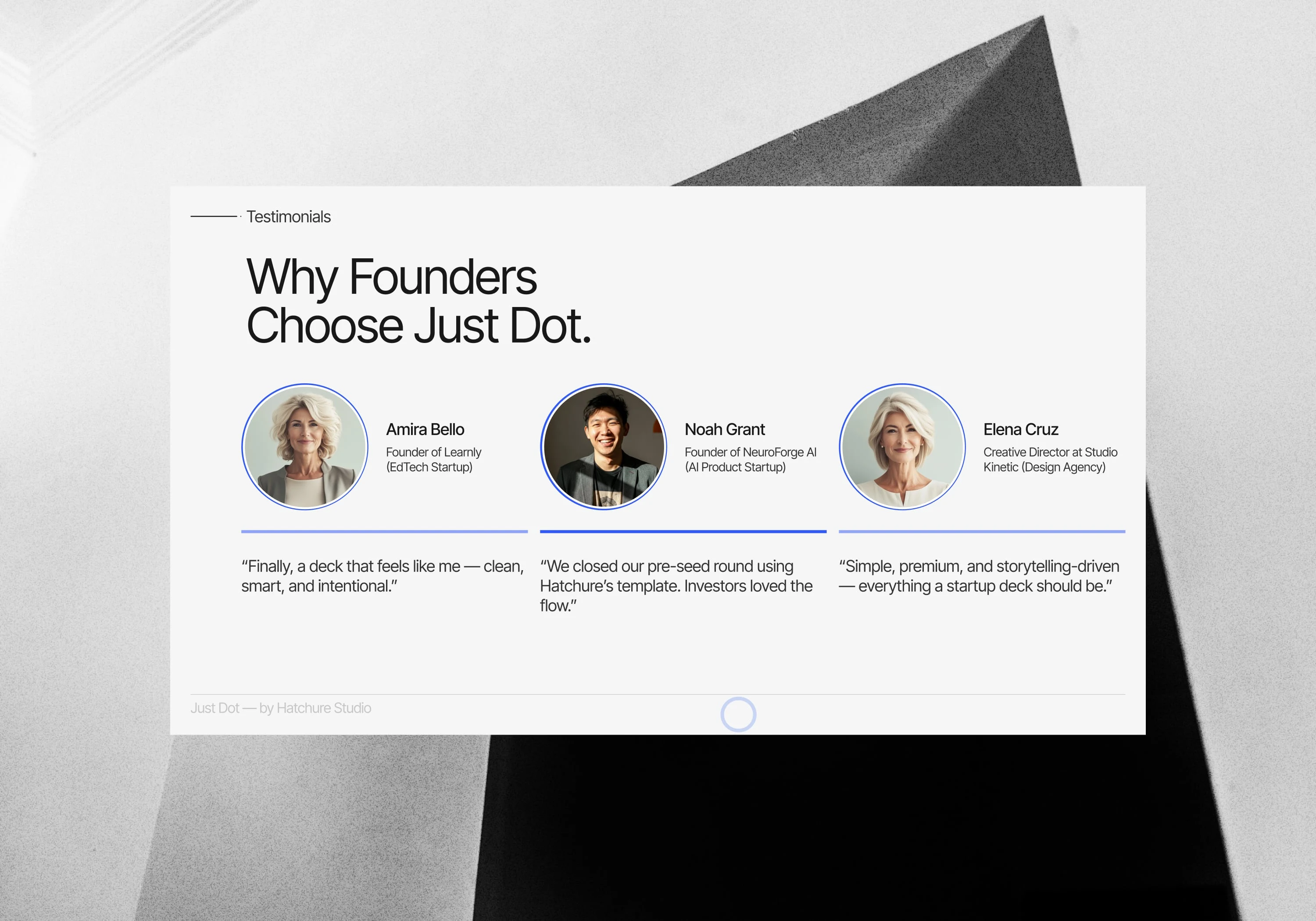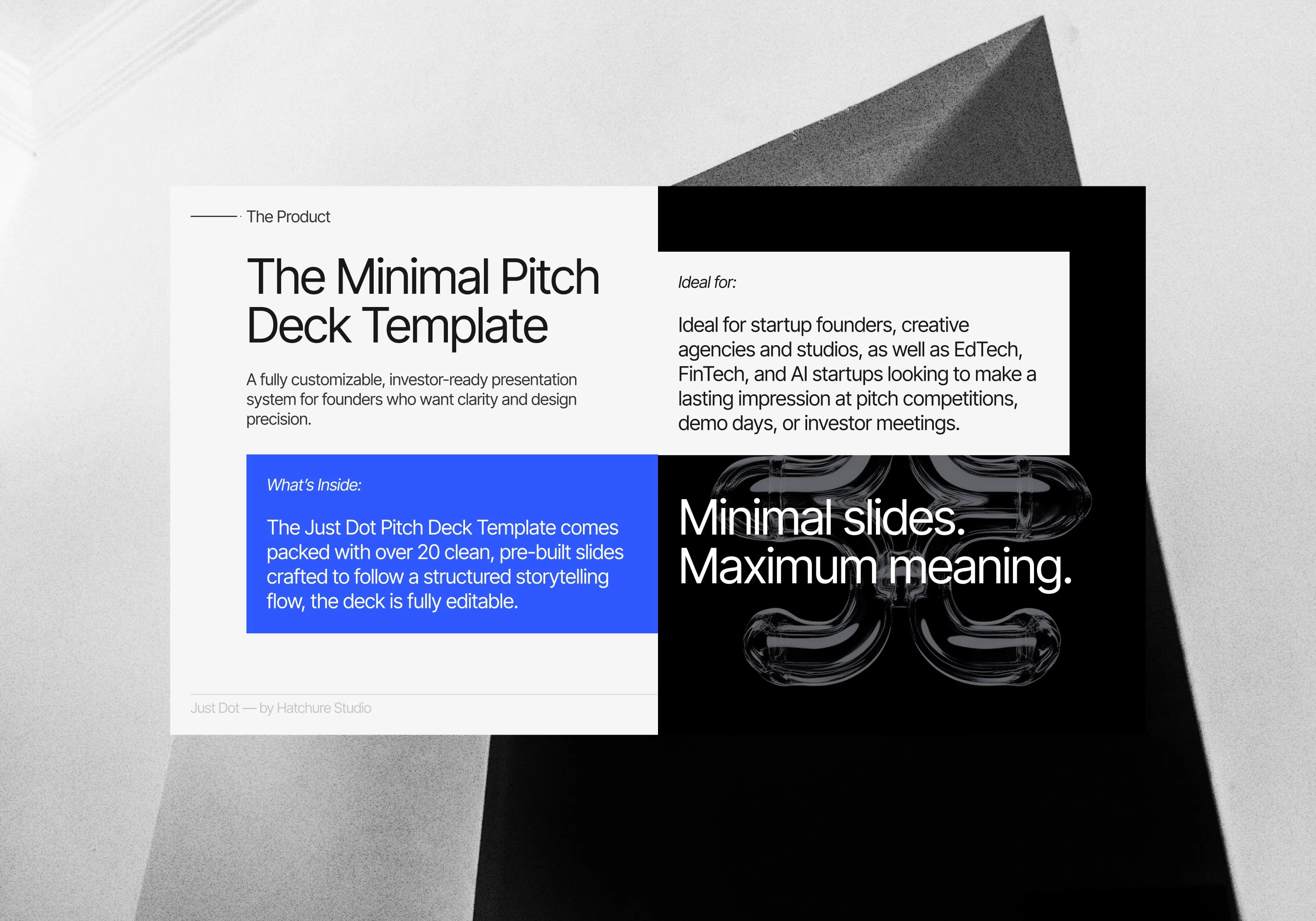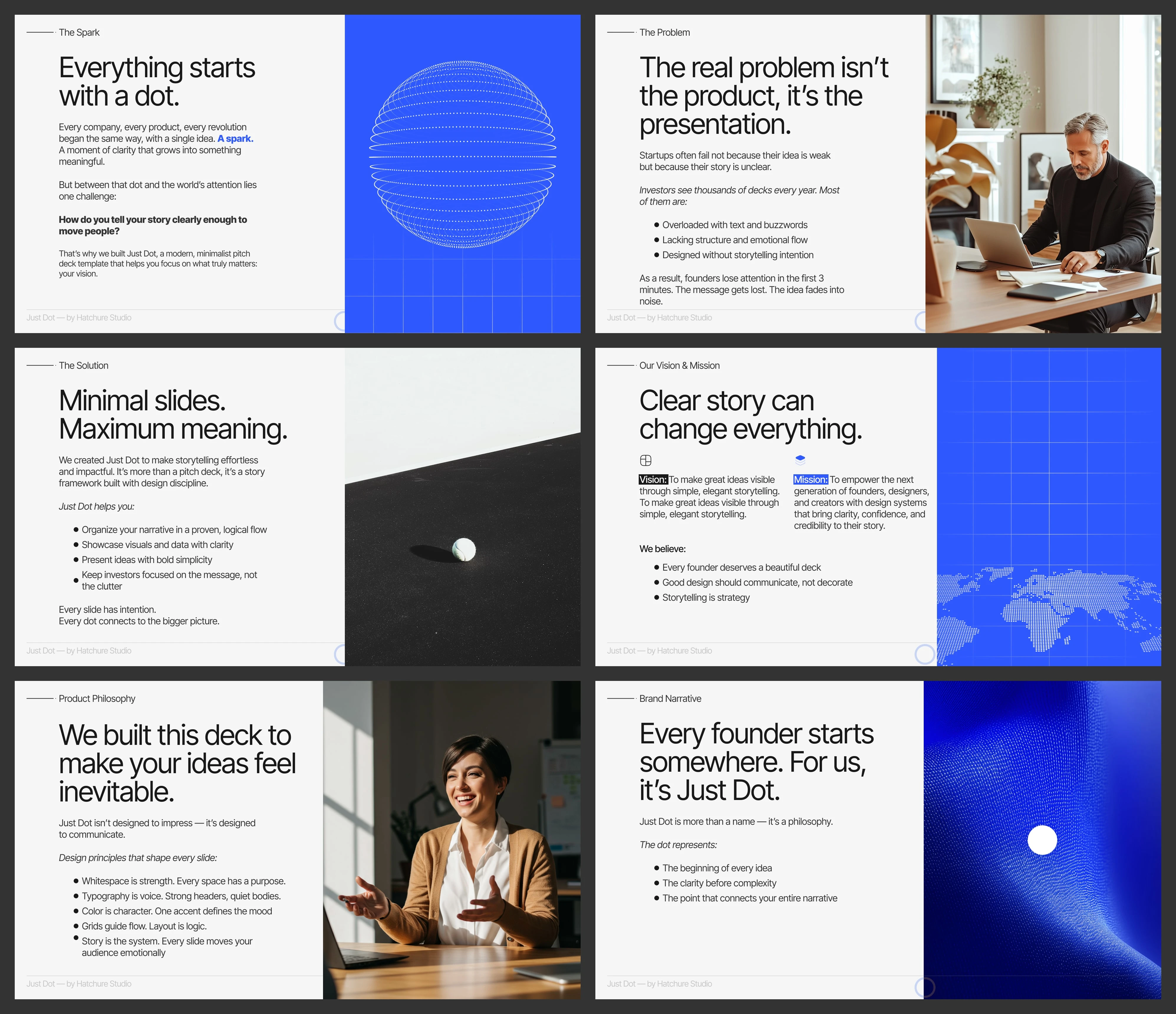 Built by Hatchure Studio, creators of the InvestMinds and Neurovolt pitch deck templates, Just Dot focuses on modern design, readable typography, and emotional storytelling that investors remember.