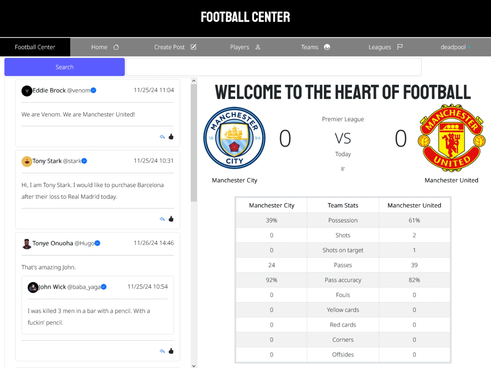 Football Center is a web app built with the Django web framework that allows users to catch up on their favorite teams and simulated matches.