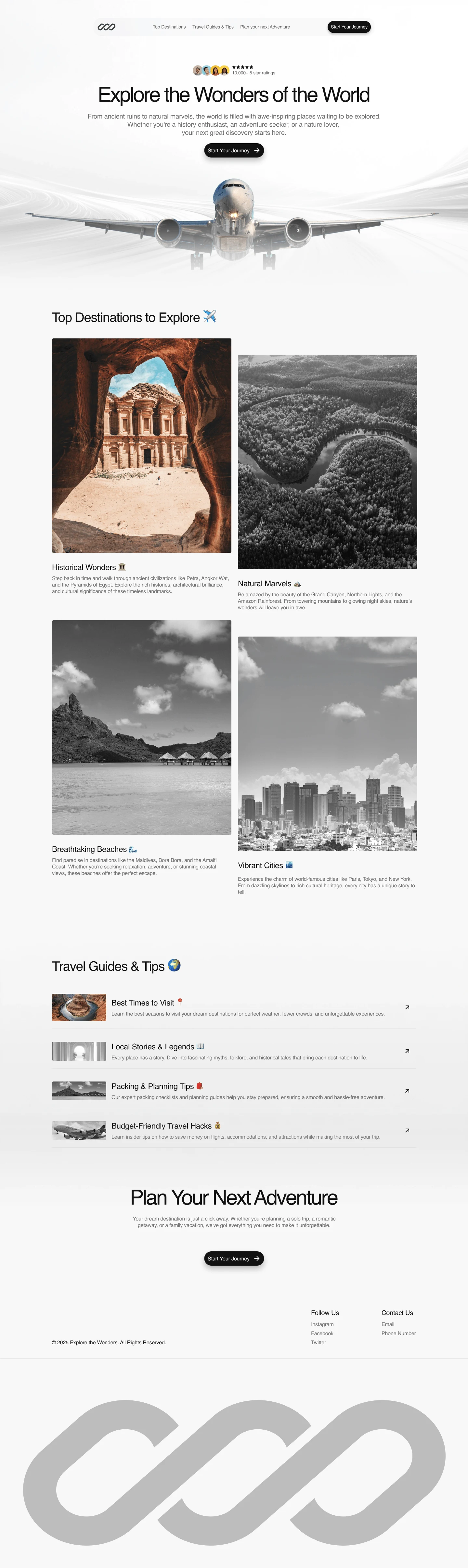 The final design delivers a visually immersive and easy-to-navigate platform that invites users to explore the wonders of the world. The homepage introduces four major destination types: Historical Wonders, Natural Marvels, Breathtaking Beaches, and Vibrant Cities. Each section is accompanied by short, engaging descriptions. Below, the travel guides section provides valuable information, including best times to visit, planning tips, budget hacks, and local stories. The call to action—“Start Your Journey”—is strategically placed throughout to drive engagement.