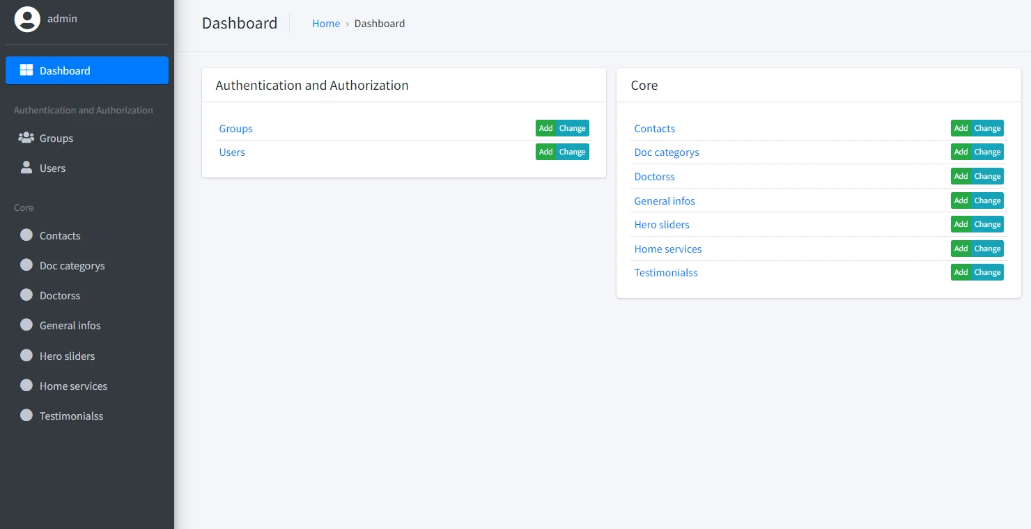 This medical template is a premium Themeforest template with a license to use. Boosting the design of the site with a premium template level up the site's impression to normal people. Apart from the design side, We used the Django framework on the backend side which is a Backend web development framework. (Django is a free and open-source, Python-based web framework that runs on a web server. It follows the model–template–views architectural pattern.)