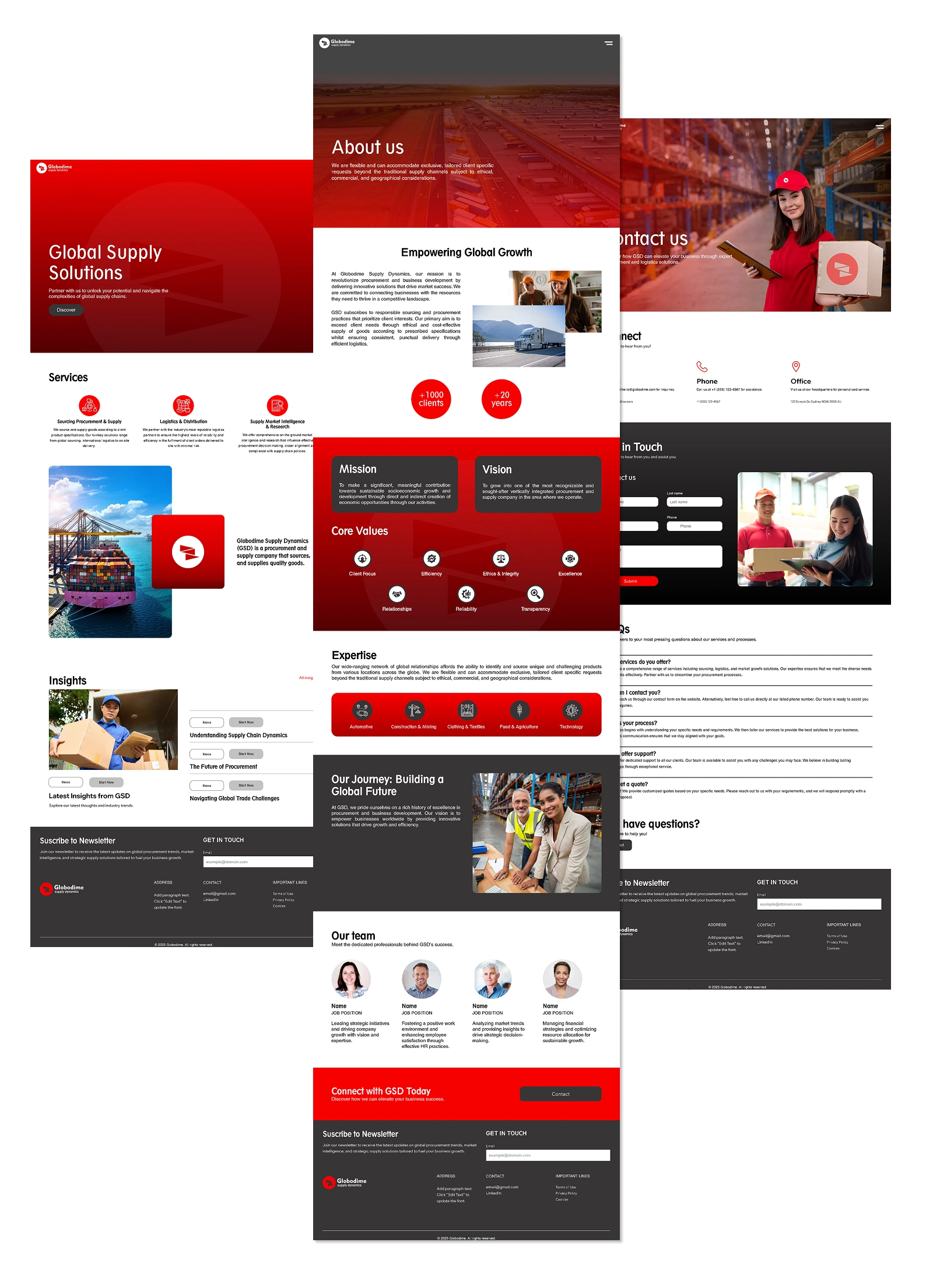 This project is a professional and comprehensive corporate website for Global Supply Dynamics, a company in global supply chain solutions. The design is modern and clean, utilizing a strong and dynamic color palette of bold red, clean white, and professional dark gray. The layout is user-centric, ensuring easy navigation to key sections such as Services, About Us, Insights, and Contact.