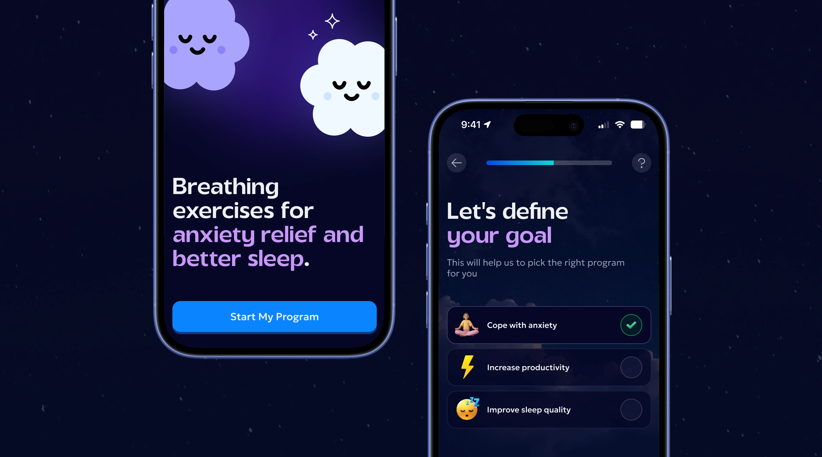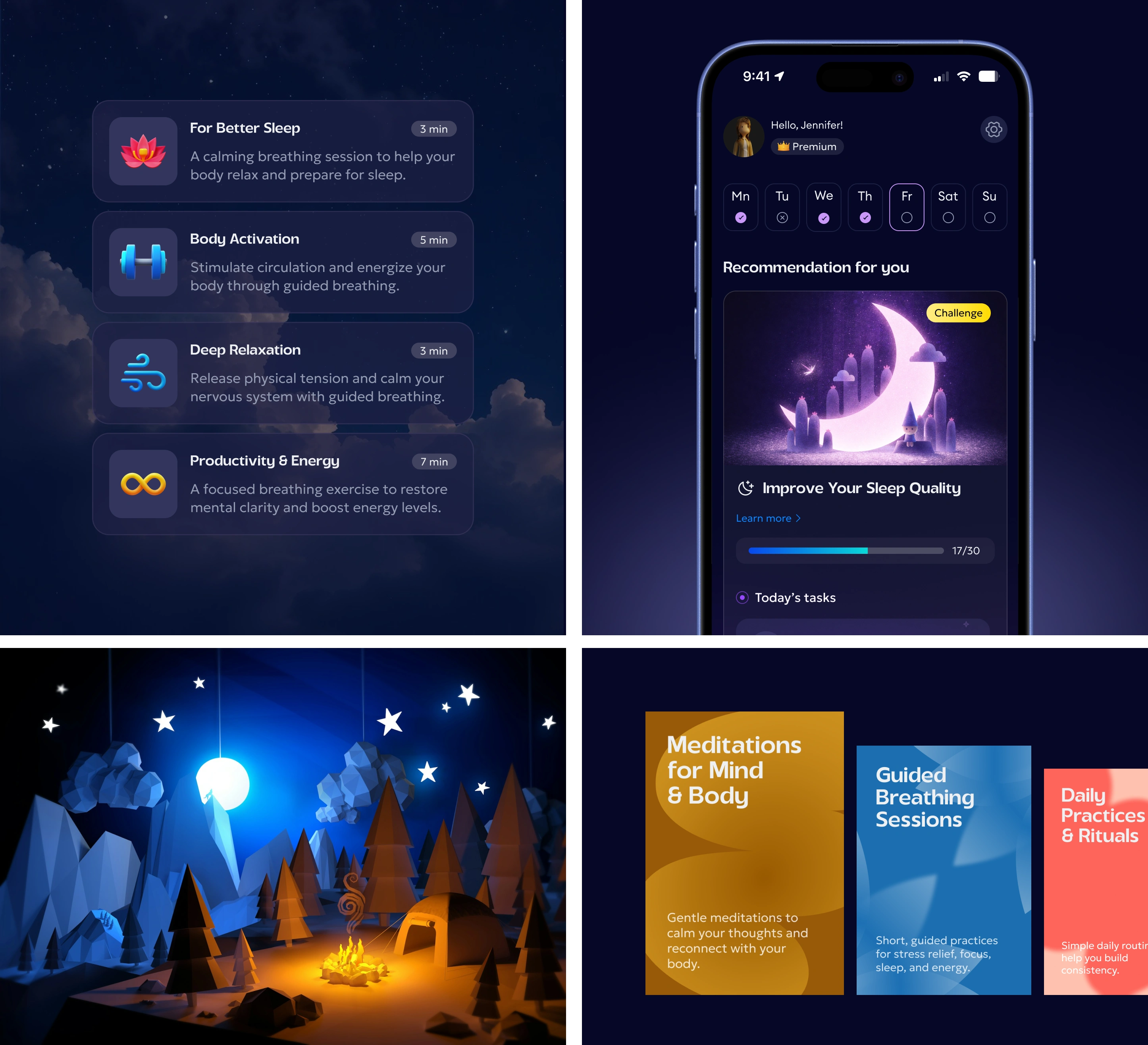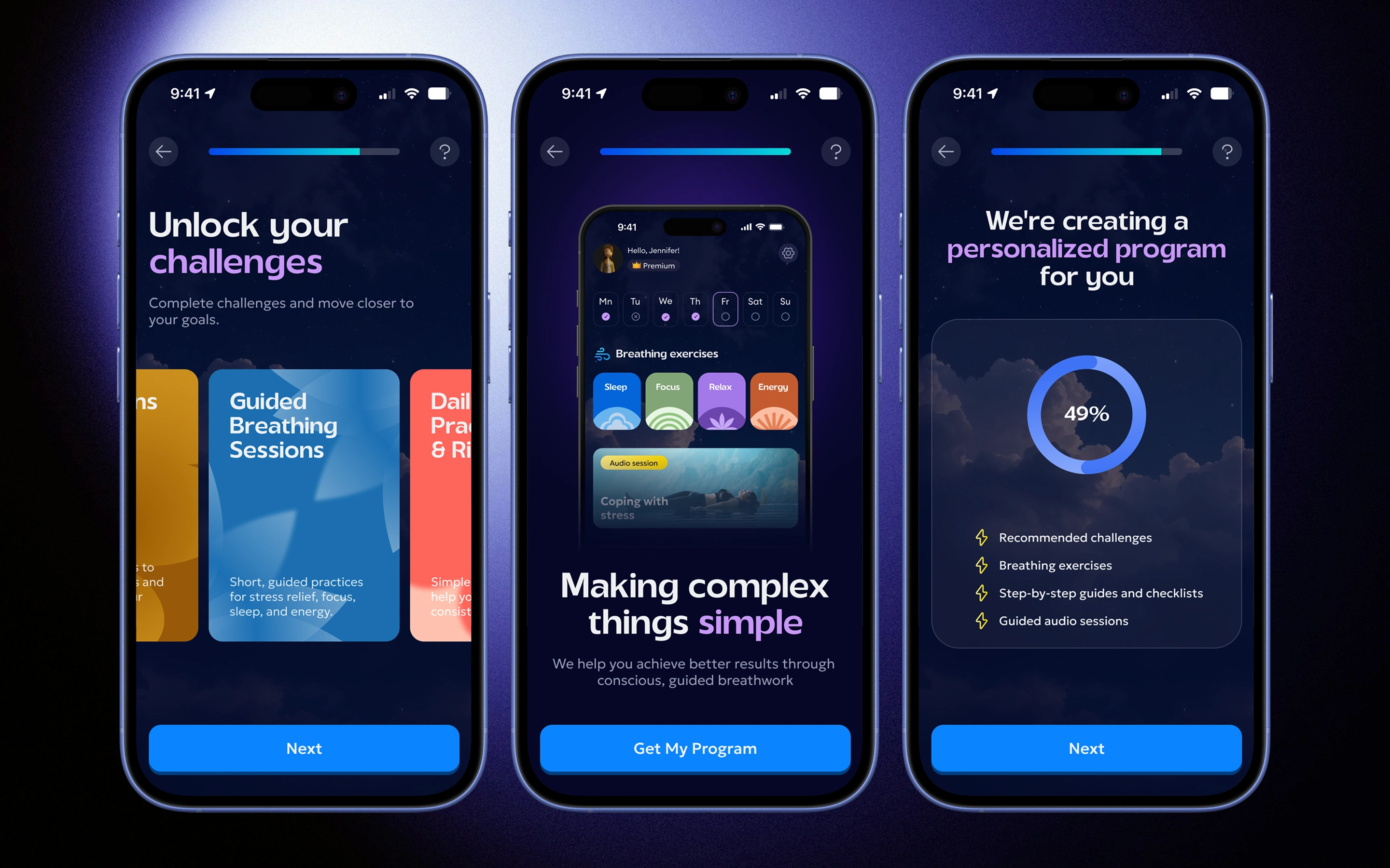A personalized breathwork and mindfulness mobile app — built around goals, not sessions. Beyond breathing practices, the app offered structured courses on focus under pressure, sleep improvement, and productivity. From the moment onboarding ended, the experience was fully tailored to each user's needs and goals, kept alive through daily tasks, challenges, badges, and progress mechanics.