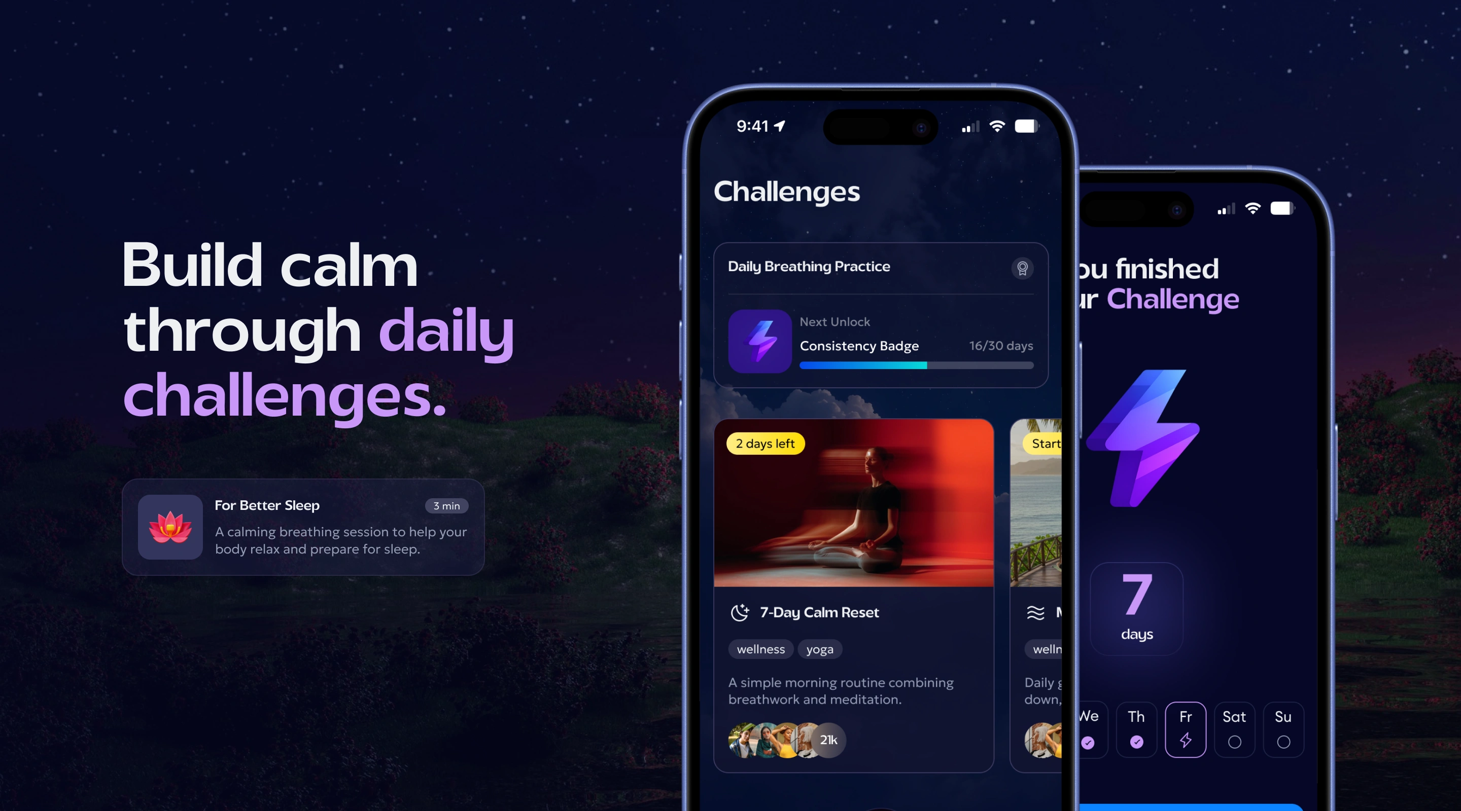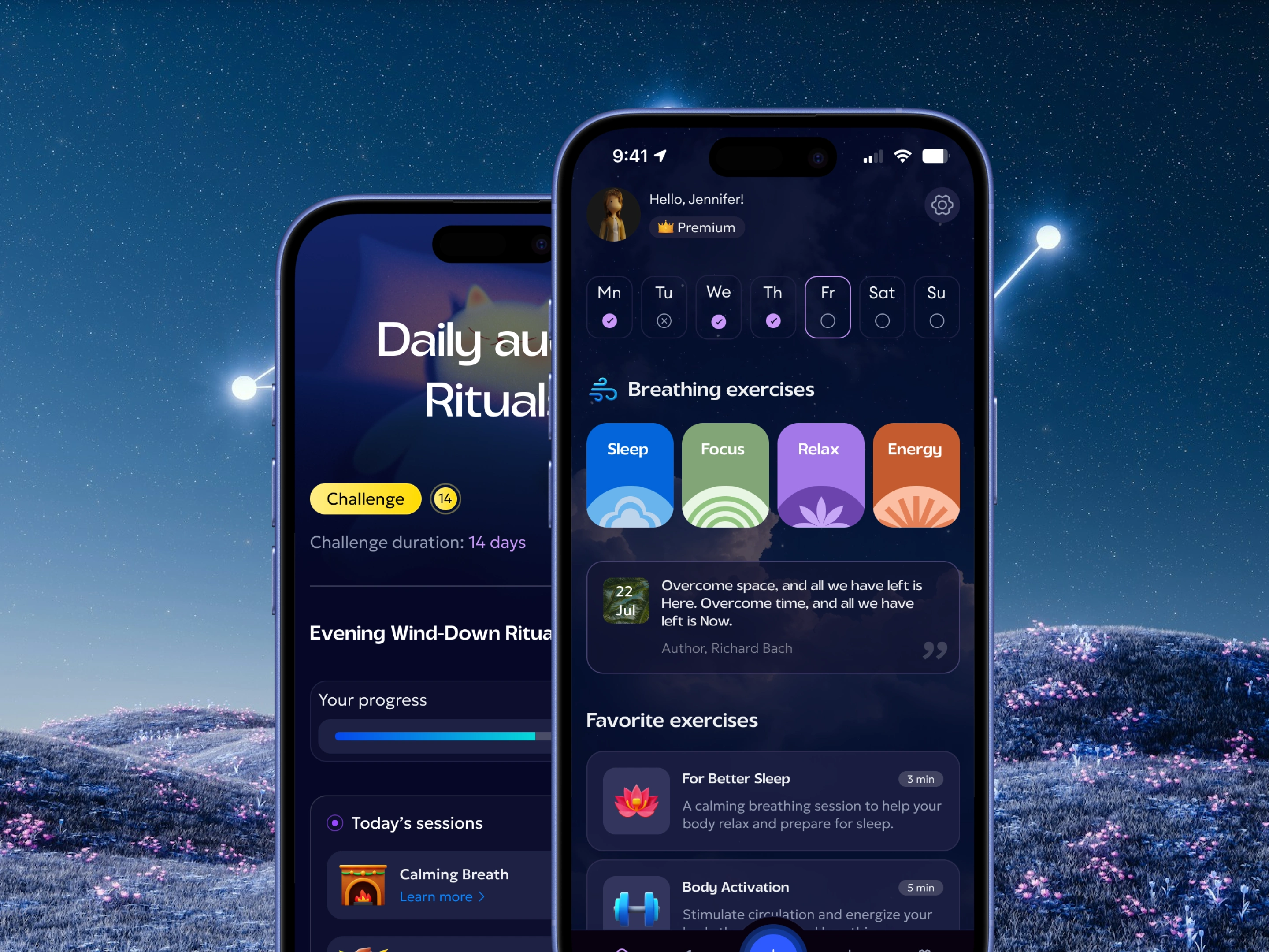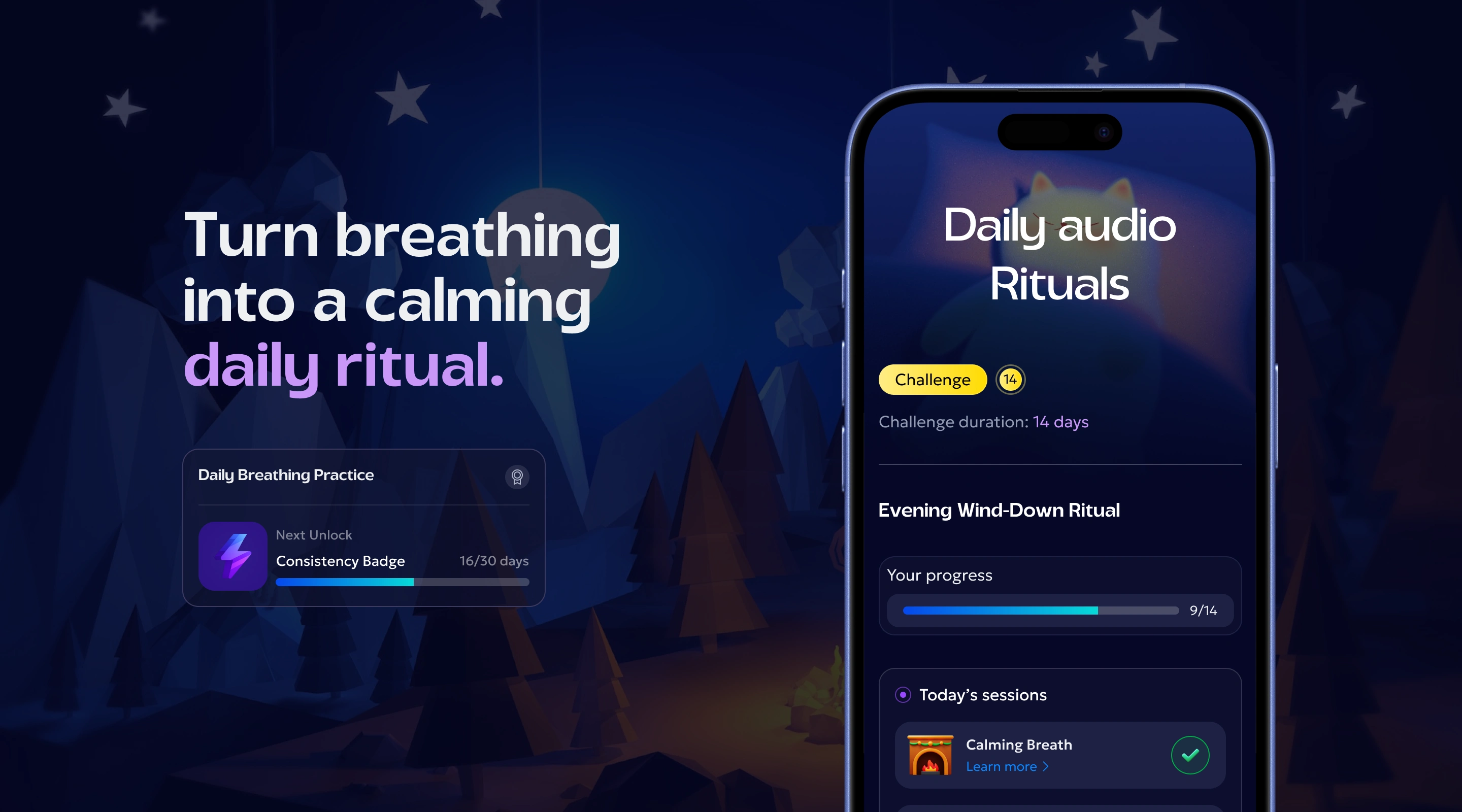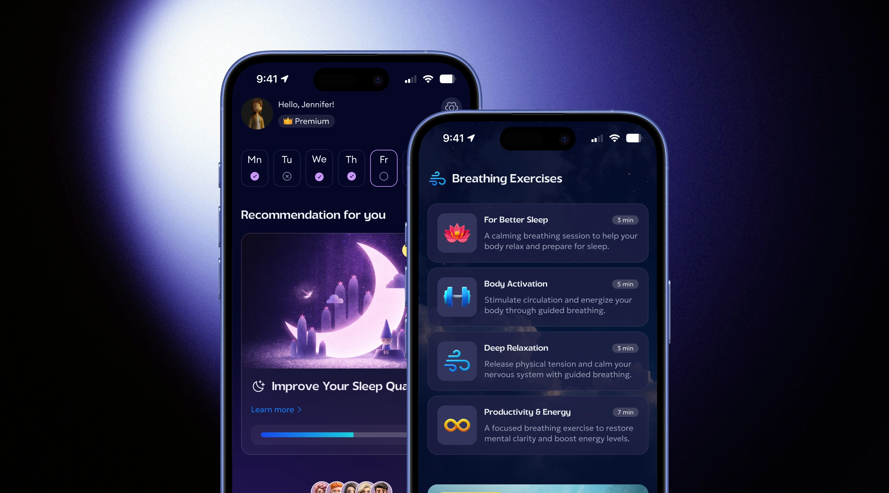 A personalized breathwork and mindfulness mobile app — built around goals, not sessions. Beyond breathing practices, the app offered structured courses on focus under pressure, sleep improvement, and productivity. From the moment onboarding ended, the experience was fully tailored to each user's needs and goals, kept alive through daily tasks, challenges, badges, and progress mechanics.